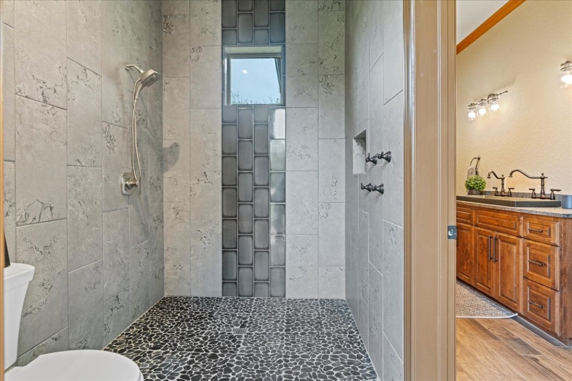 Outstanding Gentlemen's ranch in the Texas Hill Country between Wimberley and San Marcos. This 42 acre Ag Exempt ranch is frequented by a herd of Longhorn cattle via open grazing agreement as well as wild turkeys. With over 6400 square foot of living space there is room for every activity. The first floor has an open living/kitchen/dining area with expansive ceilings and and large windows and glass doors that fill the space with natural light. The kitchen was built with entertainment in mind. The two large islands lend themselves to a well thought through preparation and serving area. The pantry with built in commercial refrigerator/freezer is the space that most only dream about. Across the back of the kitche/living space is a 13 x 55 screened porch and outdoor kitchen with plenty of room to host friends and family. There is also access to a full bathroom adjacent to the outdoor kitchen. The Primary Suite is unique in many ways. Beyond the large closet, bath and bedroom is a dedicated second floor with 2 large rooms that can serve as a private living room, office, hobby or trophy room. The bedroom and upstairs living area both have nice views of the ranch. The first floor is also home to a guest bedroom with an on-suite bath. On the opposite end of the house is a second floor that has three suites with dedicated bathrooms and large closets. They also share an 18 x 32 space that could be used as a home theater or family room. The 1200 square foot garage with attached mudroom has ample space for several vehicles as well as storage space. If you like to spend time outdoors there is plenty of room to roam on the 42 acres. Beautiful trees and views of the hill country make this an exceptional property. Don't forget to drop by the chicken coop and watch the hens at work. You might just cross paths with a flock of wild turkeys on your walk. There is an additional contiguous 20 acres available that can be accessed on Hugo Rd or through the ranch.