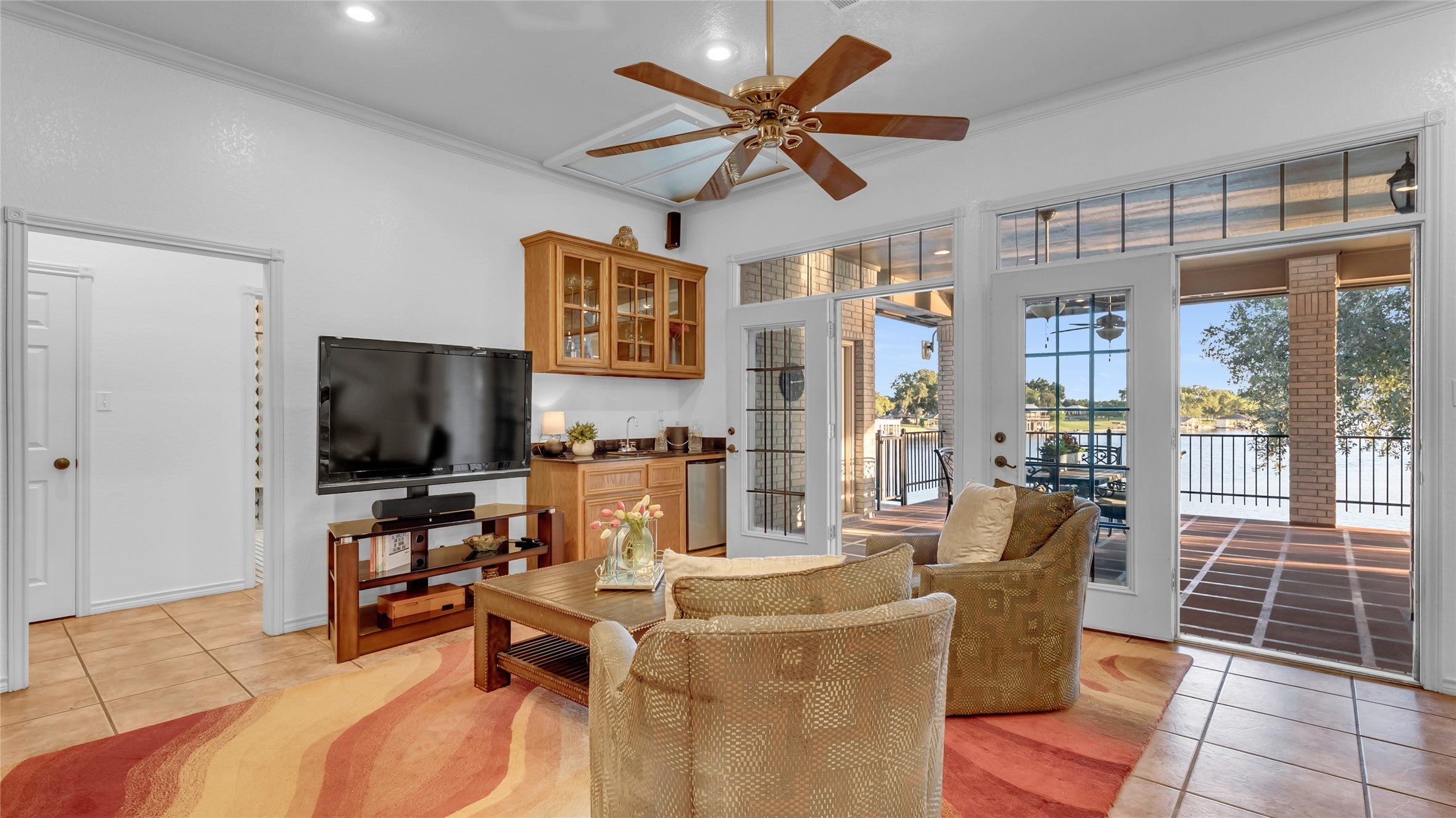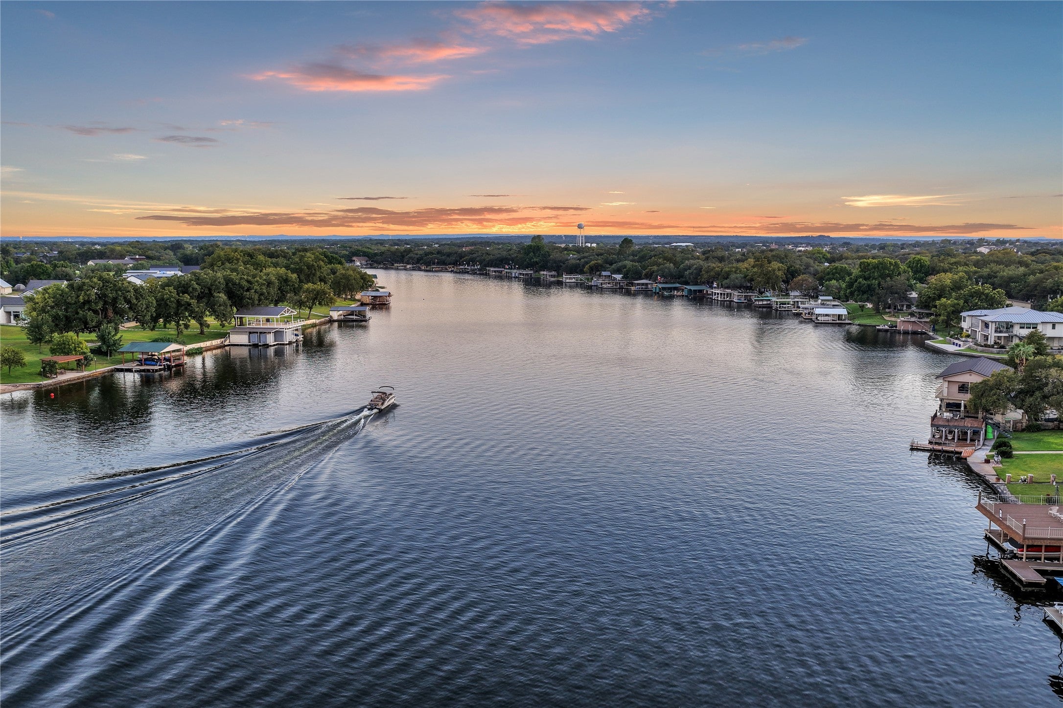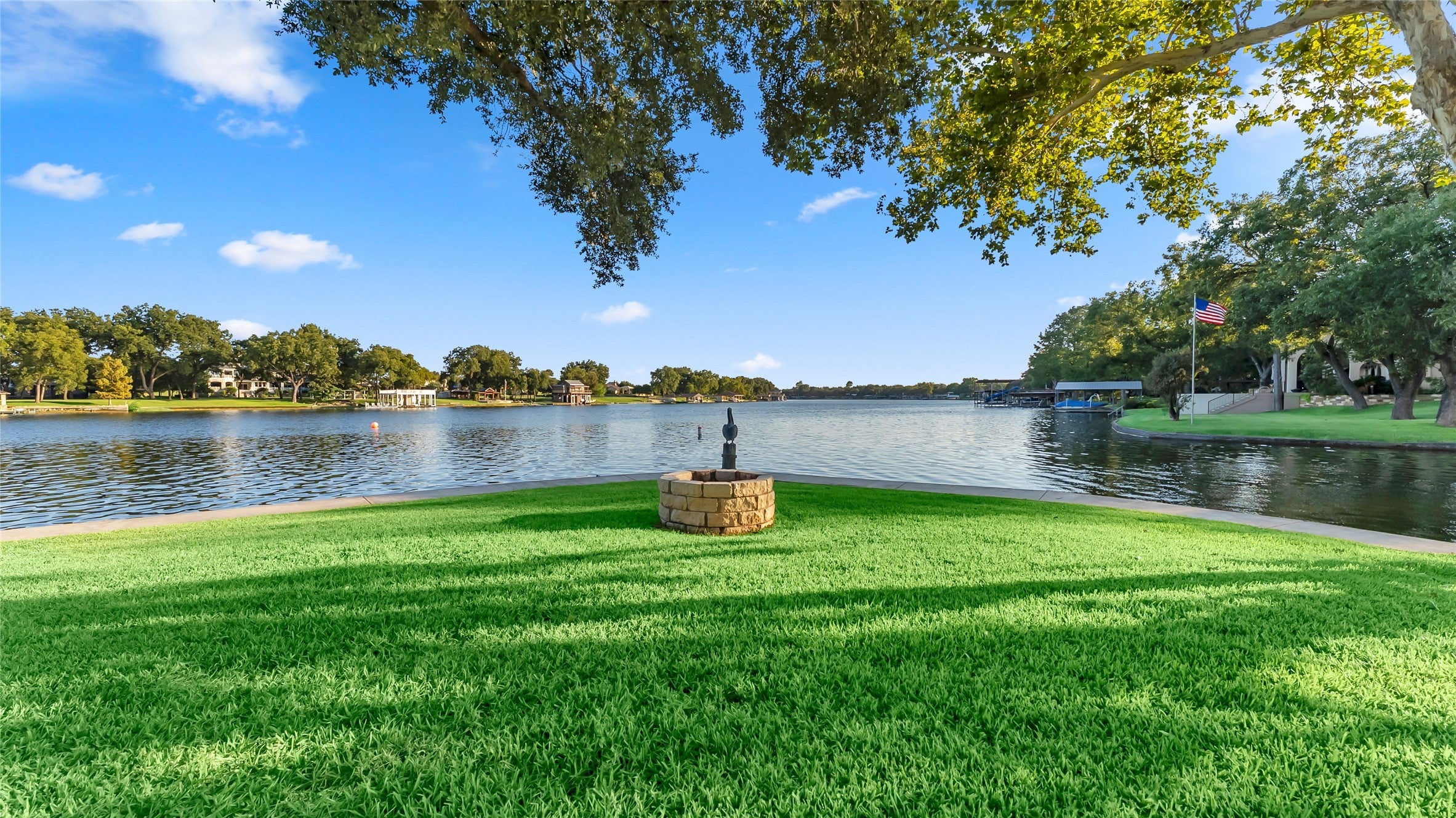 Experience lake living at its best in this exceptional waterfront home situated on a peninsula with dual boat docks—one with boat and jet ski slips and another designed for entertaining while enjoying sunset views—this property is perfect for both relaxation and recreation. Outdoor amenities include a hot tub, tree swing for lake jumps, outdoor shower, firepit, and multiple covered patio & sitting areas. A gated entry leads to the home’s grand black iron and glass double doors opening to an impressive entryway. The interior offers a spacious living area with built-ins, wet bar, and double-sided fireplace, plus two dining areas and a custom wine room with built-in cabinets and wine racks. The gourmet kitchen features glass cabinets, granite countertops, a large island and extensive breakfast bar. The master suite includes a sitting area with wood burning fireplace, a newly remodeled bath and a large walk in closet. Bonus access to covered patio to enjoy sunsets with a cocktail. Downstairs includes a game room with bar, second living area, bedroom and full bath, plus a tool or craft room. Additional highlights include an elevator, RV storage in garage, and a dock storage room for lake toys! This home blends luxury, functionality, and lakefront charm—perfect for entertaining or peaceful waterfront living.