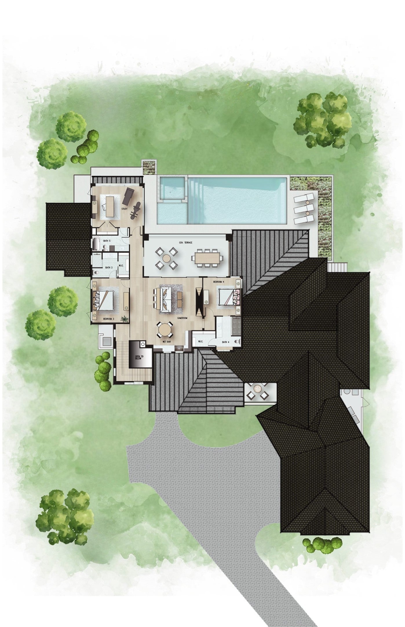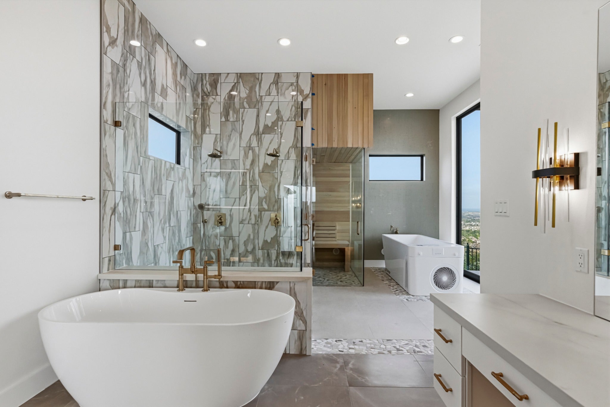 This meticulously designed residence offers an effortless blend of luxurious comfort and refined functionality. Designed for both relaxation and entertaining, this home features an expansive outdoor living area with a pool, spa, beach patio, and a fully equipped summer kitchen, all seamlessly connected to a covered porch. At the heart of the home, the spacious kitchen is both stylish and functional, featuring a large island, wet bar, and generous dining areas that flow effortlessly into the living space. The primary suite offers a private retreat with its own terrace, a cold plunge, and a rejuvenating sauna. Upstairs, the game room extends onto a covered terrace, where sweeping views of the outdoor oasis create the perfect setting to unwind. A serene courtyard ties the home together, enhancing its natural flow and inviting ambiance. A spacious three-car garage completes this thoughtfully designed residence, balancing luxury and everyday convenience.