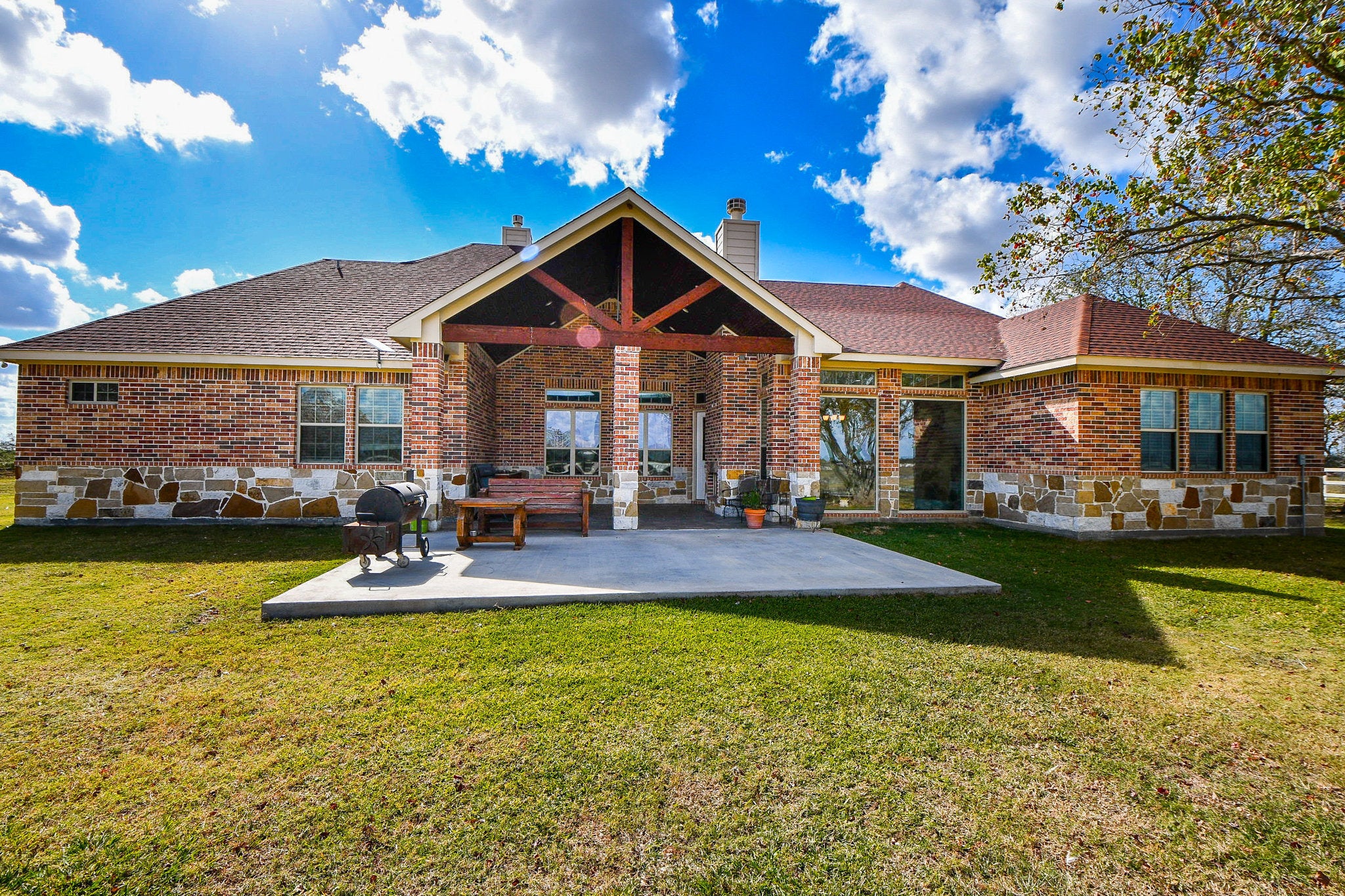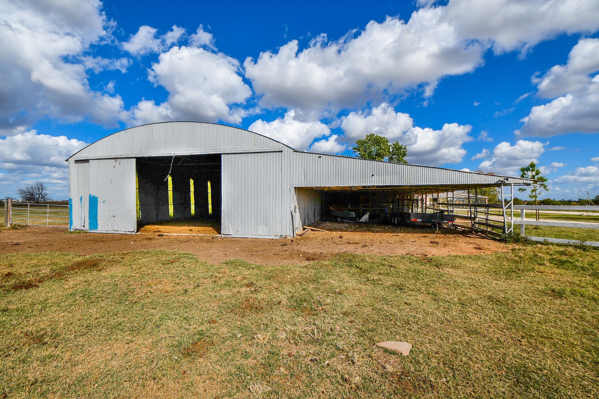 16.135 Acres, 2022 meticulously maintained modern, 4,129 sf residence with gated entrance, two very large, galvanized steel framed out buildings and pond. Fully fenced and cross fenced with Ag validation by cattle. The 70 X 50 Bldg has electrical, abundant outlets, 2 – 20 ft doors, RV outlet, hoist, and houses solar panels that supply the electrical on the property. Low electrical bills. The 60X50 Bldg has dirt flooring and 20 ft doors. Multi use property. Home features: 6 BRs /4.5 BHs, high ceilings, crown molding, gas fireplace, granitic counters, kitchen island, pot filler, walk in pantry, open concept with large dining area, huge utility room, 3 Car garage, outdoor kitchen, wood burning fireplace, circle driveway, 2nd RV connect at house. 2nd floor has large 1 BR/BH, a great private workspace. Working pens for cattle. Stainless refrigerator, washer, dryer, hoist and propane tank to convey. Approx. 7 mi from IH 10 & Exit 169 /Bernardo Rd/FM 2761. Approx. 10 min to Columbus and 20 min to Sealy. Watch walk through video of residence. The listing price is supported by an appraisal dated August 21, 2025.