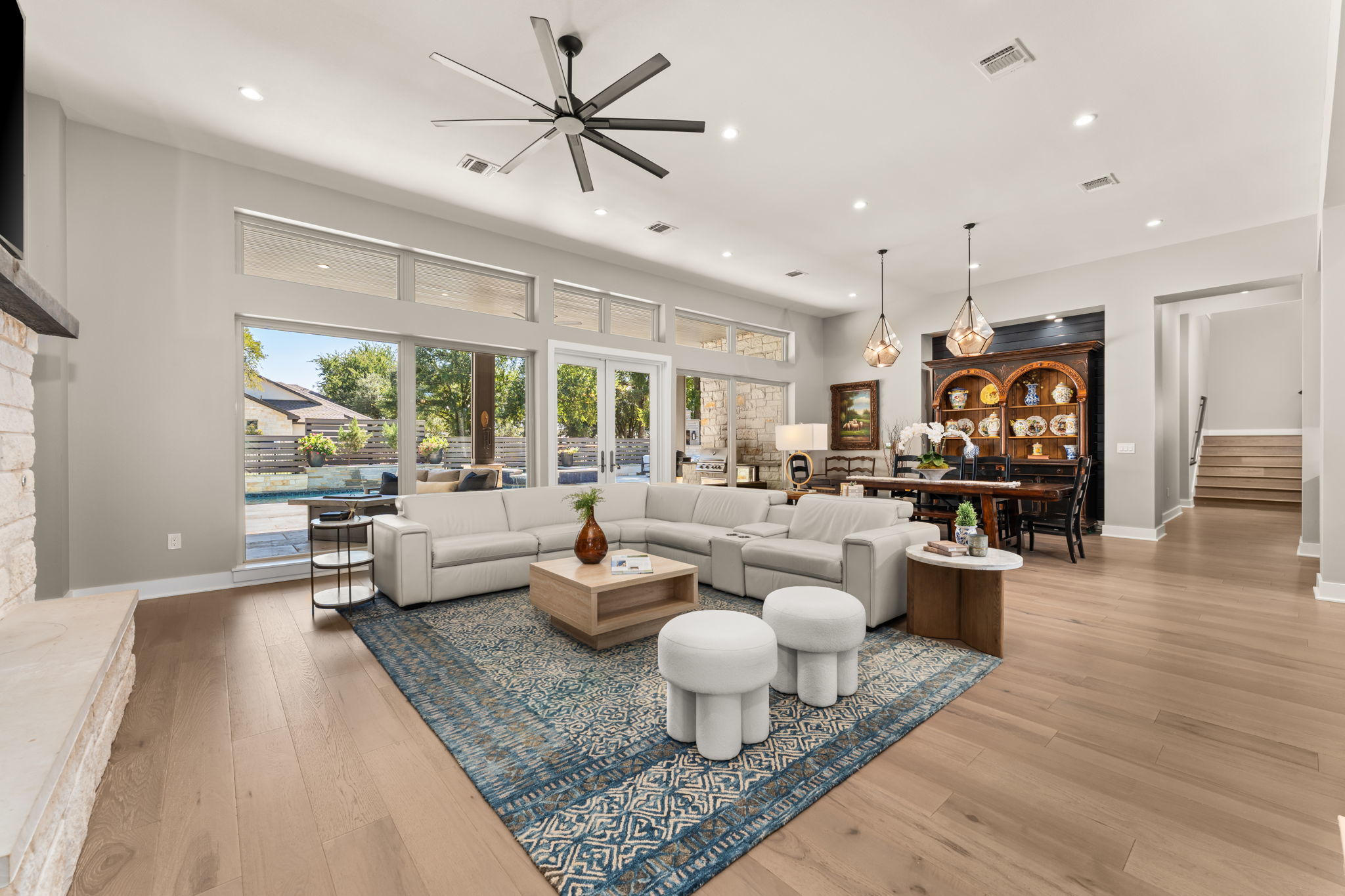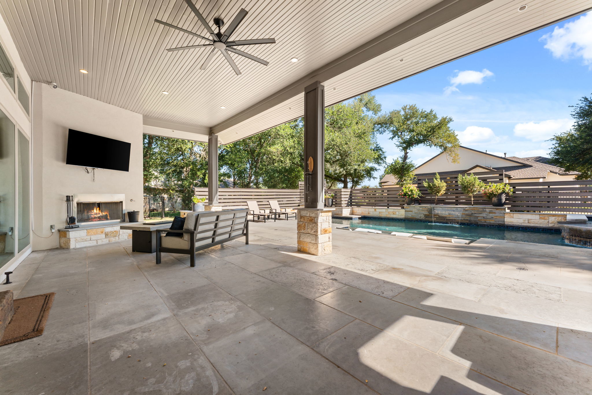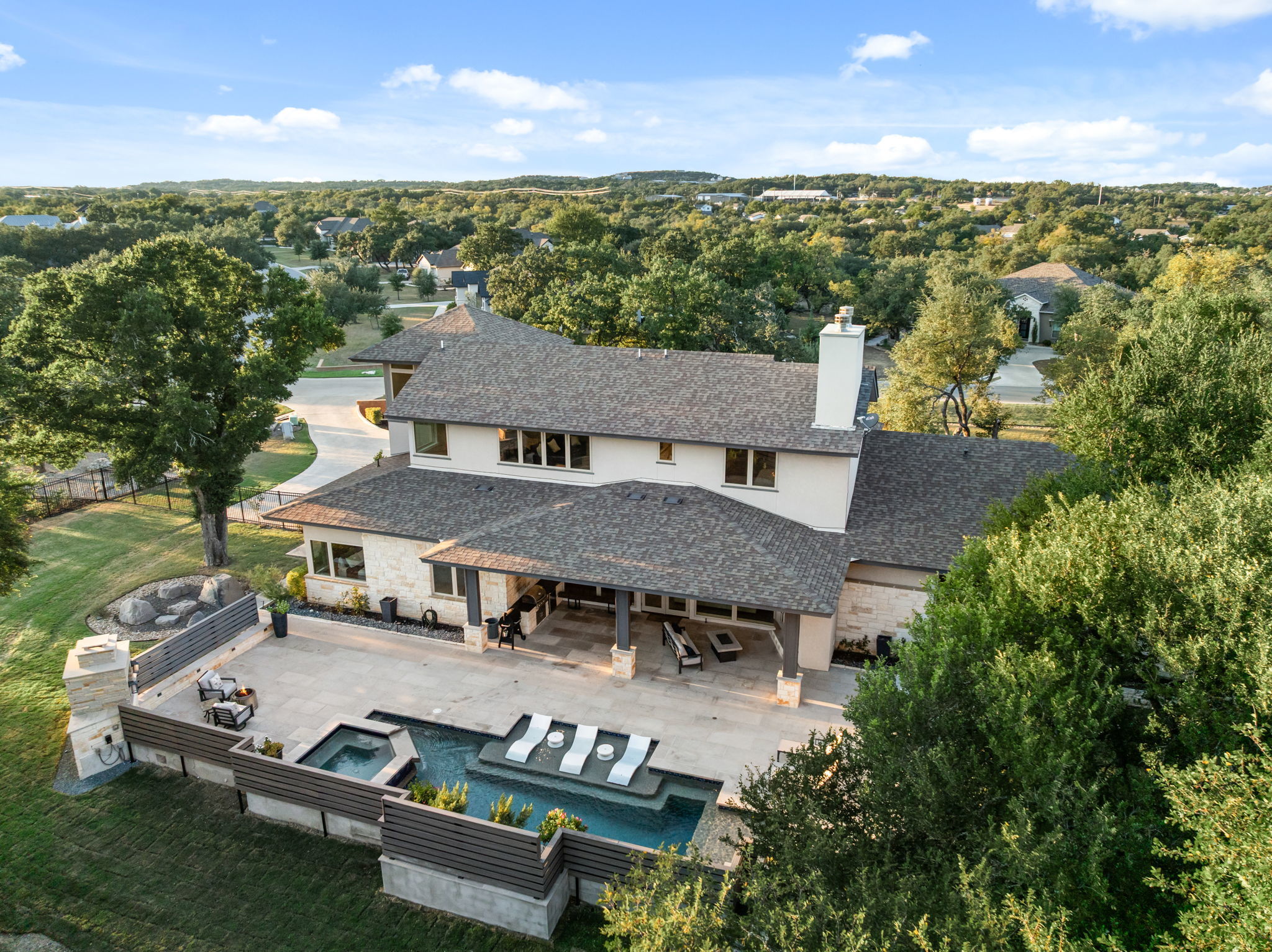 Hill Country Contemporary in Gated Bunker Ranch Estates This custom home sits on 3/4 acre at 425 Bunker Ranch Blvd in the gated community of Bunker Ranch Estates. Built in 2019, it offers a functional layout with quality finishes. The backyard includes a pool and spa with stone planter, a stone fireplace, and wood enclosures for added privacy—making it a great space for entertaining. Mature trees surround the property, adding natural beauty and shade. The home is designed to live like a single story, with an upstairs game room/play room and guest suite. Features include wide plank white oak floors, quartz counters, and wood panel accent walls. The kitchen has a quartz center island, commercial-grade gas stove, farm sink, island sink, and connects to a dining room with backyard views and a wine bar. Each bedroom has an ensuite bathroom. The primary suite is located on one side of the home, separate from the other bedrooms. The primary bath includes a porcelain shower, soaking tub, and 2 large walk-in closet. Additional spaces include a mud room with study nook, office, large utility room with space for a second refrigerator, and a three-car garage. Located in Dripping Springs ISD with a low tax rate, this home combines privacy, functionality, and outdoor living in a gated community. Schedule a tour to see it in person.