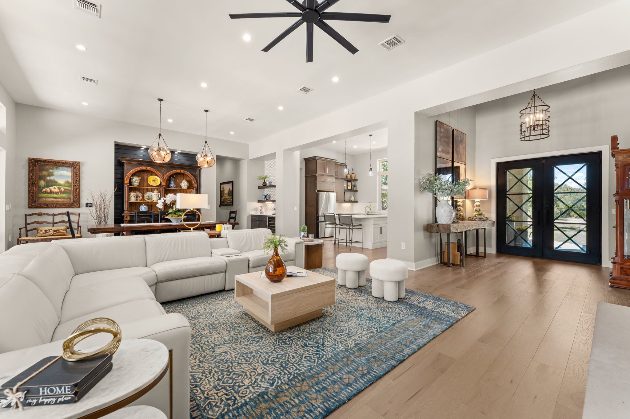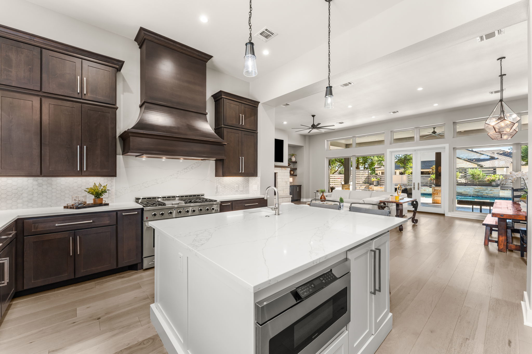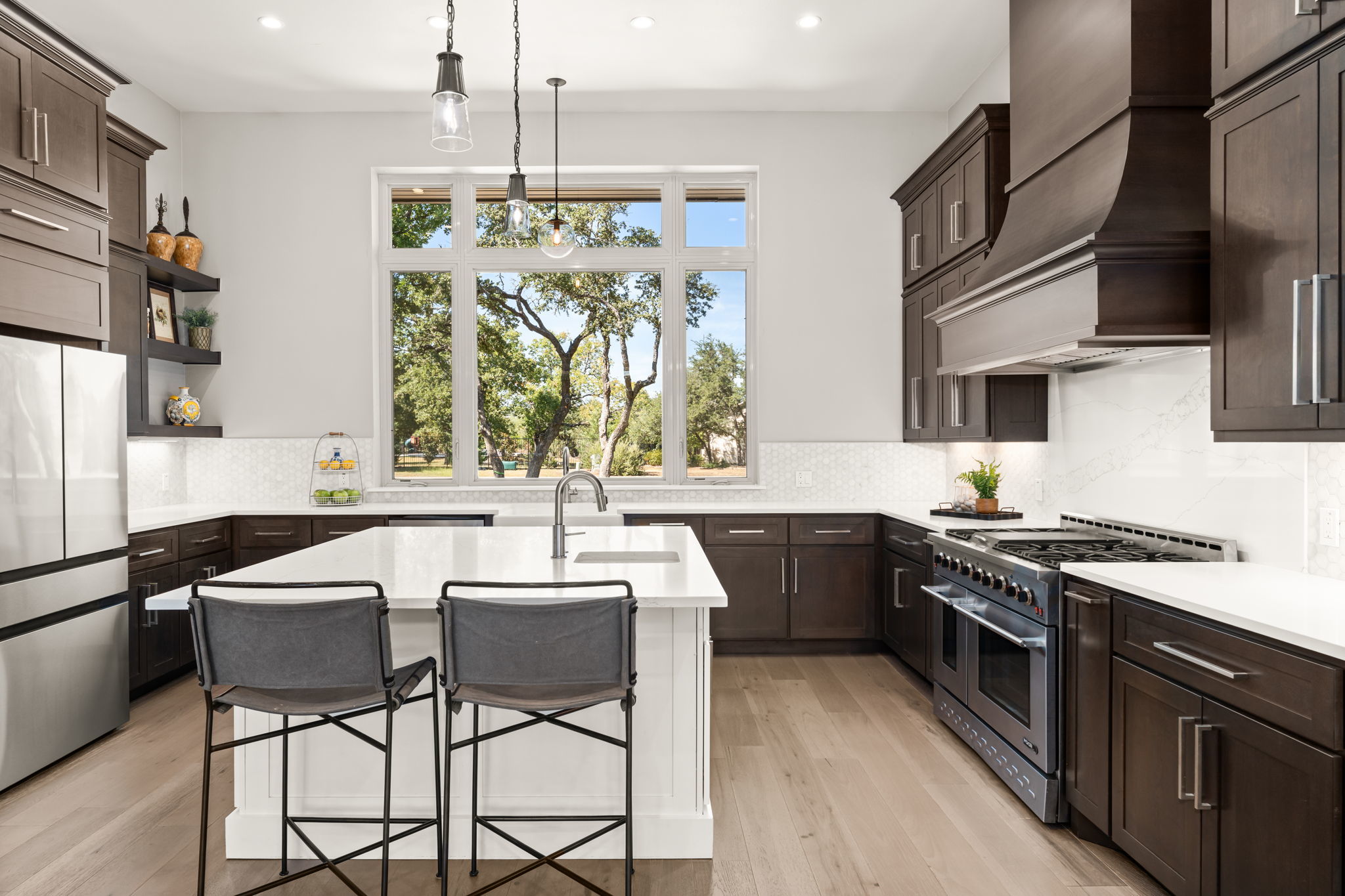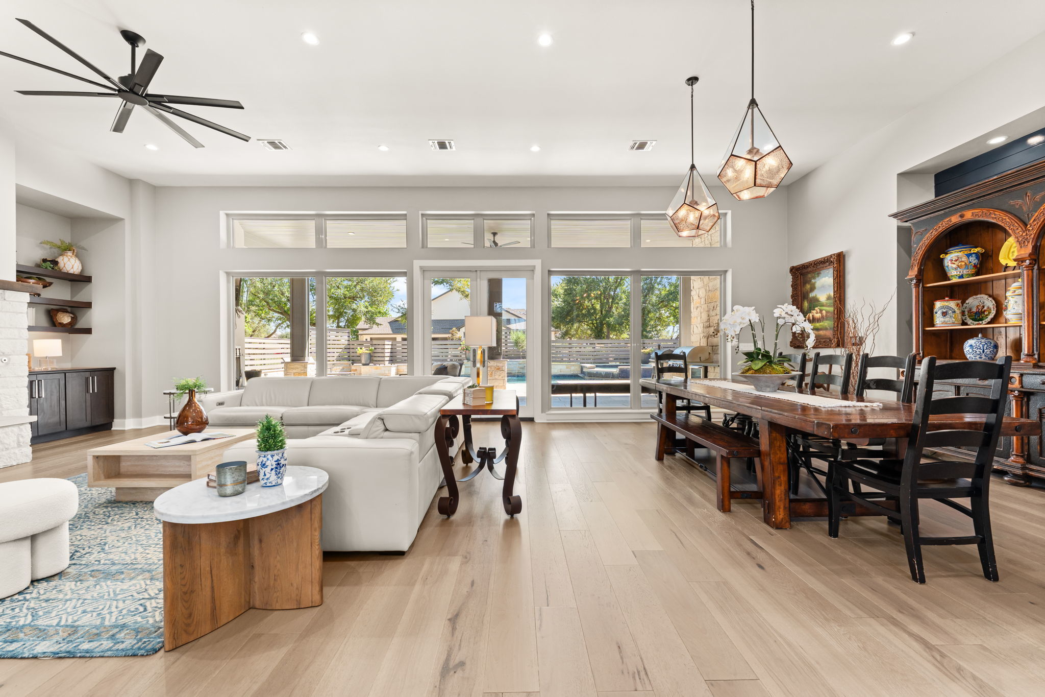 Hill Country Contemporary in Gated Bunker Ranch Estates This custom home sits on 3/4 acre at 425 Bunker Ranch Blvd in the gated community of Bunker Ranch Estates. Built in 2019, it offers a functional layout with quality finishes. The backyard includes a pool and spa with stone planter, a stone fireplace, and wood enclosures for added privacy—making it a great space for entertaining. Mature trees surround the property, adding natural beauty and shade. The home is designed to live like a single story, with an upstairs game room/play room and guest suite. Features include wide plank white oak floors, quartz counters, and wood panel accent walls. The kitchen has a quartz center island, commercial-grade gas stove, farm sink, island sink, and connects to a dining room with backyard views and a wine bar. Each bedroom has an ensuite bathroom. The primary suite is located on one side of the home, separate from the other bedrooms. The primary bath includes a porcelain shower, soaking tub, and 2 large walk-in closet. Additional spaces include a mud room with study nook, office, large utility room with space for a second refrigerator, and a three-car garage. Located in Dripping Springs ISD with a low tax rate, this home combines privacy, functionality, and outdoor living in a gated community. Schedule a tour to see it in person.