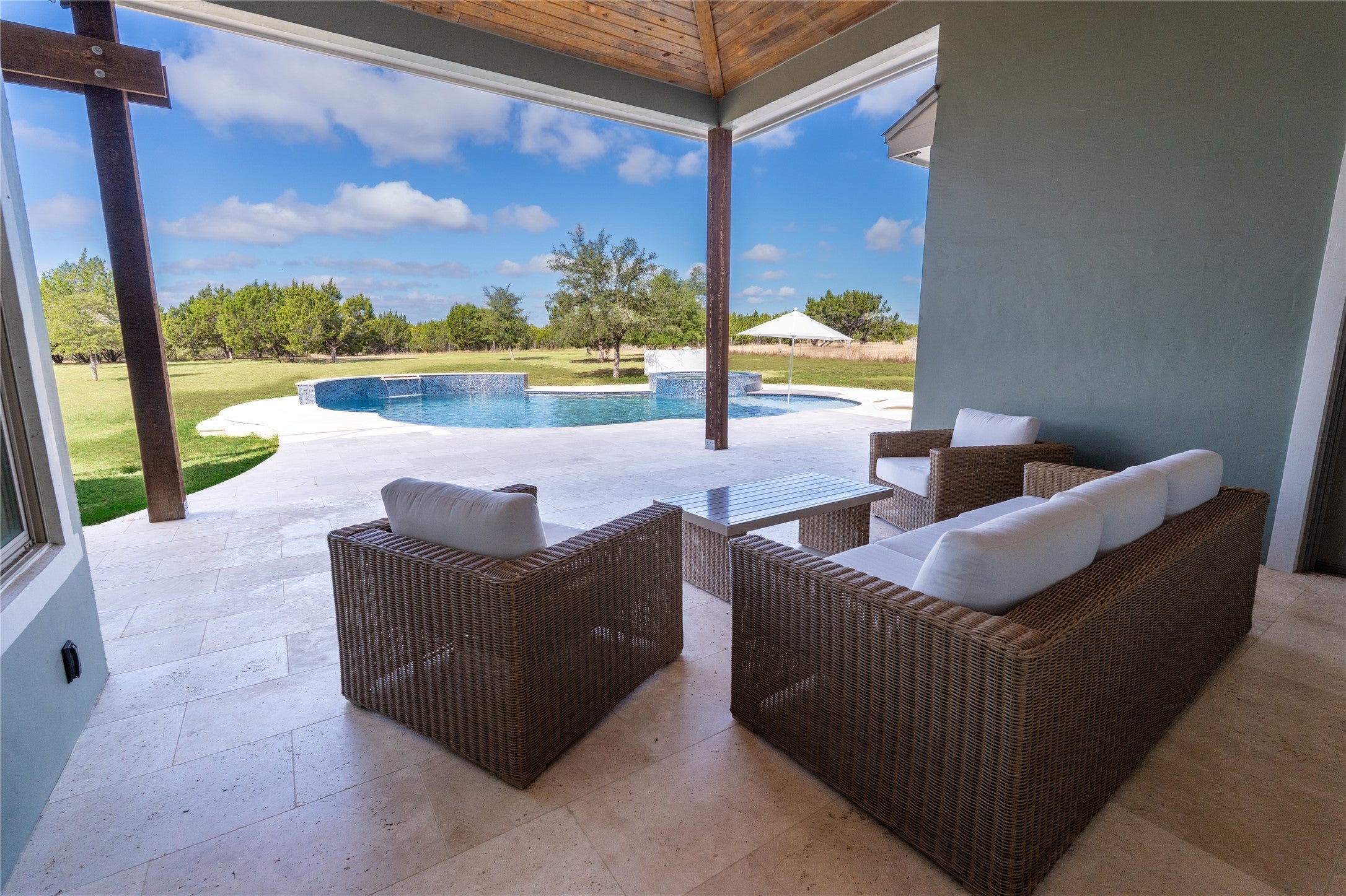 Hill Country retreat that blends refined interiors with the natural beauty Dripping Springs is known for. Set on a scenic lot surrounded by mature trees and wide skies, this thoughtfully designed home offers spacious living areas, inviting outdoor spaces, and a layout made for both everyday comfort and effortless entertaining. Inside, the open-concept living room features vaulted ceilings and a wood-burning fireplace, creating a warm and welcoming centerpiece. The kitchen is equally inviting, offering sleek countertops, abundant cabinetry, stainless appliances, and double ovens—perfect for gatherings large or small. Expansive windows fill the home with natural light while capturing sweeping views of the Hill Country beyond. The home offers two primary suites, thoughtfully located on separate levels for flexibility and privacy. The downstairs primary features a spa-like bath with a soaking tub, dual vanity, and a vast walk-in shower with dual shower heads, including rain shower. The upstairs primary offers equally generous proportions and private access to the elevated deck via a separate exterior staircase—ideal for a quiet retreat or guest accommodations. Large bonus space that can serve as a game room, playroom, yoga studio, or theatre room. Outdoor living is equally appealing with two distinct spaces: a covered patio on the main level and an upper deck with elevated views. Together, these create options for entertaining, relaxing, or simply enjoying the quiet of the surroundings. A sparkling pool and hot tub completes the setting, offering the perfect place to cool off on warm Texas days or enjoy a starry winter evening. With its versatile layout, flexible living areas, and Hill Country views from every room, 724 Chama Trace delivers a rare opportunity to enjoy both comfort and character in one of Dripping Springs’ popular neighborhoods. *Bonus* 2 horses are allowed!
