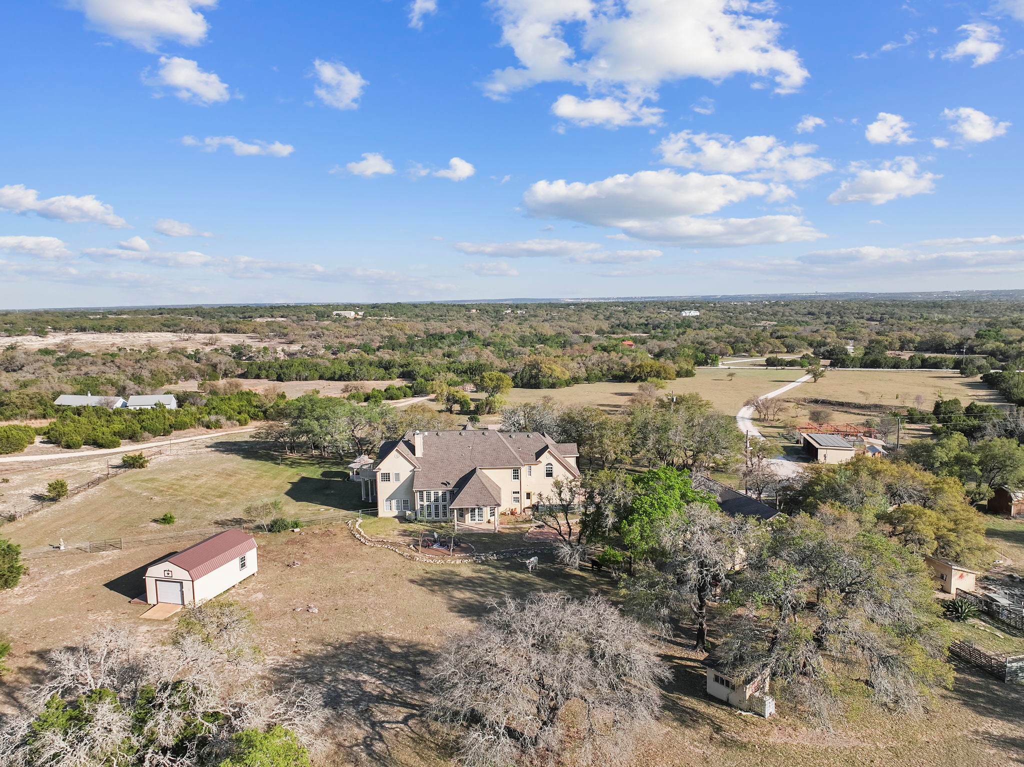 Peaceful country living with easy access to convenience and amenities is a rare find and exactly what this 16.9 acre ranch property offers. Welcome to 375 Branch Creek Trail in the desirable Liberty Hill community! The main residence spans 4,461 sf and features an open and flowing floor plan with ample spaces to relax, entertain and live. Designed with features like windows with incredible views and light in every room of the house, stunning floor to ceiling windows in the living room, a kitchen with ample counter space for prepping meals or easily entertaining, and a library you only dream of or see in movies, this home will leave you dreaming of your own personal touches in each space. A 1,792 sf guest house adds incredible flexibility with 2 bedrooms, 1 bathroom, a private office or den, and a large living and kitchen area. Ideal for multi-generational living, guests, or even rental potential. Next, step outside to experience true Texas entertaining with a sparkling pool and hot tub, large covered deck, and open-air patio seating. Not in the mood for pool days? Enjoy a quiet picnic in the gazebo or sit around the fire on the open air back deck. No matter your mood, all the spaces are perfectly positioned to enjoy the surrounding landscape this property offers. The land is equipped for hobby farming or ranch living, featuring covered animal stalls, a fenced garden, chicken coop, goat pen, multiple storage sheds, and fencing to easily keep your animals in the right areas. Ready to venture away from home? Everything you need from gas stations to a brand new Costco, grocery stores, restaurants, shopping and entertainment are all within just 20 minutes of your front gate! Liberty Hill also features top rated schools. The only thing left to do is schedule your private showing of this property today...Welcome to your new homestead!