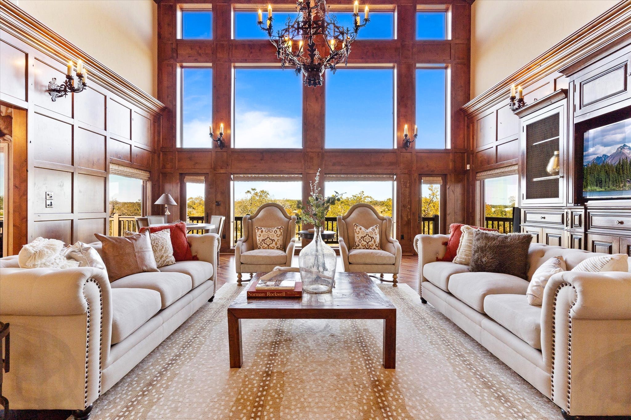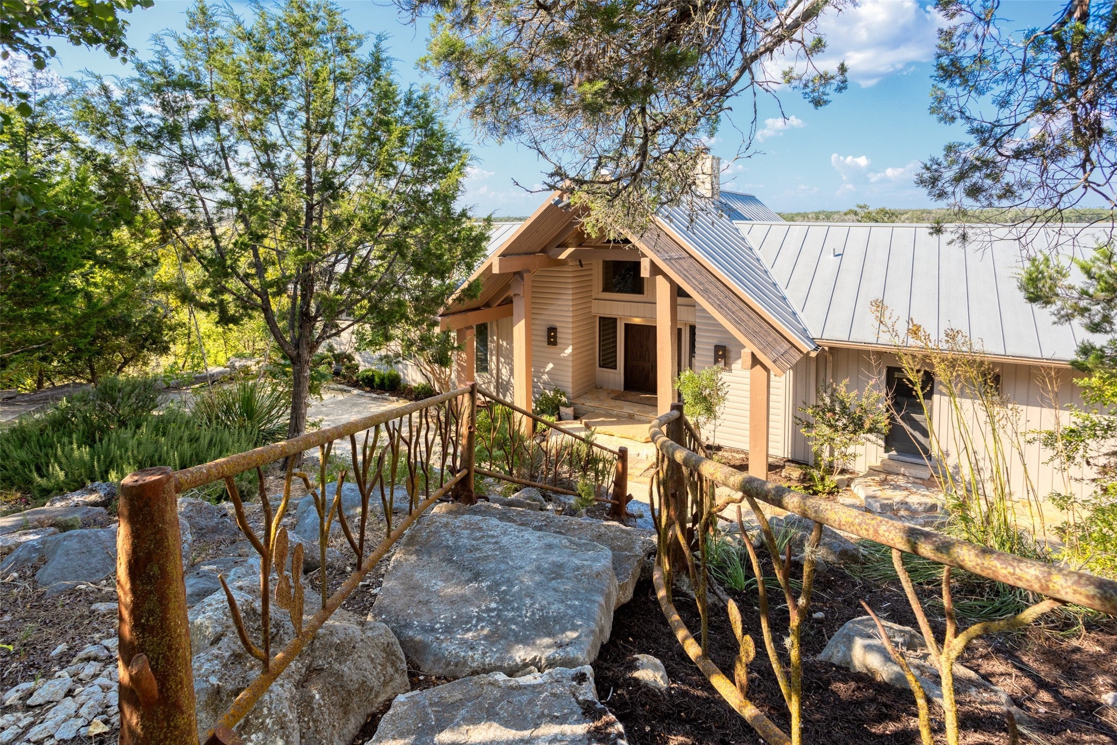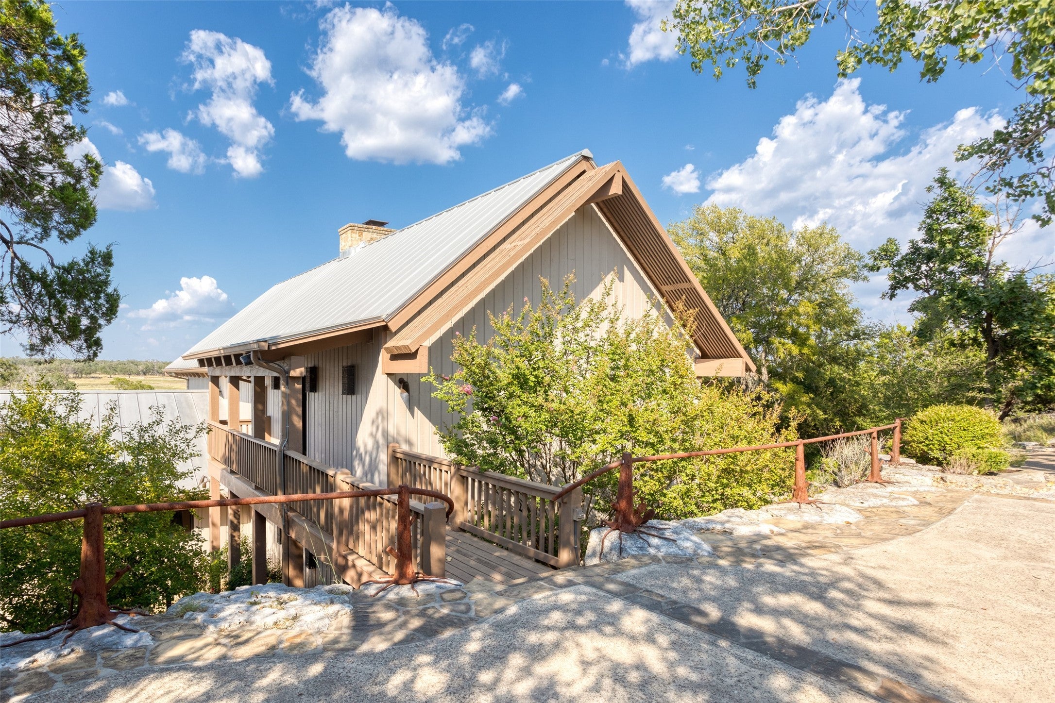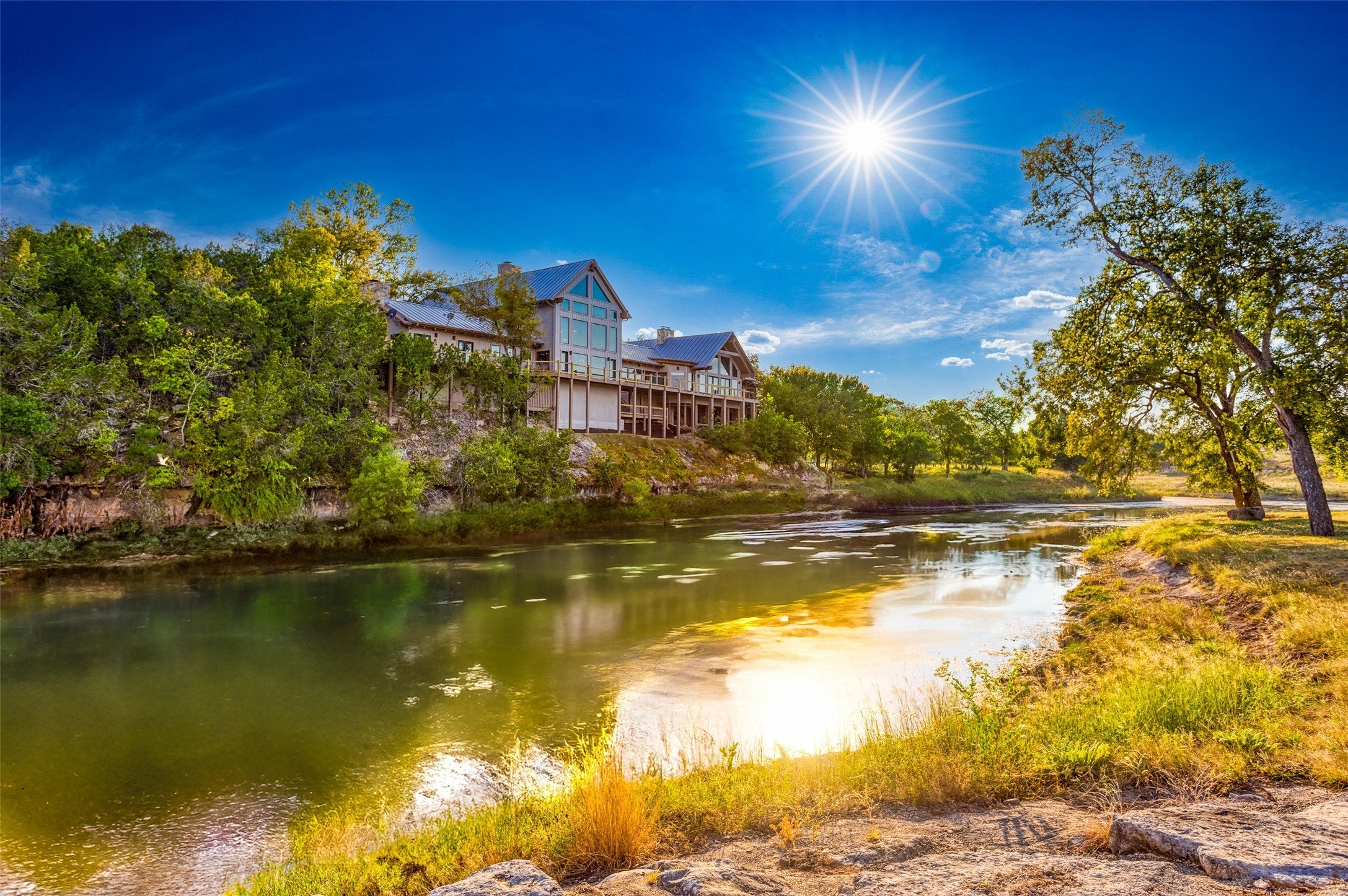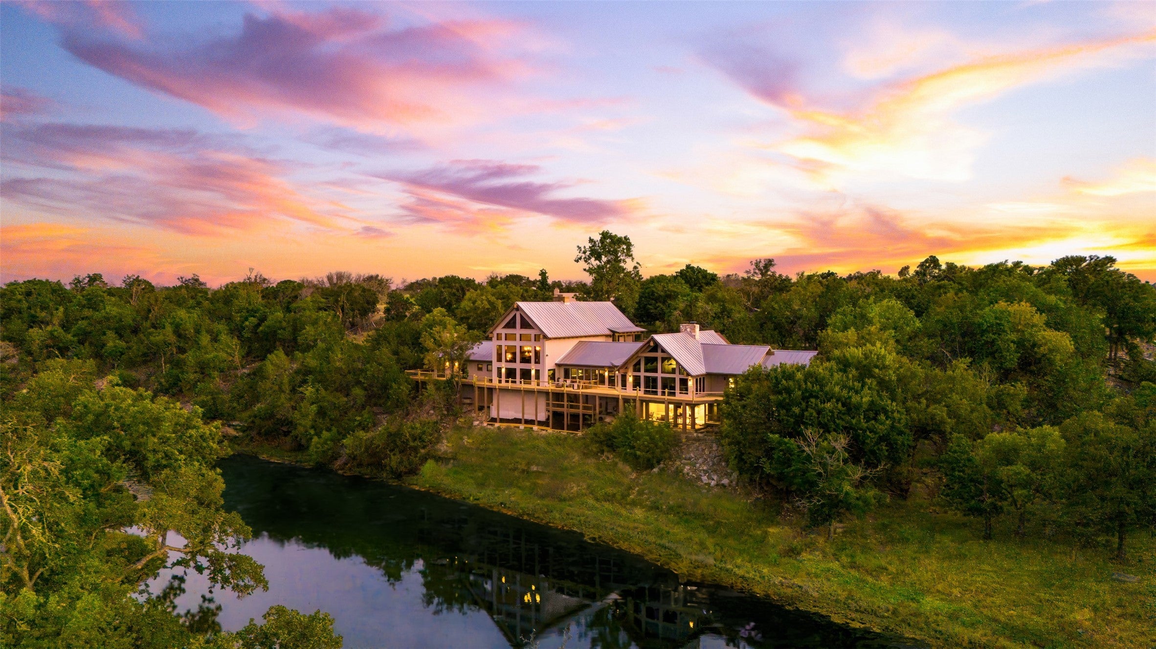 LUX Waterfront Ranch Home PRICED TO SELL!! New Updates & Turn-key! In The Heart of TX Hill Country, within the prestigious Maverick community, lies a luxurious lakeside 8,384sqft ranch home. Perfectly situated between the historic towns of Fredericksburg & Kerrville, this property offers the ideal blend of country solitude with easy access to urban conveniences, vibrant local culture,& renowned wineries. The Lake House: surrounded by 21.14acres of mature live oaks, live water, exotic wildlife, and rolling terrain, this unique 3-story 5bed 6bath Ranch Home with Guest House, sits hilltop with an expansive wrap-around deck overlooking its private lake with mile-long creek views. 2 spring-fed converging live water creeks, Klein & Stevens, intersect home-front where a large concrete dam gives this property a beautiful year-around lake. Maverick community enriches living with high-end amenities including: High-fenced perimeter & grand gated entrance, diverse exotic wildlife, On-site groundskeeping, high-speed fiber, underground utilities. 7miles paved roads, Resort-style clubhouse, pool, pavilion area, & entertainment area. Sports enthusiasts will appreciate the BB & pickleball courts, while the Naturalist enjoys expansive green spaces & hiking trails leading the scenic Overlook. The kids are sure to be found at the famous live water Blue Hole or creek bottom exploring. Home itself marries architectural elegance with functional luxury. Cathedral ceilings, grand stone fireplaces, floor-to-ceiling windows, gourmet kitchen equipped with top-tier appliances, and the dual master suites provide sumptuous privacy. Property also features a guest house, an equestrian barn, workshop, and garage. This estate is not just a home but a lifestyle, offering an unparalleled blend of rural tranquility & luxury amenities. Updates: New Exterior Paint, Decking, & too many restorations to list. Exotics Include Wildebeest, Oryx, and more. SEE HIGHLIGHT VIDEO. Furniture=Convey