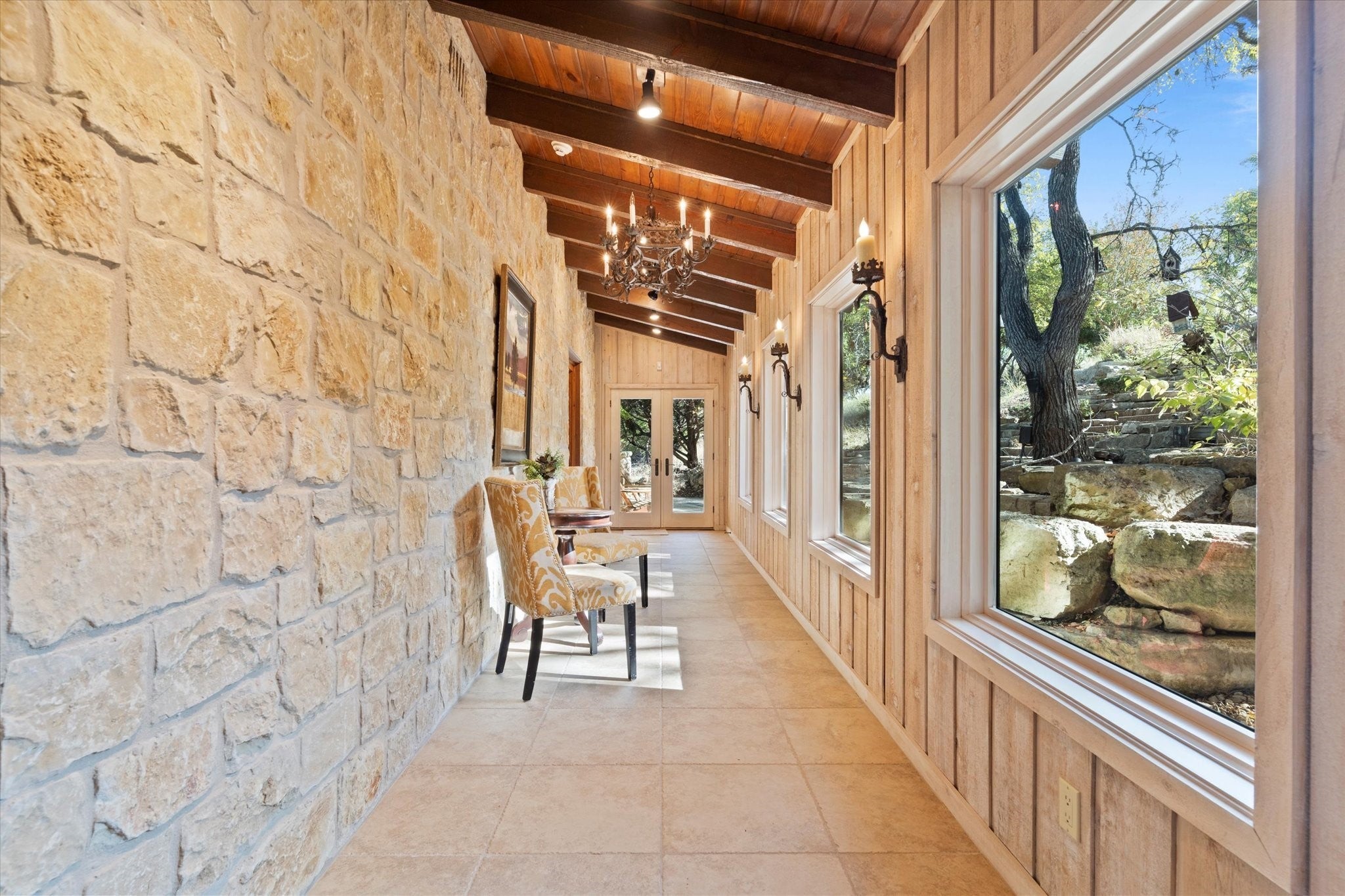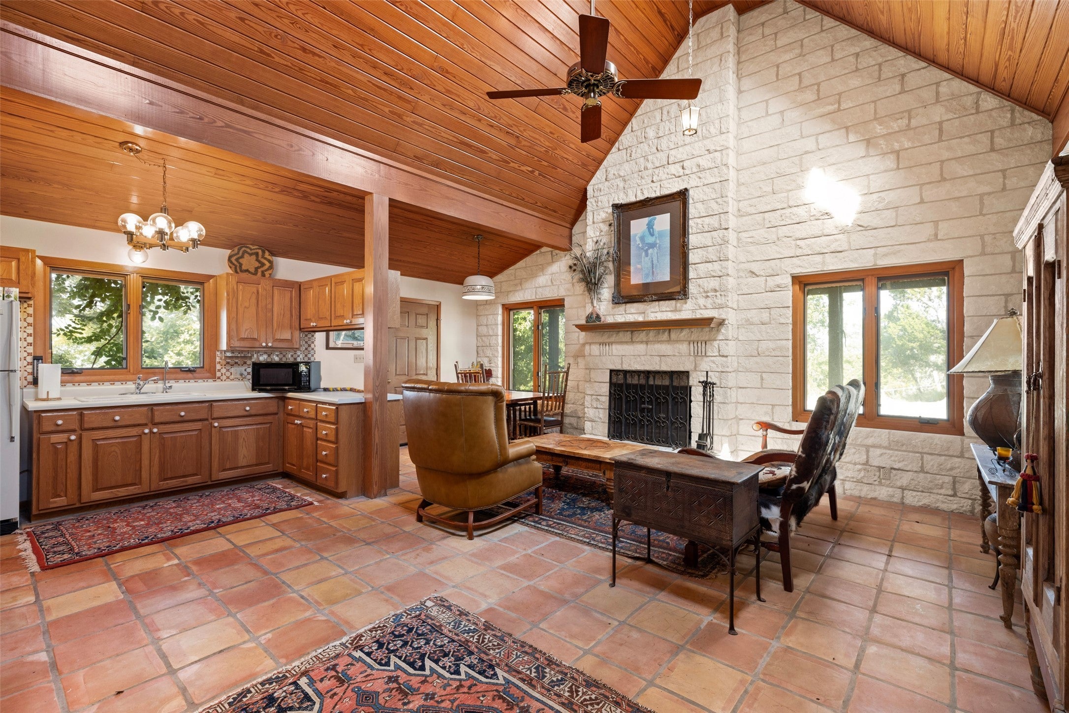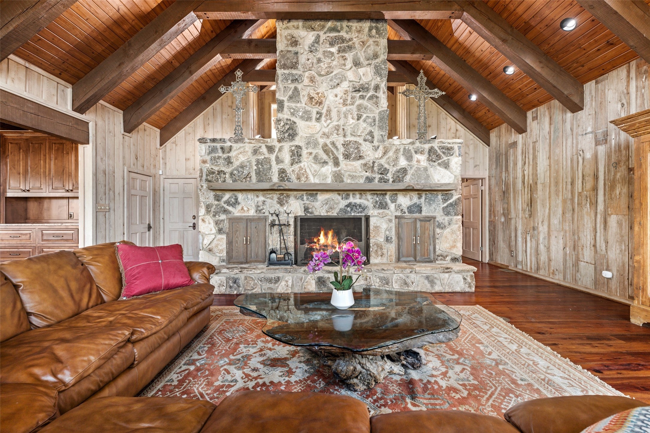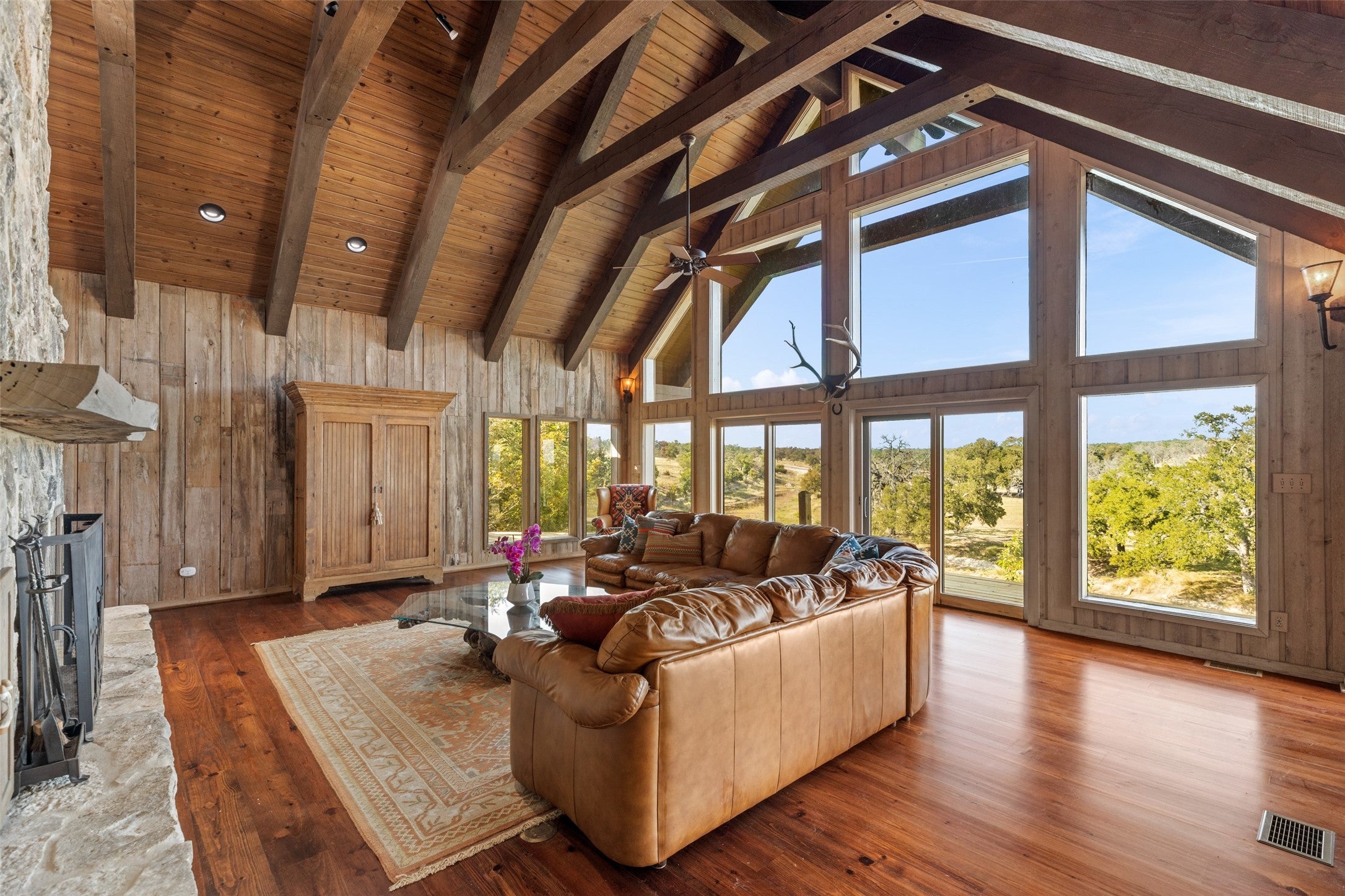 - Family Room, Gas Starter, Great Room, Primary Bedroom, Outside, Stone, Wood Burning