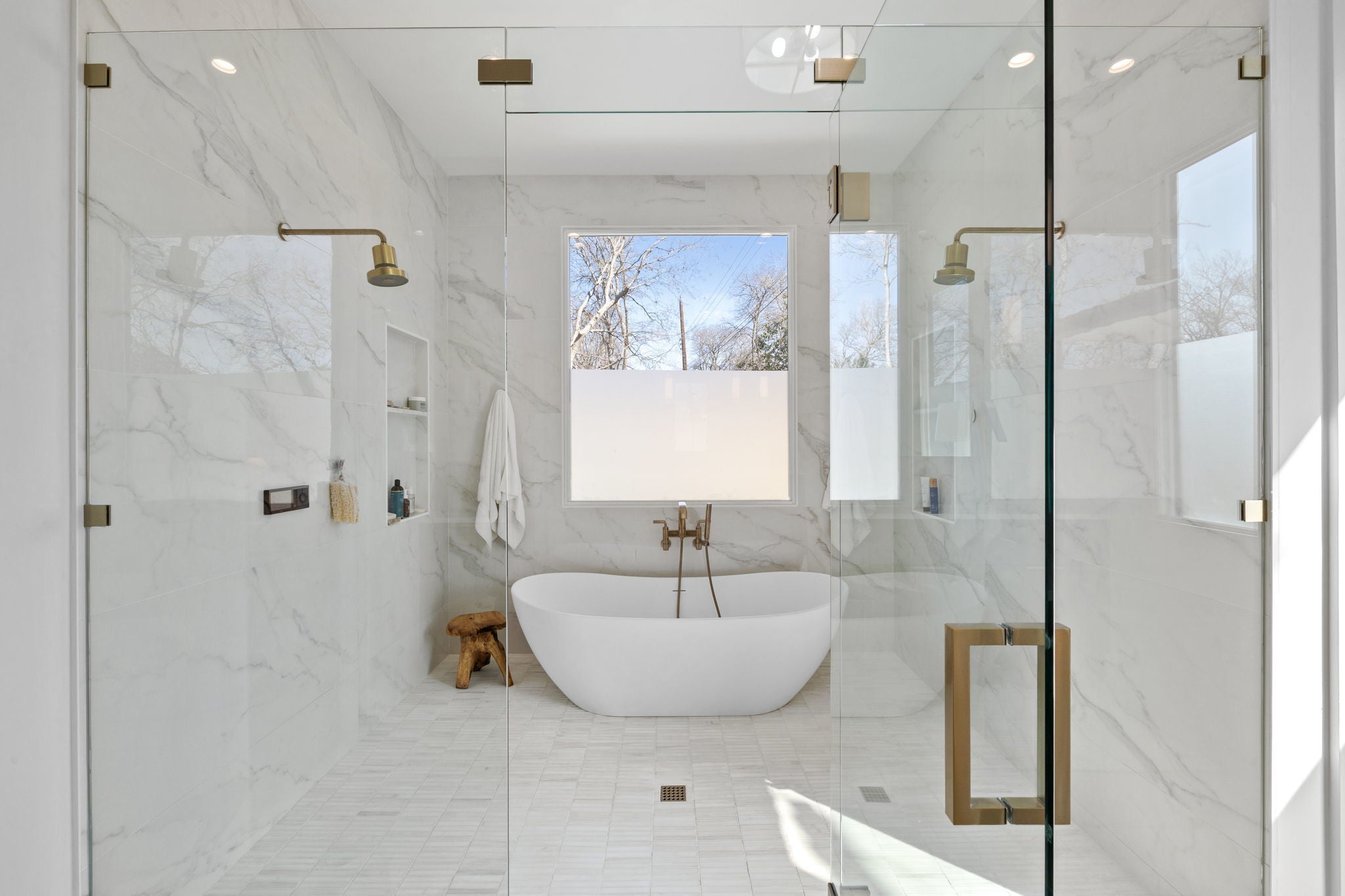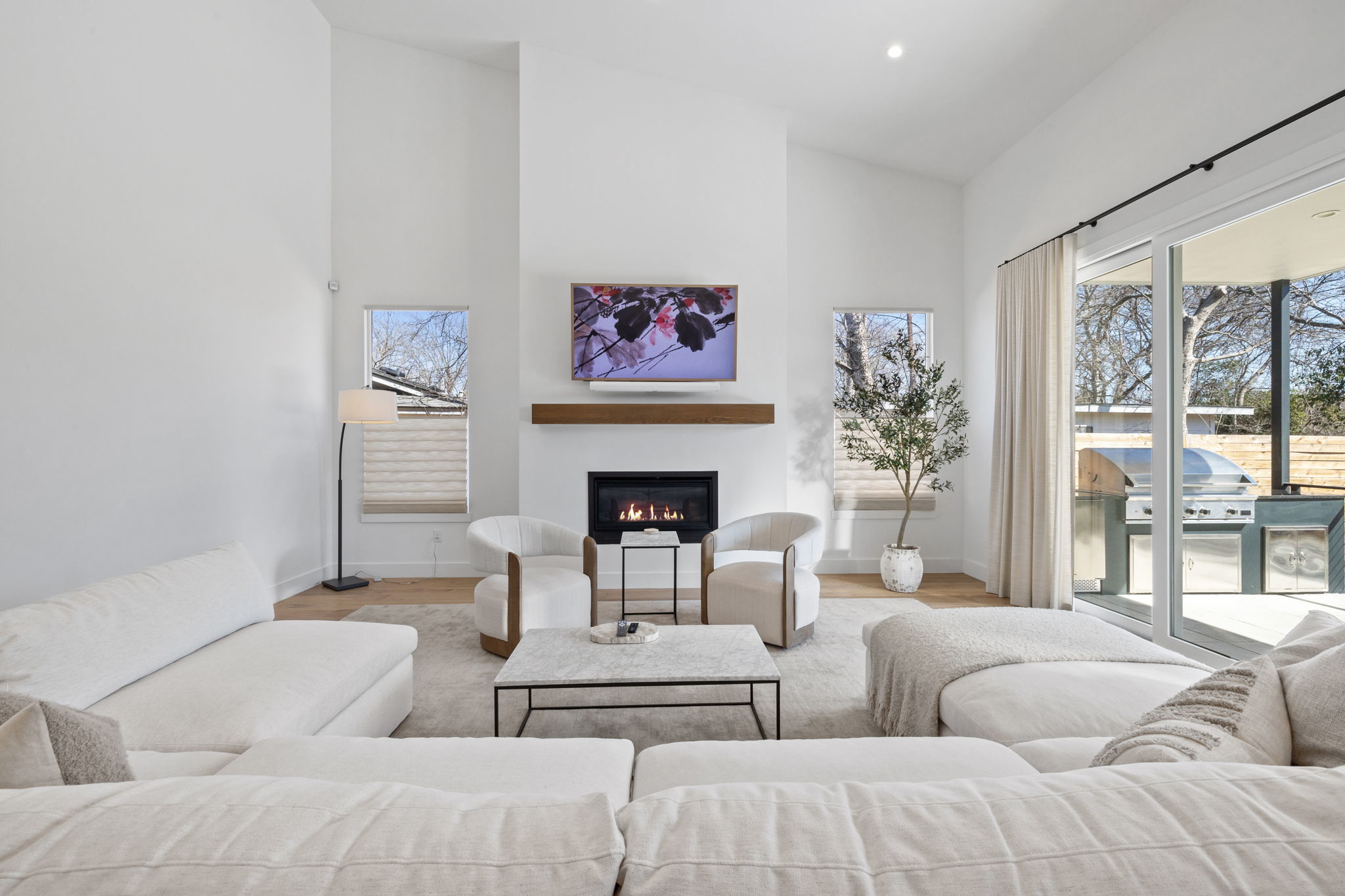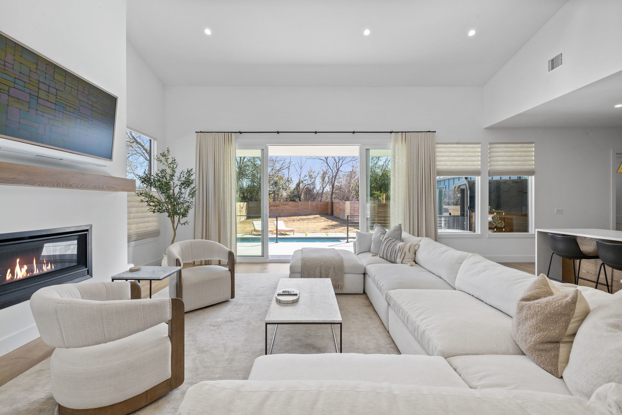 Gorgeous new construction designed by Etch Design Group, completed in 2024. Five bedrooms with two on the main level. Two primary bedrooms with one upstairs and one downstairs. Big pool with a covered outdoor patio, unbelievable bbq area with DCS built in grill, custom sauna (by Sauna Life), offering a true at-home wellness retreat. Custom finishes and fixtures throughout with a gorgeous kitchen and double islands open to the 20 ft ceilings in the living room. Separate dining room with the second bedroom downstairs being a perfect space for a home office. Huge windows throughout overlooking the pool and massive backyard. Designer motorized shades by Hunter Douglas installed throughout the main living spaces and multiple bedrooms, providing effortless light control, privacy, and a clean modern aesthetic at the touch of a button. Shades can be scheduled or controlled via smart assistant for added convenience and energy efficiency. This quarter acre lot has plenty of room to roam with elevated steal flower beds, clean landscaping and modern design that still feels homey. With a 5 minute walk to del curto park, 2.5 miles from SOCO and 3.5 miles from downtown, it’s easy to see why this pocket of south Austin is so popular. This floorplan has it all with the master suite on the main level as well as a stand-alone home office downstairs that could be used as a bedroom. High ceilings and an open floorplan make this house inviting from the moment you walk in the front door. The gourmet kitchen boasts a large island and all the designer finishes you would expect from a luxury home in south Austin. The master bedroom is tucked away off of the living room and kitchen with vaulted ceilings, a spa-like master bath with a digitally programmable double shower, a freestanding tub, double vanity and extra large walk-in closet. When you walk upstairs, you’ll find another large living space as well as a second master suite.
