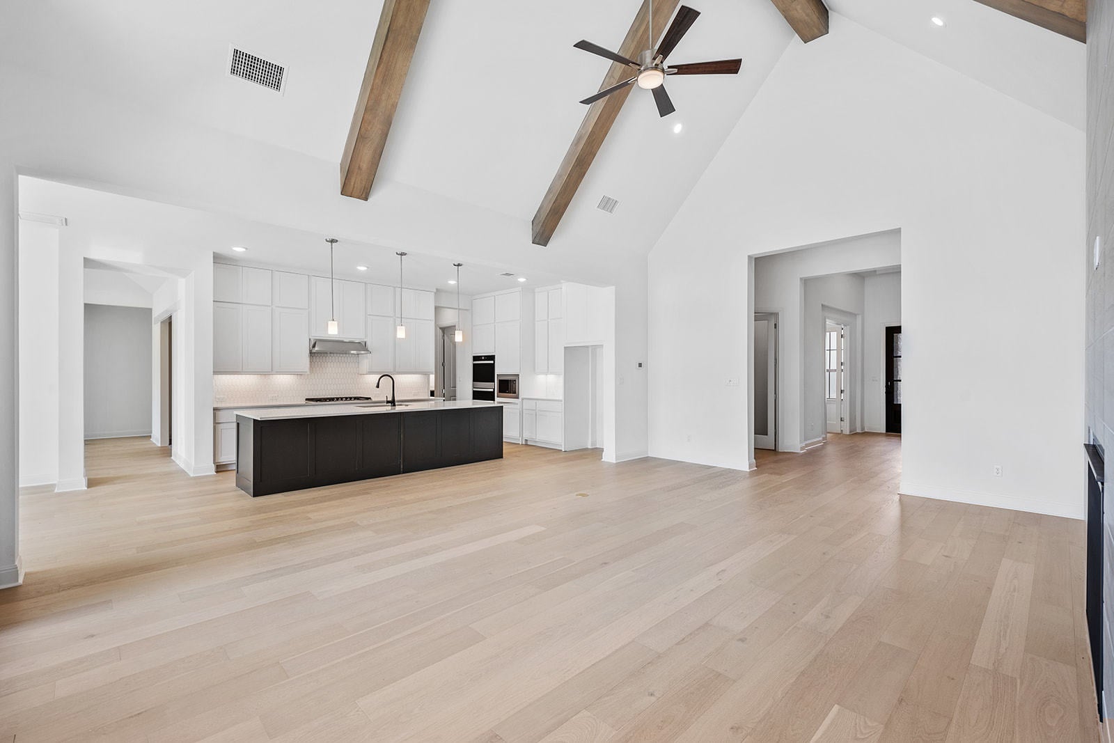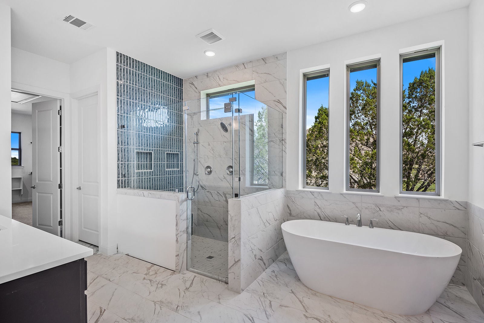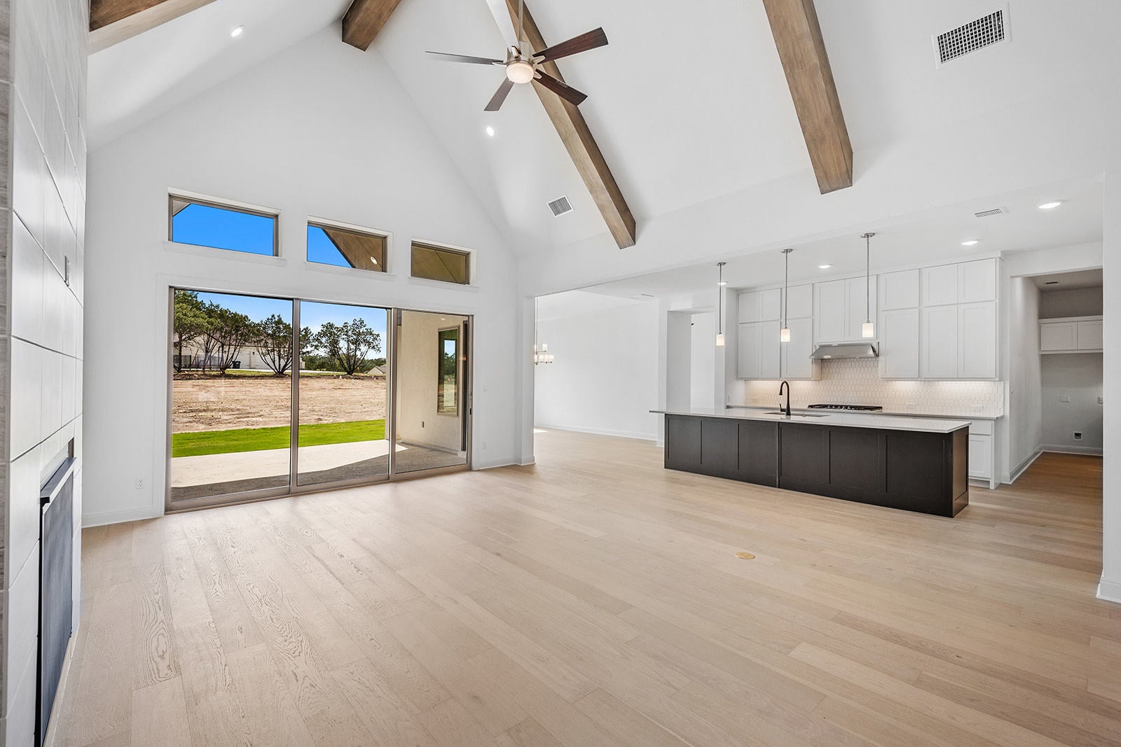 Set within Liberty Hill’s scenic Hill Country, Clearwater Ranch is a 1 acre plus estate neighborhood designed for space and privacy, in a relaxed setting. Located in this community, this single story Marley floor plan spans over 4,000 sf and offers 4 en suite bedrooms, delivering comfort and privacy throughout. Upon entry, the foyer is flanked by bedroom 4 on one side and a private home office on the other, creating a welcoming introduction to the home. Just beyond, the main living area opens with wide plank wood floors, soaring ceilings with exposed beams, and a dramatic floor to ceiling tiled fireplace. Expansive triple pane sliding glass doors open an entire wall to the outdoors, creating seamless indoor outdoor living. The open concept kitchen serves as the heart of the home, featuring an oversized island, abundant cabinetry, quartz countertops, and double ovens, with effortless flow into the dining area located just off the kitchen. Adjacent to the dining space is a game room or second living area, offering flexibility for gathering and recreation. Tucked behind barn doors, the media room provides a private setting for movie nights. This wing of the home also includes bedrooms 2 and 3, thoughtfully positioned for privacy. The primary suite is privately accessed off a hallway near the main living area and offers a peaceful retreat, complete with a boutique style en suite with custom tile, frameless glass shower, dual recessed niches, stand alone tub, his and hers vanities and a spacious walk in closet. On the opposite side of the kitchen, the home is enhanced by a generous pantry, craft or hobby room, utility room, and mudroom, all leading to a spacious 4 car garage designed for everyday convenience and organization. With refined finishes, flexible living spaces, thoughtful design, this home offers elevated living on a 1 acre homesite. Clearwater Ranch amenities include a community park, natural creek, walking trails, and a playground.