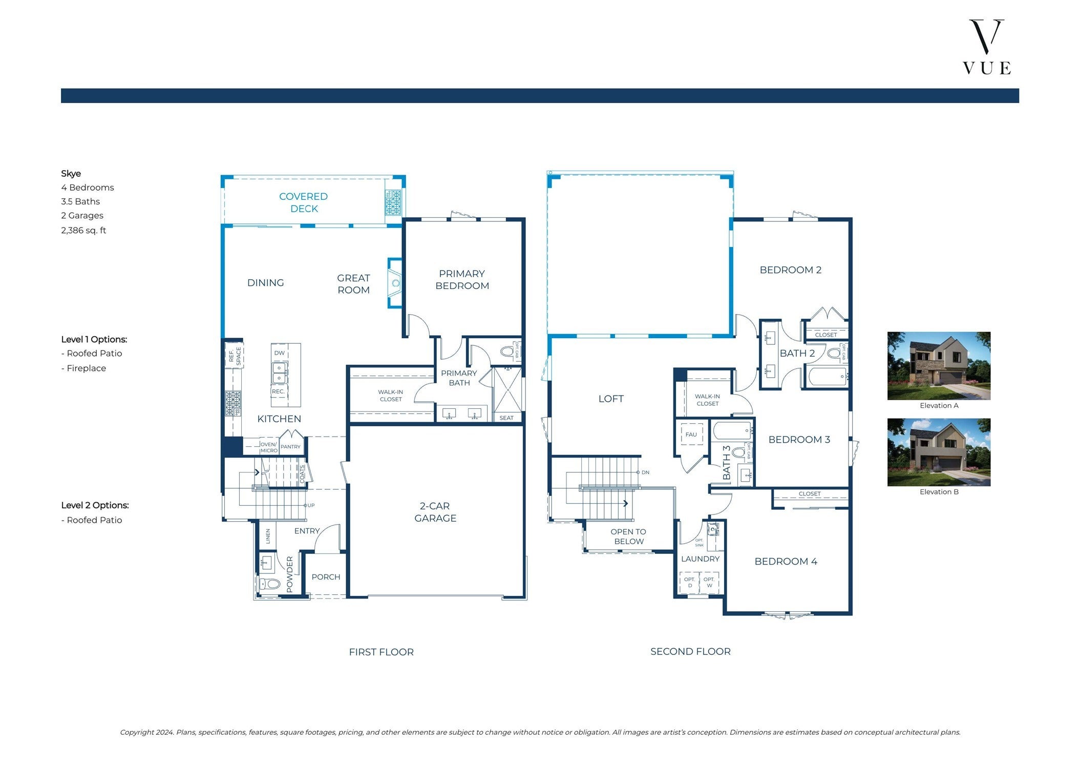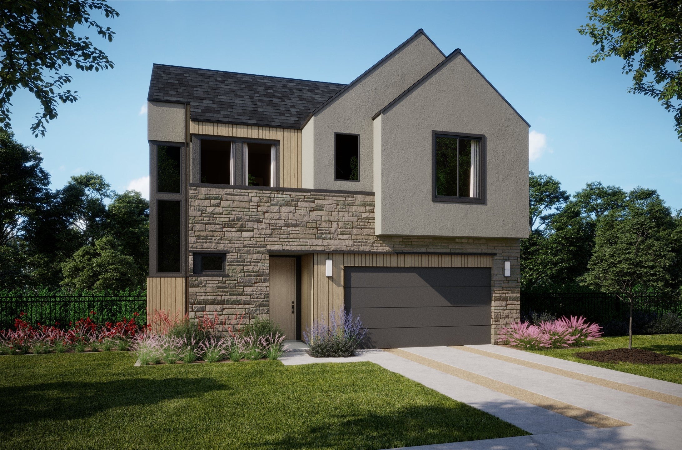 VUE offers spacious, open floor plans with 3 to 4 bedrooms, high ceilings, and expansive windows that fill the space with natural light, framing views of Austin’s skyline and hill country.- Designed with sustainability and comfort in mind, each home includes energy-efficient features, high-quality materials, and eco-friendly finishes that respect both the environment and your lifestyle. The SKYE Plan offers a spacious, open floor plan with 4 bedrooms, 3.5 baths, high ceilings, and expansive windows that fill the space with natural light. The interior features Designer selected finishes, including Silestone countertops, Thermador appliances, ceiling fans in every bedroom, Pella Impervia fiberglass windows with insulated dual Low-E SunDefense glass, tankless water heater, 16 SEER Trane HVAC system with WiFi-enabled thermostat. This home offers a covered deck with outdoor grill, a great room fireplace, Primary Bedroom and Bath on the First Floor, stackable washer and dryer hookups available on the First Floor as well. Second Floor of the home features a loft, laundry room, 3 additional bedrooms, a "Jack and Jill" bath for bedrooms 2 and 3 and a full bath for the 4th bedroom. 2 Car Garage that's EV charger-ready with 30 Amp dedicated outlets, 8' insulated steel garage door. The Community amenity Tumbleweed Park includes a putting green, hammock garden, walking trail, community garden, outdoor kitchen, community fire pit, corn hole gaming courts, gathering areas, outdoor fitness and a chandelier tree.