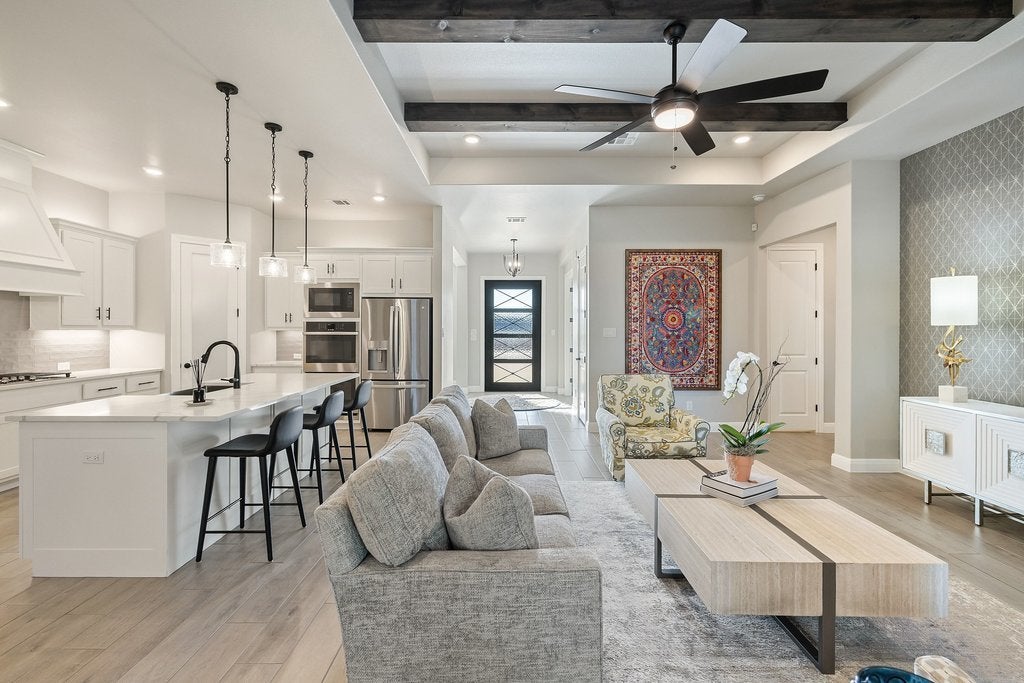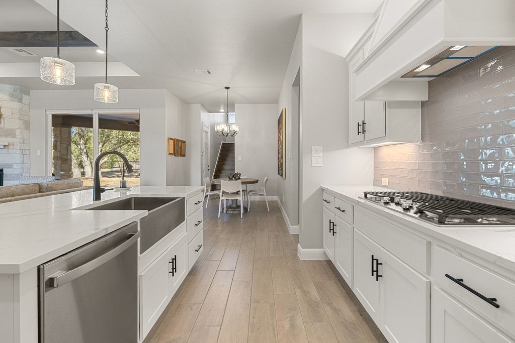 Beautifully designed home set on a lush 1-acre lot in Georgetown, primarily on one story. Step inside to an open concept main living area filled with warmth and character, featuring wood-like tile floors throughout, beamed ceilings, and a cozy fireplace that anchors the living room. Off the foyer, enjoy the flexibility of a formal dining room and designated home office. The kitchen is made for everyday ease and entertaining, complete with a large center island, quartz countertops, stainless steel appliances, a gas cooktop, and a double wall oven. The primary suite is conveniently located on the main floor with private access to the backyard, plus a spa-like ensuite bath with double vanity, soaking tub, walk-in shower, and a spacious walk-in closet. Upstairs, a loft-style flex space with a closet and half bath offers endless possibilities as a second living area, media room, game room, or even a 5th bedroom. Outside, your backyard oasis awaits with a covered patio featuring a fireplace and built-in grilling area, perfect for relaxing under the stars, hosting gatherings, or enjoying al fresco dining year-round. Community amenities include a playground, walking trails, sports courts, and a soccer field, all just minutes from Lake Georgetown, Cowan Creek Golf Course, Wolf Ranch Towne Center, Round Rock Premium Outlets, and the charm of historic downtown Georgetown with wine tasting rooms, live music, restaurants, and boutiques. With easy access to major employers like Dell Technologies, Emerson Automation Solutions, IBM, Apple, Samsung, and Tesla, plus highly regarded Georgetown ISD schools, this home truly offers the best of lifestyle and location. The property directly behind is residential.