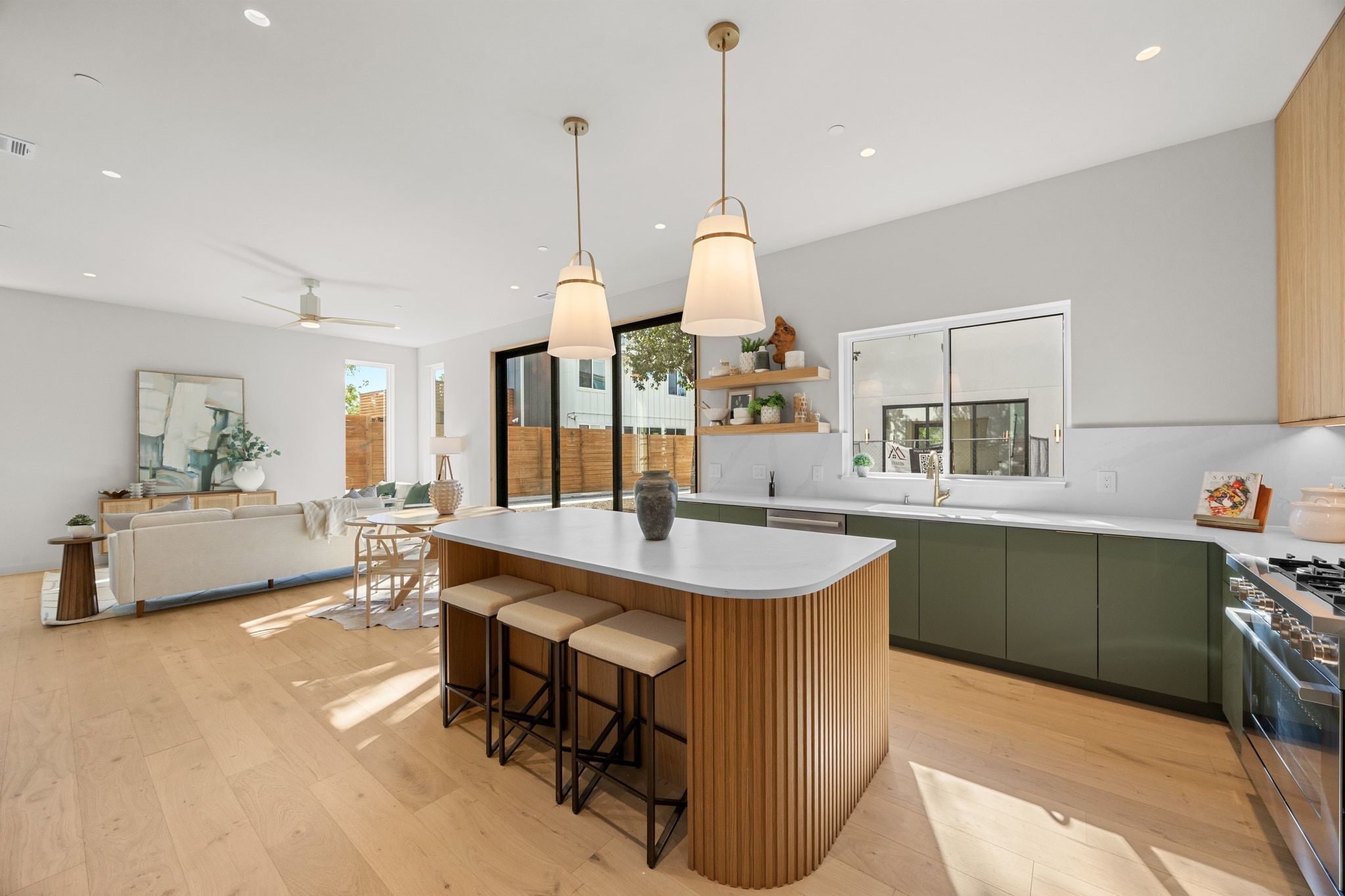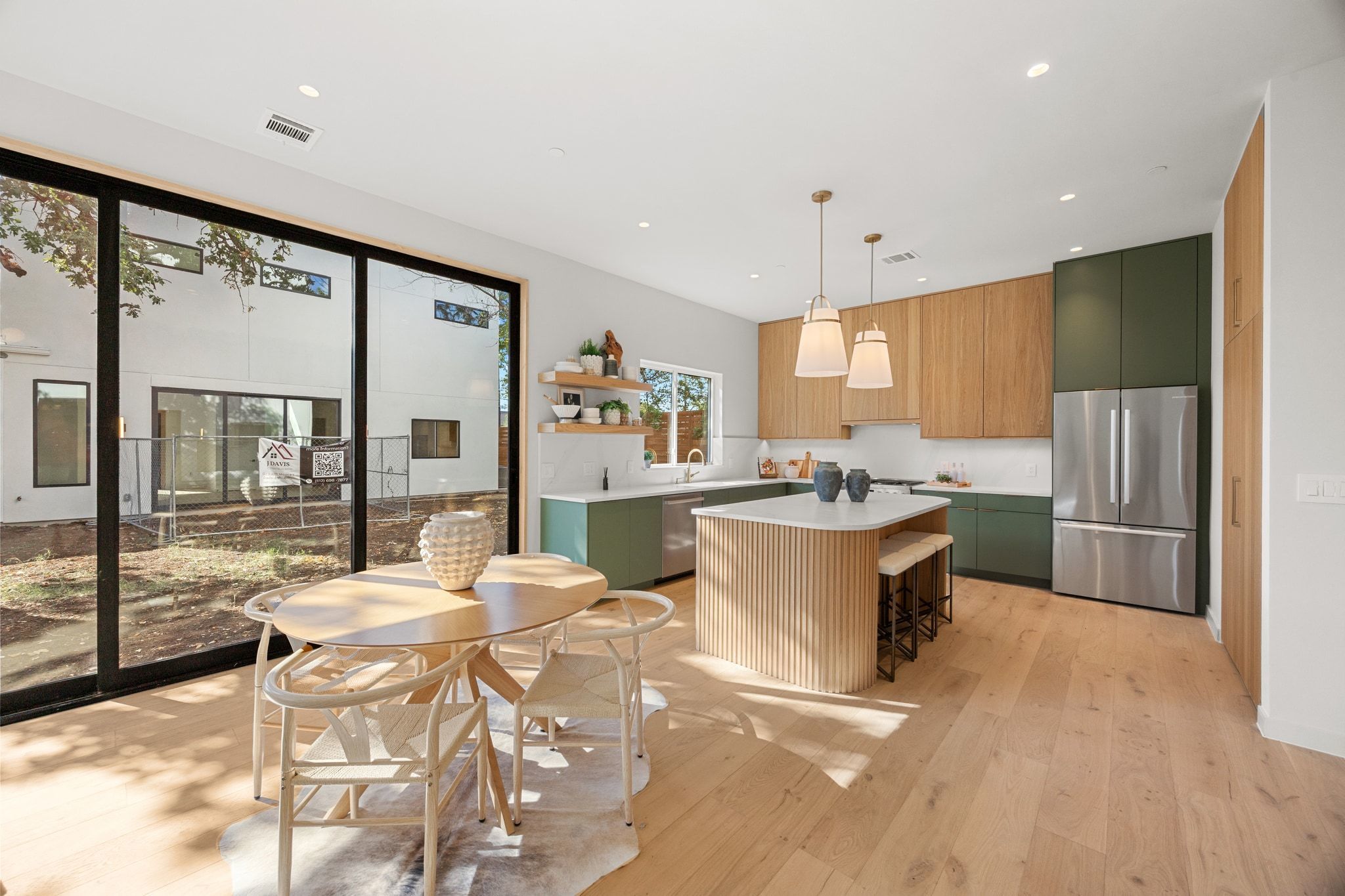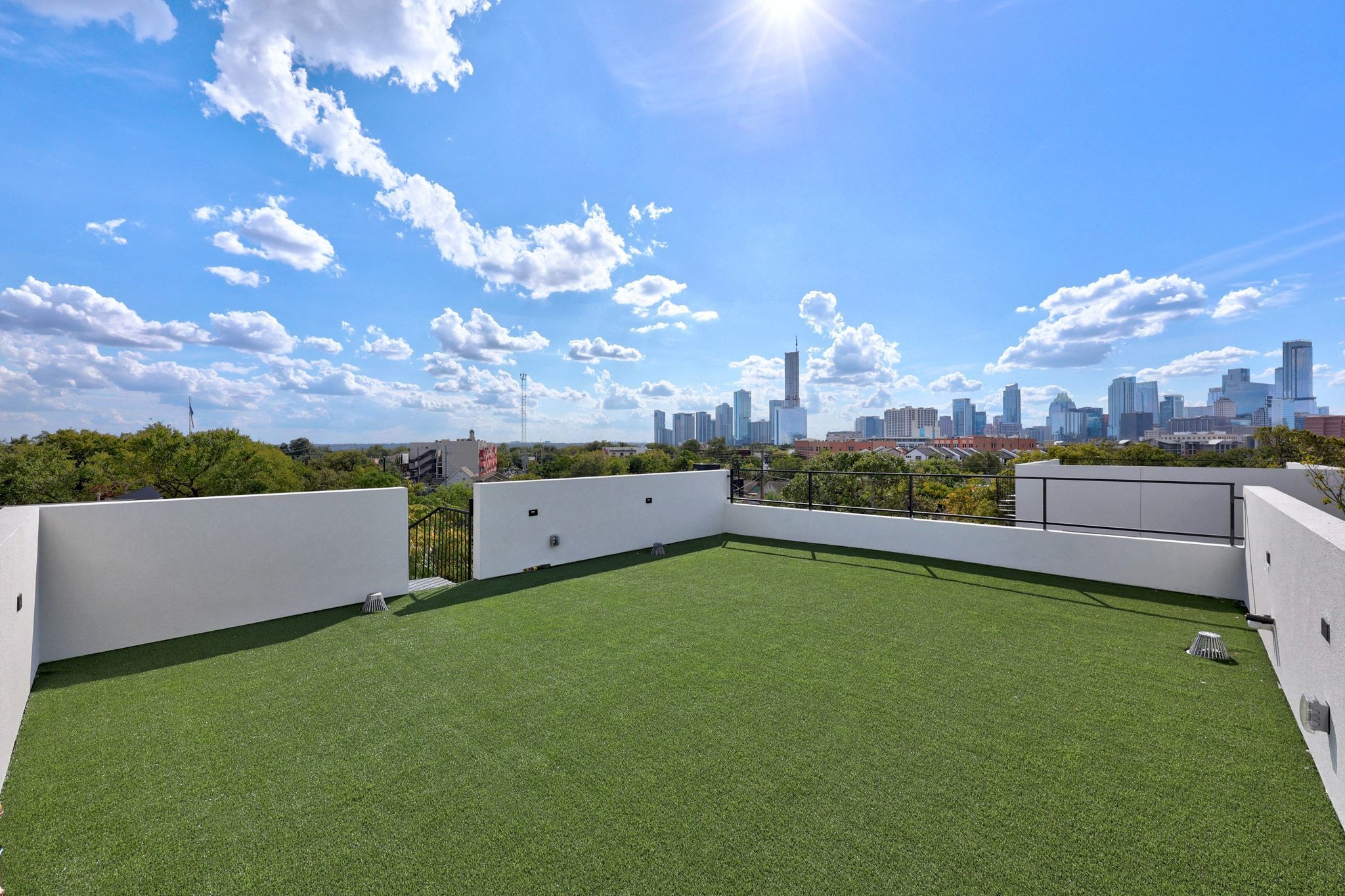 Experience the best of modern Austin living with panoramic views stretching from Rainey Street to the Capitol, the UT Tower, DKR Texas Memorial Stadium, and every landmark in between. Crafted by J Davis Construction, this brand-new three-story home perfectly balances sleek architectural design with warm and comfortable luxury. Step inside and be greeted by sunlit spaces framed by expansive windows and rich wood flooring. The open-concept main level flows effortlessly from a welcoming living area overlooking the backyard to a stunning kitchen featuring quartz countertops, an oversized island with bar seating, full-height cabinetry with pull-out drawers and underlighting, stainless steel appliances, and a pantry. A stylish modern half bath completes this floor for guests and convenience. On the second level, discover the serene primary suite, a true retreat with its spa-like ensuite bath, dual vanity, and a walk-in shower built for indulgence. Two additional bedrooms, each with their own closet space—share a sophisticated full bath, offering ideal flexibility for guests, a home office, or a creative studio. On the third floor you’ll find a spacious bedroom, full bath, and a versatile lounge with a wet bar that create the ultimate private hideaway or entertaining zone. Step out onto the balcony to take in the view—or head up just one more level to the home’s crowning jewel: a private rooftop deck with breathtaking 180-degree skyline views. Here, the city unfolds before you. Host unforgettable sunset gatherings, toast with friends under the stars, or simply unwind as the Austin skyline glows in the evening light. Rising gracefully among mature oak trees, this exceptional residence isn’t just a home—it’s an elevated lifestyle, perfectly positioned to capture the energy, beauty, and magic of East Austin. (NO MONTHLY FEES)