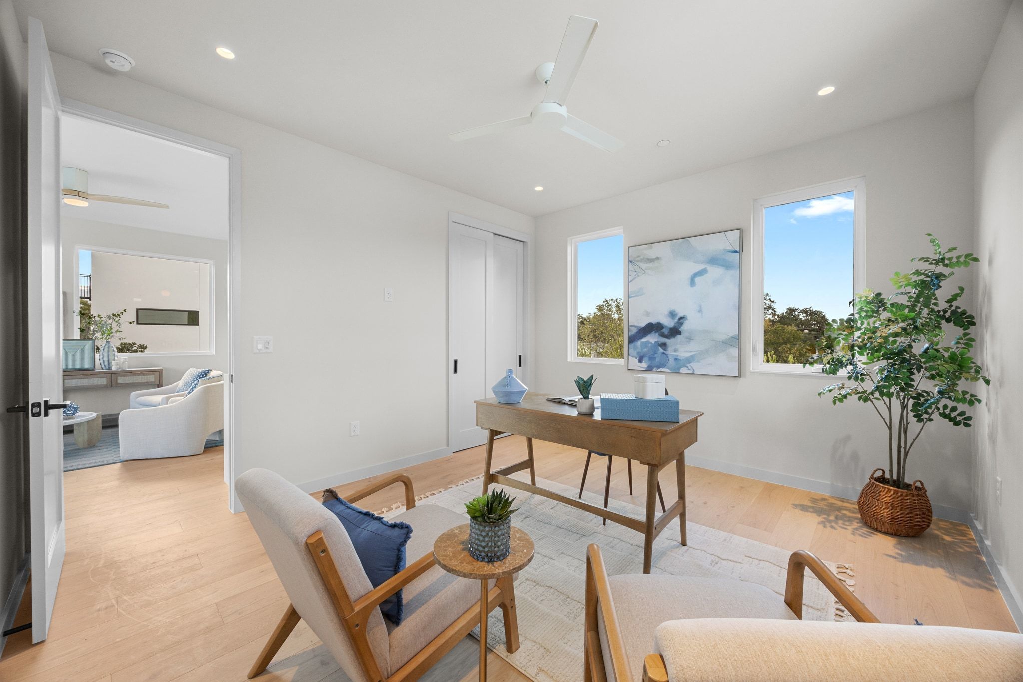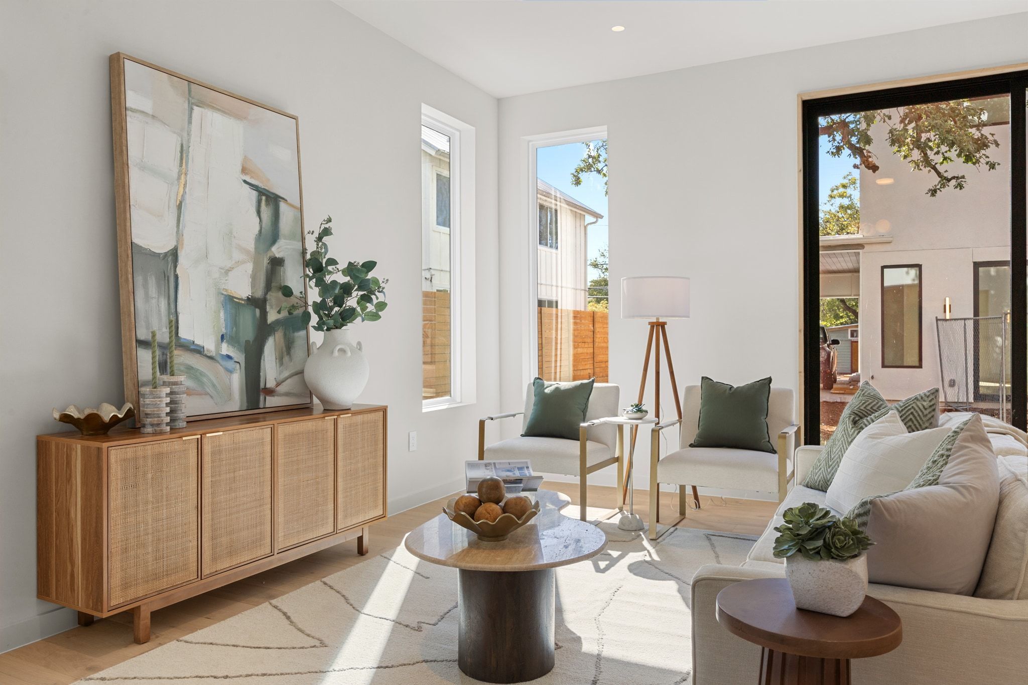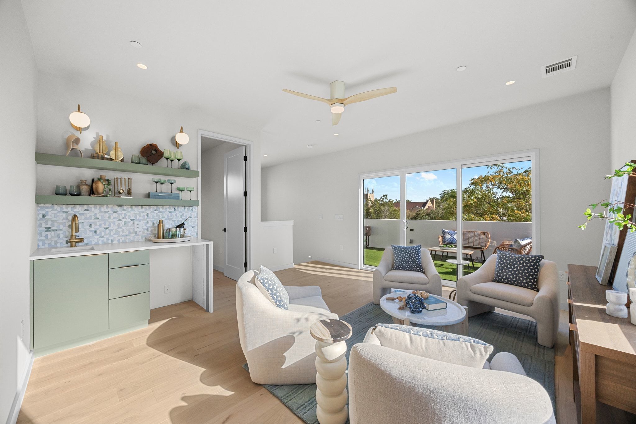 Experience the best of modern Austin living with panoramic views stretching from Rainey Street to the Capitol, the UT Tower, DKR Texas Memorial Stadium, and every landmark in between. Crafted by J Davis Construction, this brand-new three-story home perfectly balances sleek architectural design with warm and comfortable luxury. Step inside and be greeted by sunlit spaces framed by expansive windows and rich wood flooring. The open-concept main level flows effortlessly from a welcoming living area overlooking the backyard to a stunning kitchen featuring quartz countertops, an oversized island with bar seating, full-height cabinetry with pull-out drawers and underlighting, stainless steel appliances, and a pantry. A stylish modern half bath completes this floor for guests and convenience. On the second level, discover the serene primary suite, a true retreat with its spa-like ensuite bath, dual vanity, and a walk-in shower built for indulgence. Two additional bedrooms, each with their own closet space—share a sophisticated full bath, offering ideal flexibility for guests, a home office, or a creative studio. On the third floor you’ll find a spacious bedroom, full bath, and a versatile lounge with a wet bar that create the ultimate private hideaway or entertaining zone. Step out onto the balcony to take in the view—or head up just one more level to the home’s crowning jewel: a private rooftop deck with breathtaking 180-degree skyline views. Here, the city unfolds before you. Host unforgettable sunset gatherings, toast with friends under the stars, or simply unwind as the Austin skyline glows in the evening light. Rising gracefully among mature oak trees, this exceptional residence isn’t just a home—it’s an elevated lifestyle, perfectly positioned to capture the energy, beauty, and magic of East Austin. (NO MONTHLY FEES)