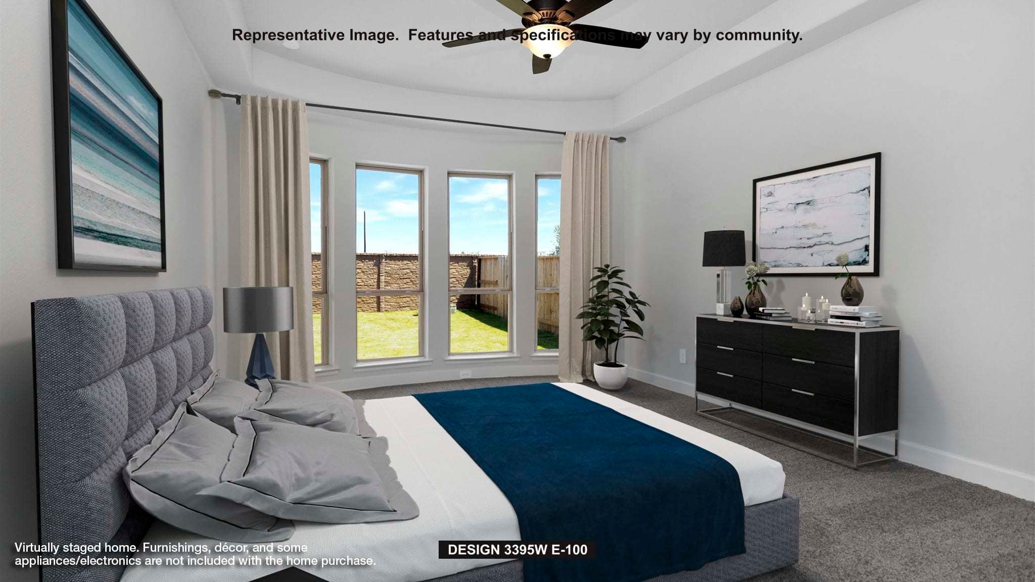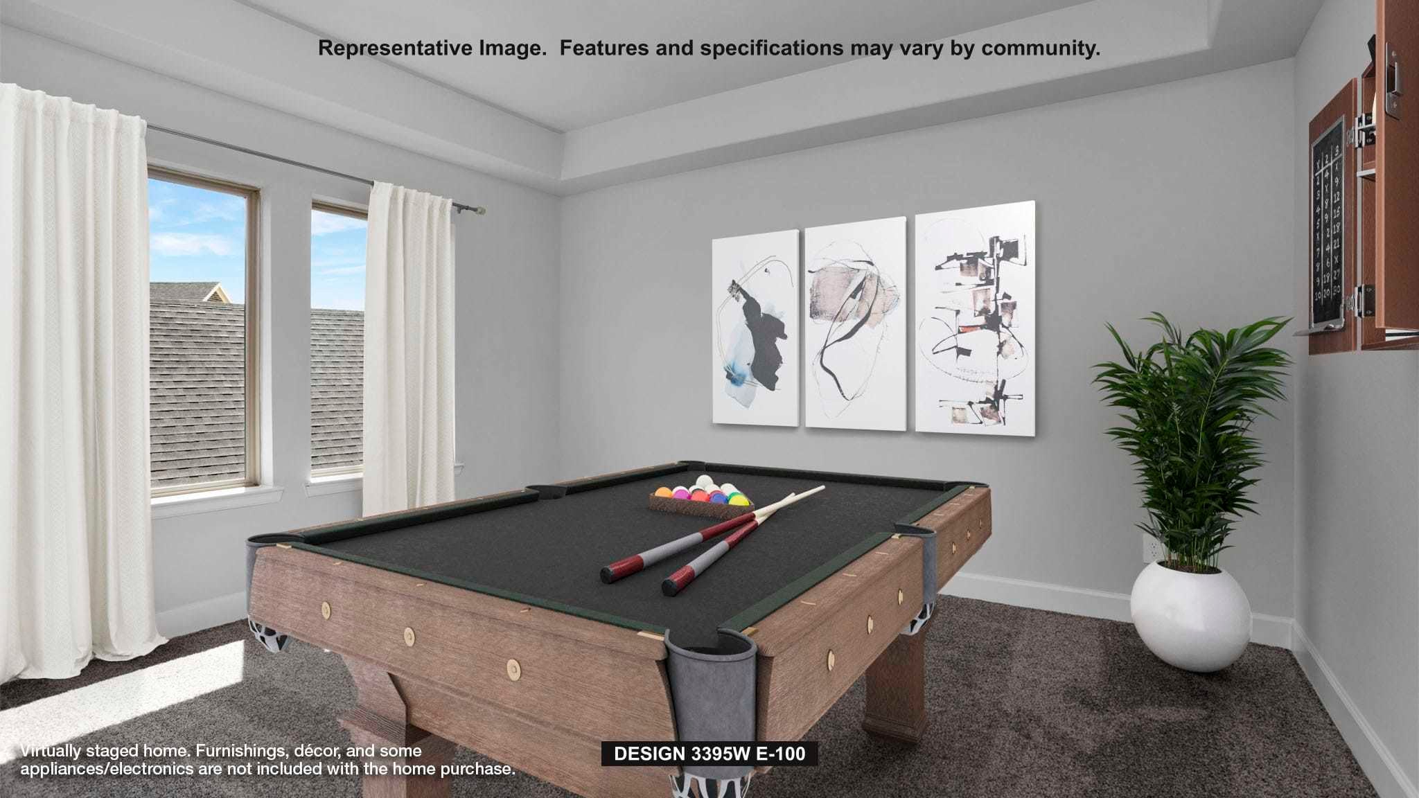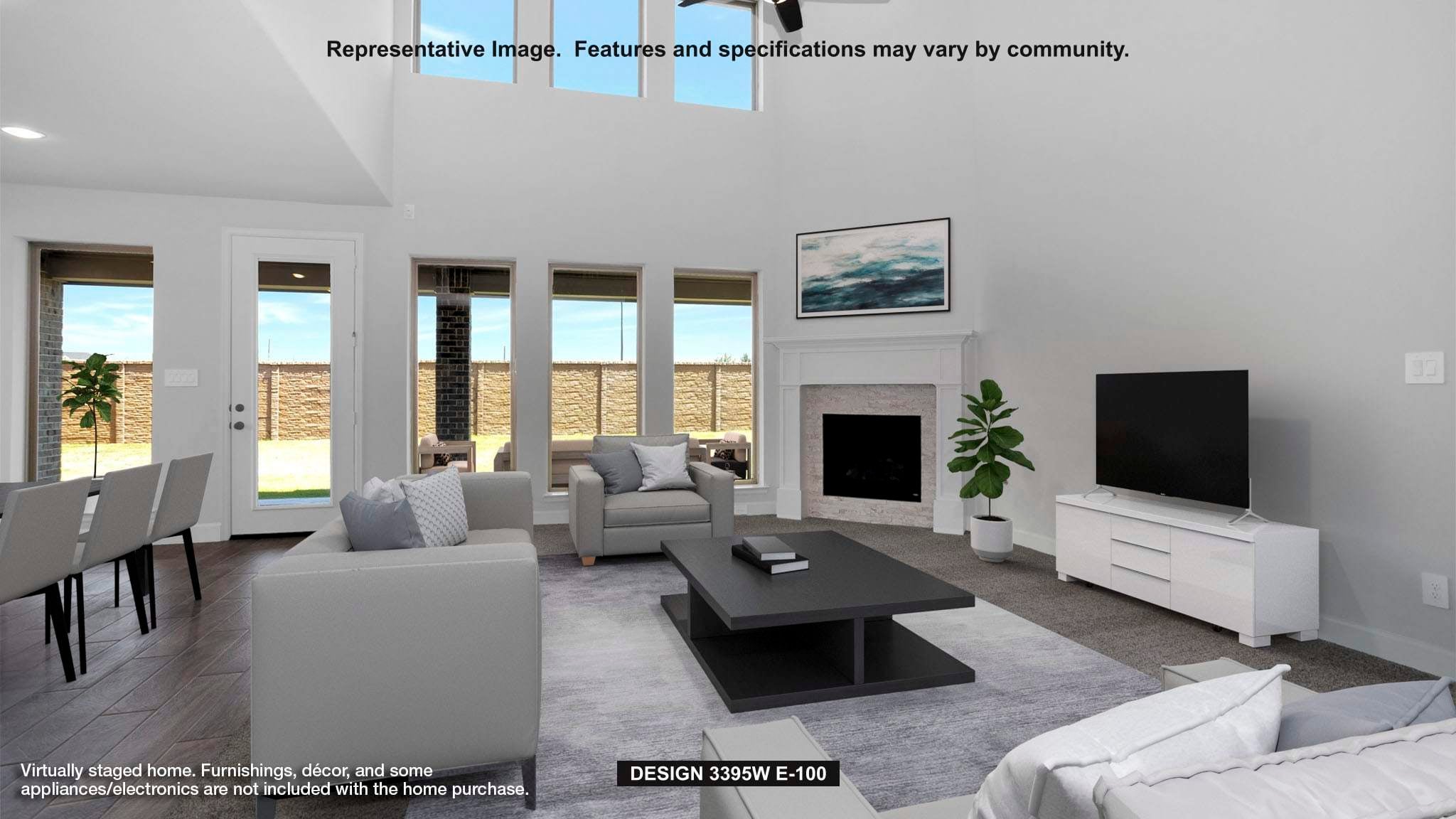 Home office with French doors set at entry with 20-foot ceiling. Formal dining room opens to rotunda with curved staircase. Two-story family room with 18-foot ceiling and wall of windows opens to kitchen and morning area. Kitchen hosts generous island with built-in seating space and a 5-burner gas cooktop. Primary suite with a wall of windows. Primary bath includes dual vanity, corner garden tub, separate glass-enclosed shower and large walk-in closet with access to utility room. First-floor guest suite. A game room, media room and two secondary bedrooms are upstairs. Extended covered backyard patio. Mud room off three-car garage.
