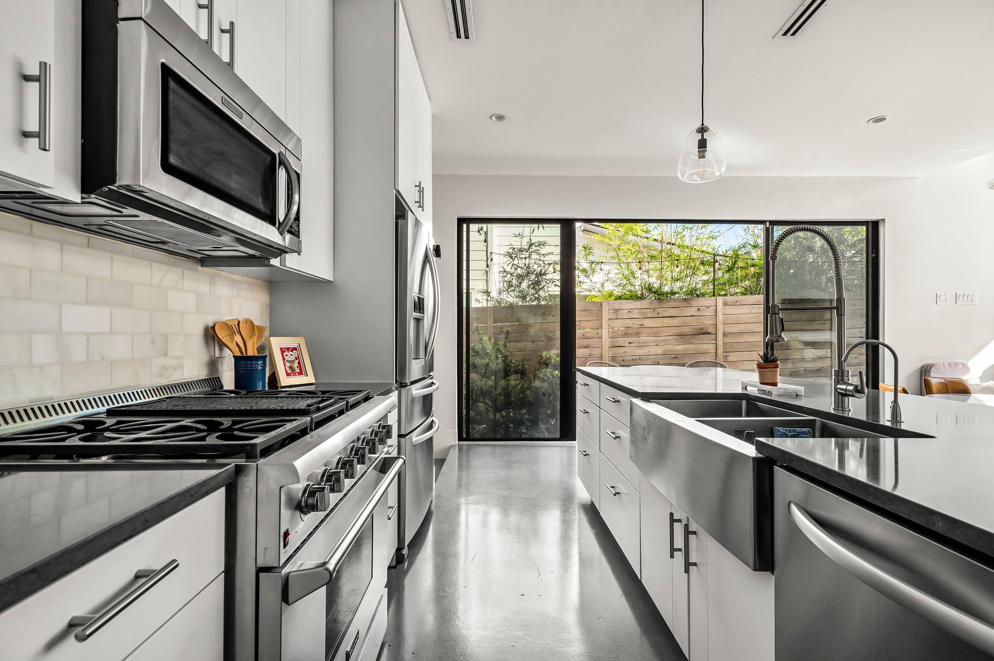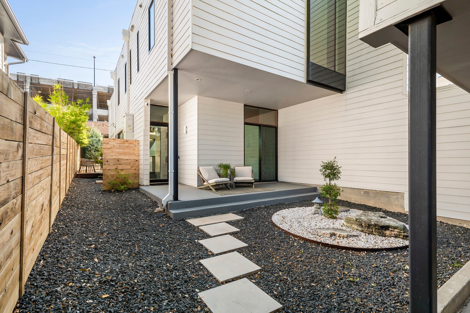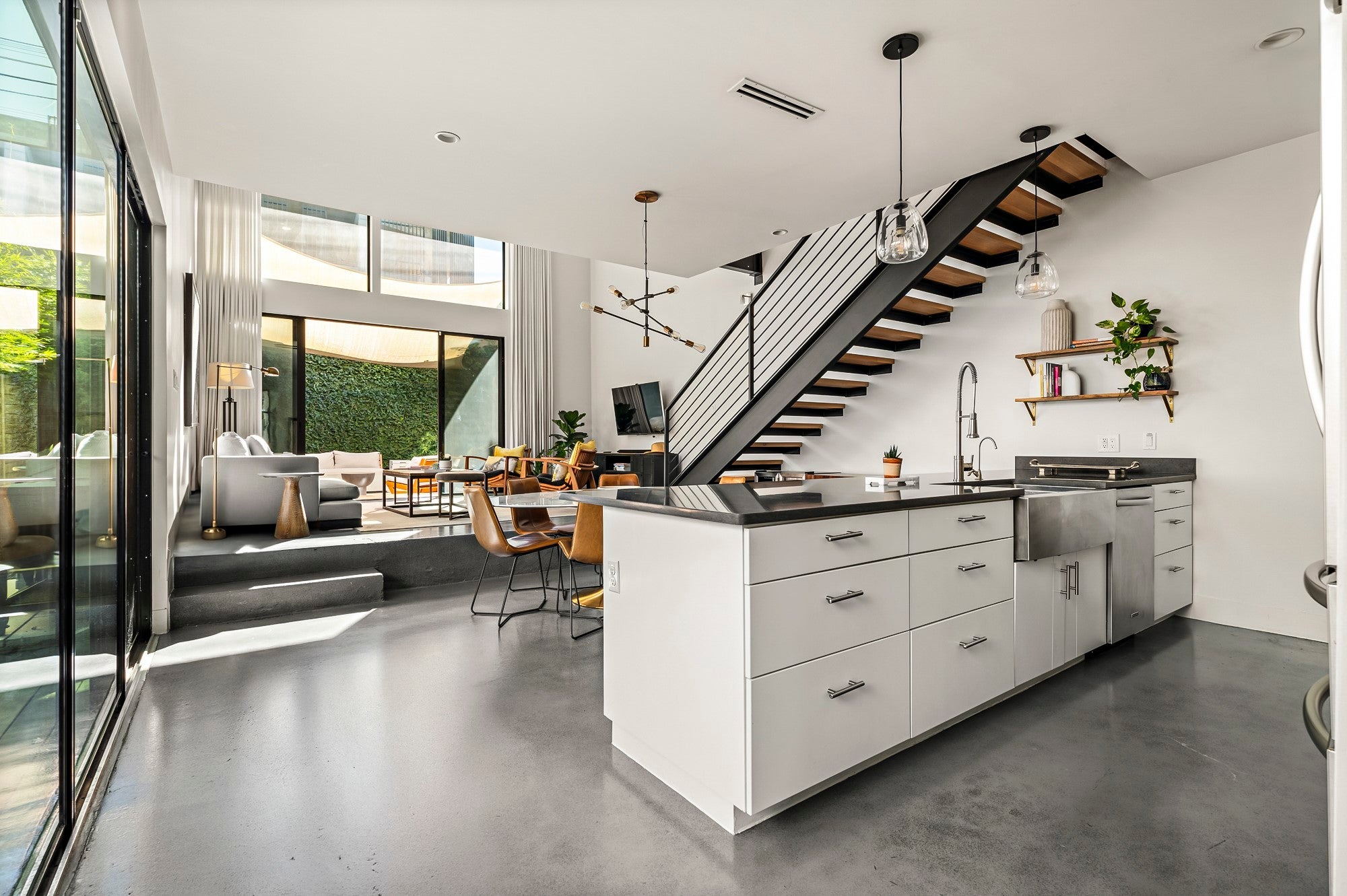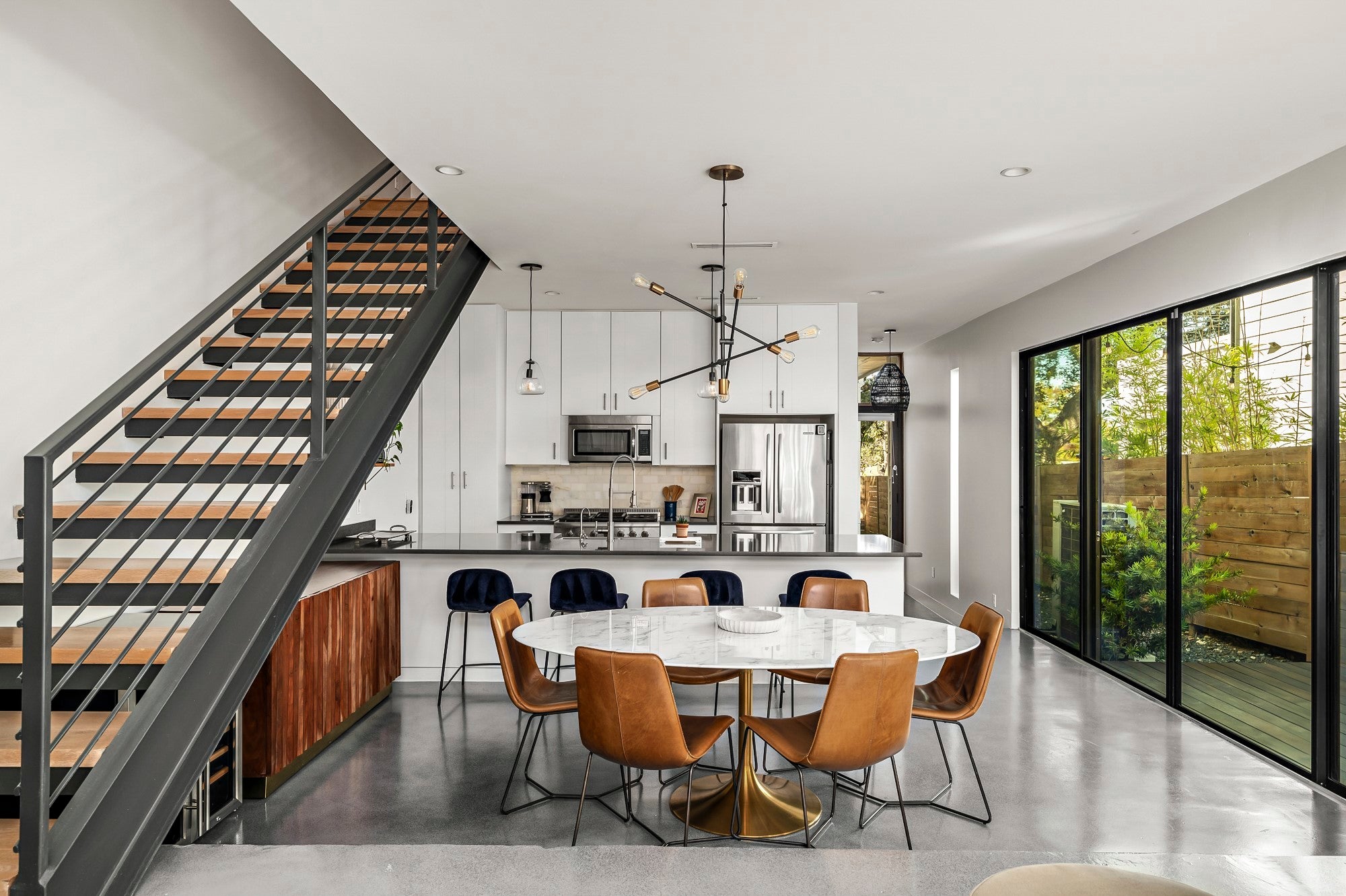 Positioned in the vibrant heart of Austin’s coveted South Austin 78704, this exceptional modern residence offers the rare combination of privacy, walkability, and urban energy. Set between South Congress and South First, the home places you directly within the rhythm of the South Austin lifestyle, where coffee shops, acclaimed restaurants, live music, parks, and everyday conveniences are right outside your door. Inspired by Danish simplicity, the architecture is clean, refined, and intentionally calming. Concrete floors on the main level create a sleek contemporary foundation, while wide plank white oak upstairs introduces warmth to the private living spaces. Floor to ceiling windows flood the interiors with natural light, highlighting the home's architectural lines and creating an open, airy atmosphere. The thoughtfully designed layout maximizes both function and flow. A sculptural floating staircase anchors the open concept living space, while expansive sliding glass doors extend the living area to a private backyard retreat ideal for entertaining or relaxing under the Austin sky. The gourmet kitchen features JennAir appliances, premium materials, and designer lighting and plumbing fixtures. The main level includes a private bedroom suite with its own ensuite bath, offering flexibility for guests or multigenerational living. Upstairs, two additional bedrooms each feature ensuite baths, while a versatile loft or office overlooks the living area below and provides an ideal work from home setting. Walk to local favorites including Simona's, The Wheel, Lucy's Fried Chicken, Freddo ATX, Habana, C Boys, Cosmic Pickle, Magnolia Cafe, Polvos, Teal House, Phoebe's Diner, The Meteor, Vinaigrette, and the open green space of Gillis Park. Impeccable craftsmanship, abundant natural light, thoughtful design, and an unbeatable South Austin 78704 location define this exceptional residence, a modern sanctuary in one of Austin's most vibrant neighborhoods.