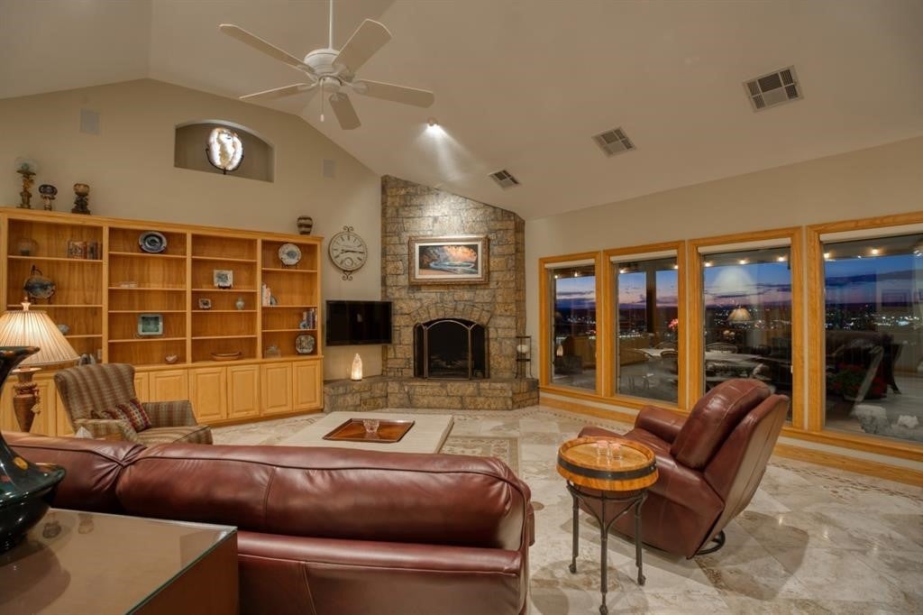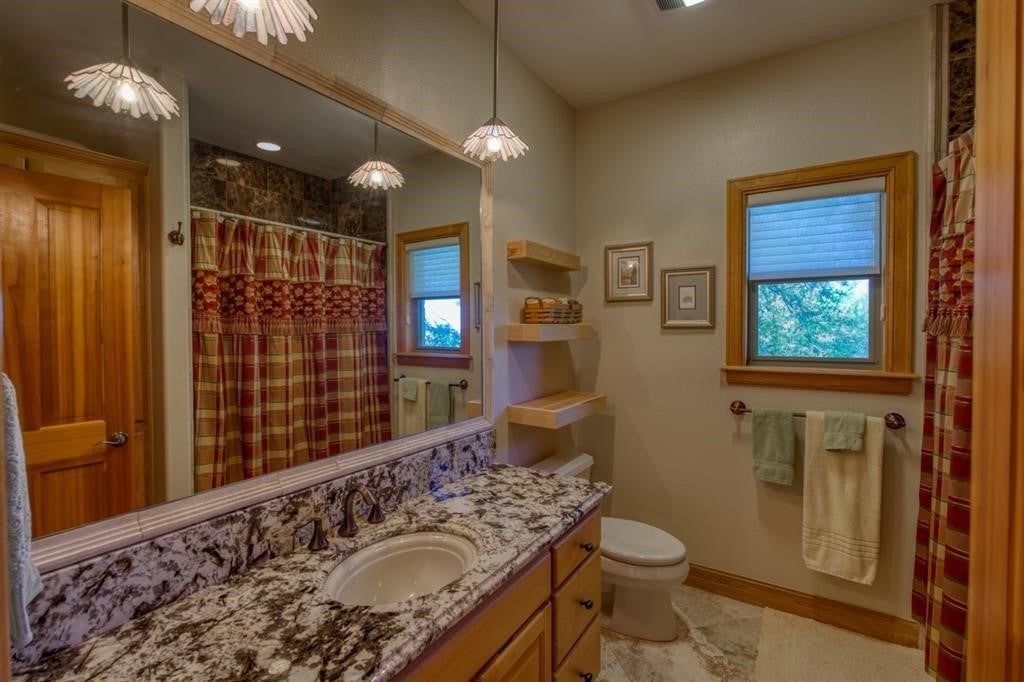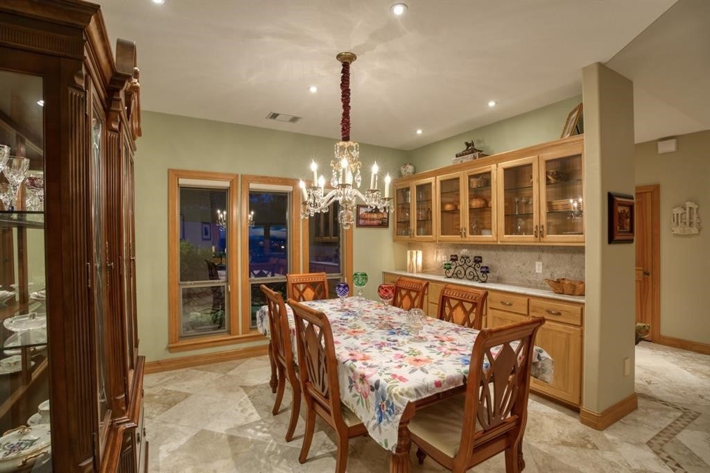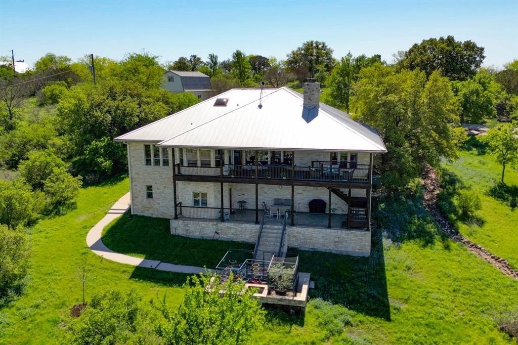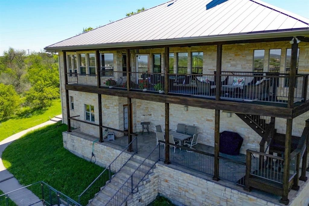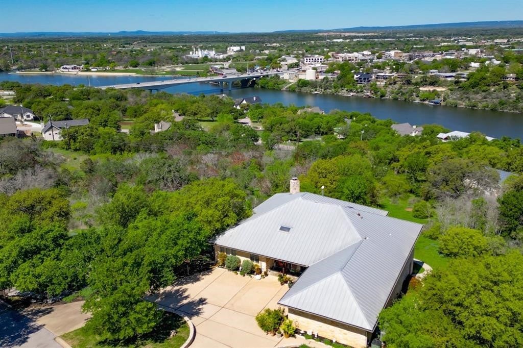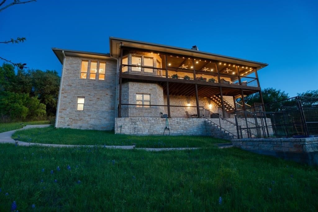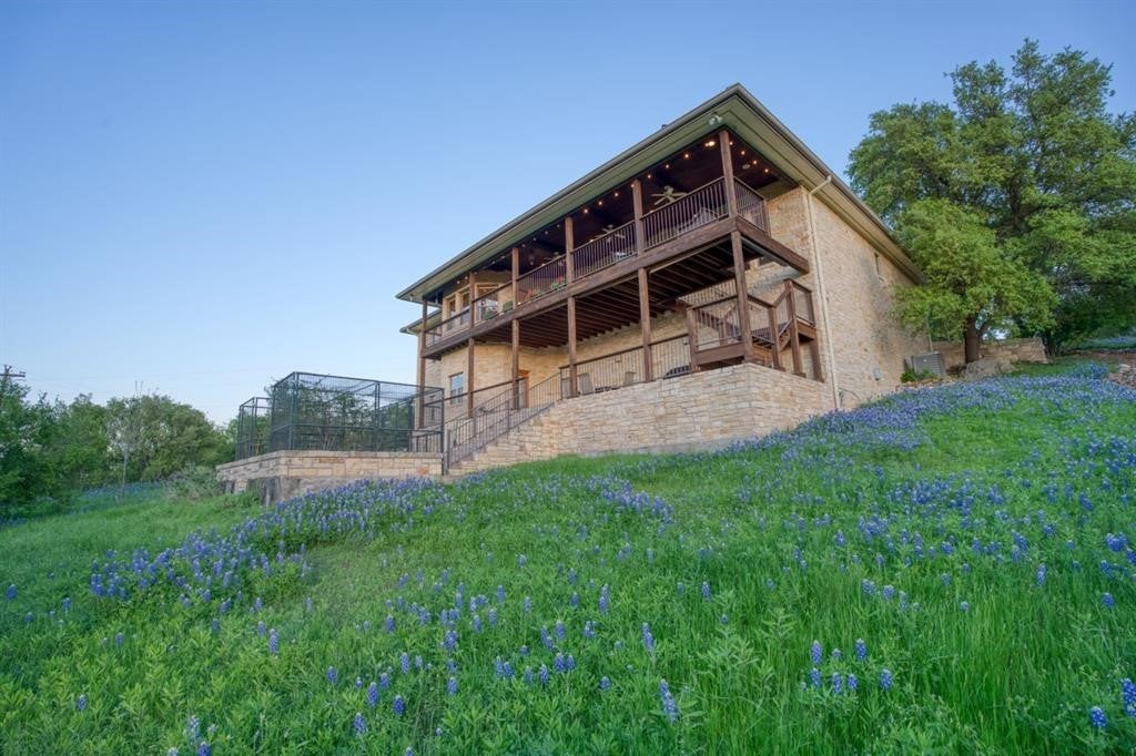 Luxurious Retreat Overlooking Lake Marble Falls Awaits You! Nestled on a sprawling 8.52-acre estate, this 3,167 square foot custom home is a masterpiece of design & privacy, offering unparalleled views of Lake Marble Falls, the Colorado River basin, & charming downtown Marble Falls. Designed for those who seek serenity and privacy, this property is ingeniously integrated into the hillside, providing a secluded oasis that is truly one-of-a-kind. As you enter this magnificent residence, you are greeted by an atmosphere of sophisticated luxury. The upper level serves as the heart of the home, featuring the exquisite primary suite, a formal dining room, a splendid breakfast nook, and a large open living area complete with a cozy stone fireplace. This space is perfect for entertaining or simply relaxing while soaking in the breathtaking views through expansive windows. The sound-proof home theatre promises unforgettable movie nights, while an additional bedroom, a second bathroom, a powder bath, & a well-appointed office complete the upper level. The seamless integration of indoor and outdoor spaces is exemplified by the upstairs balcony, offering an awe-inspiring panorama of the surrounding nature and lake below. Descending into the lower level, you'll find a one-bedroom suite with a full bathroom& a large office space, perfect for work & creative pursuits. The home's design ensures every room captures the tranquil essence of its natural setting. The estate is a haven for wildlife, with fruit and pecan trees. Texas wildflowers, & frequent sightings of deer, quail, & turkey. Enjoy the serenity of nature from the downstairs covered porch, an ideal spot for morning coffees or evening reflections; relaxing firepit. This home includes an attached 2-car garage, plus a unique HVAC-controlled room that can serve as a workshop or home canning/prep kitchen, equipped with a utility sink. Perfect off-grid location!