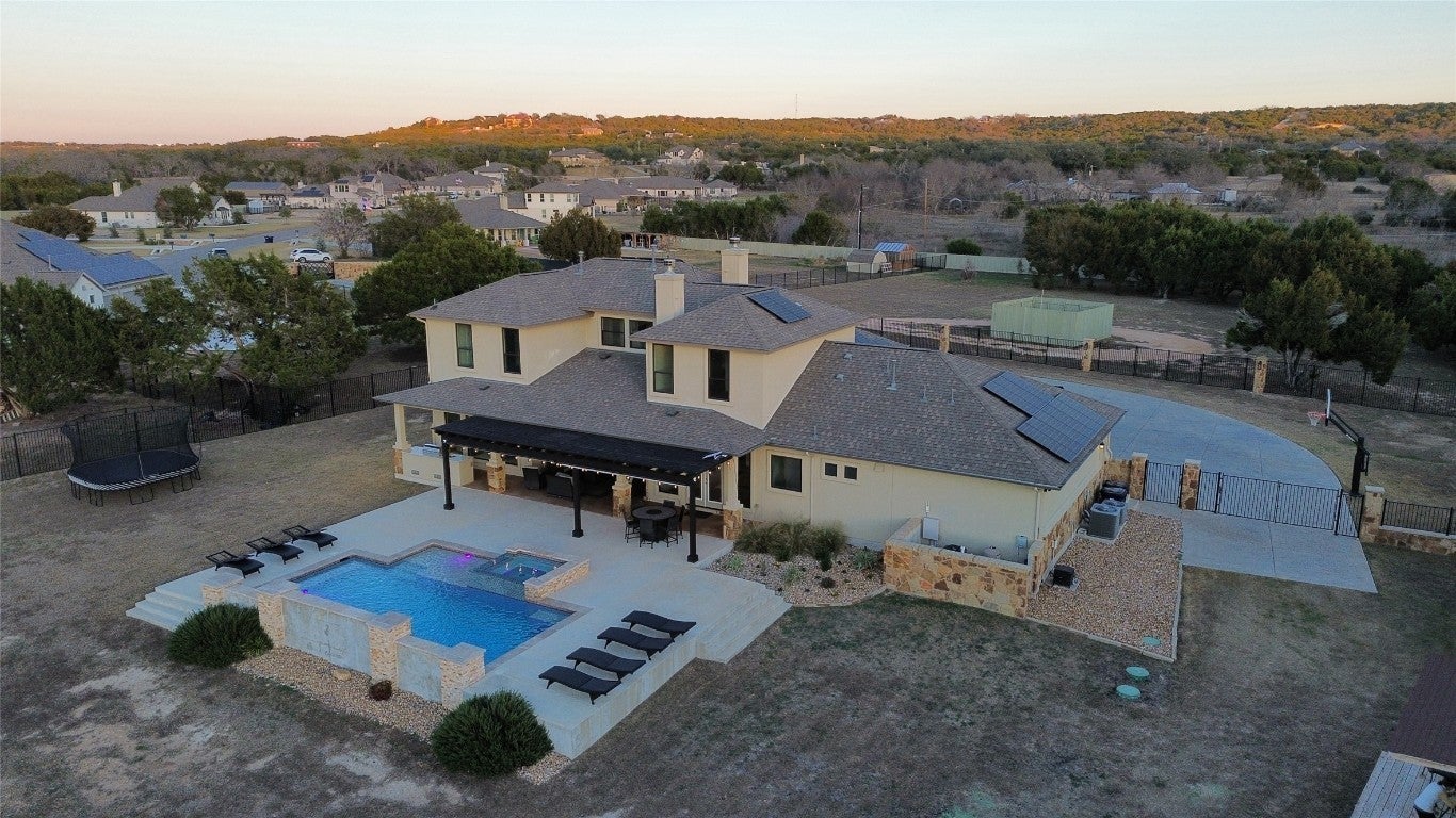 This isn’t just another resale—it’s a meticulously upgraded estate that offers more than a new build ever could. The experience starts at the gated stone entrance, where a lighted, salt-finished concrete drive leads you to a striking stone and stucco home on nearly two very private acres. Inside, the home is ready for a chef with a butlers pantry, double ovens and a five-burner cooktop, but the real magic happens out back. Spend your evenings on the covered porch or under the pergola overlooking the custom pool and spa while listening to the sounds of the built in waterfalls and sitting next to the crackling fire on the outdoor furniture that is included with the sale. The property line extends well beyond the fence to a private creek and natural wooded area, allowing your backyard view to stay peaceful and private. Best of all? You’re virtually off the grid with solar panels and two Tesla Powerwall batteries designed to provide up to 73% of the maximum electric power draw of the home. Parking and storage are abundant with garage spaces for 4 vehicles and a shed with plenty of room for your lawn and pool equipment. A water softener and purification system is located in the garage along with shelving and cabinetry.