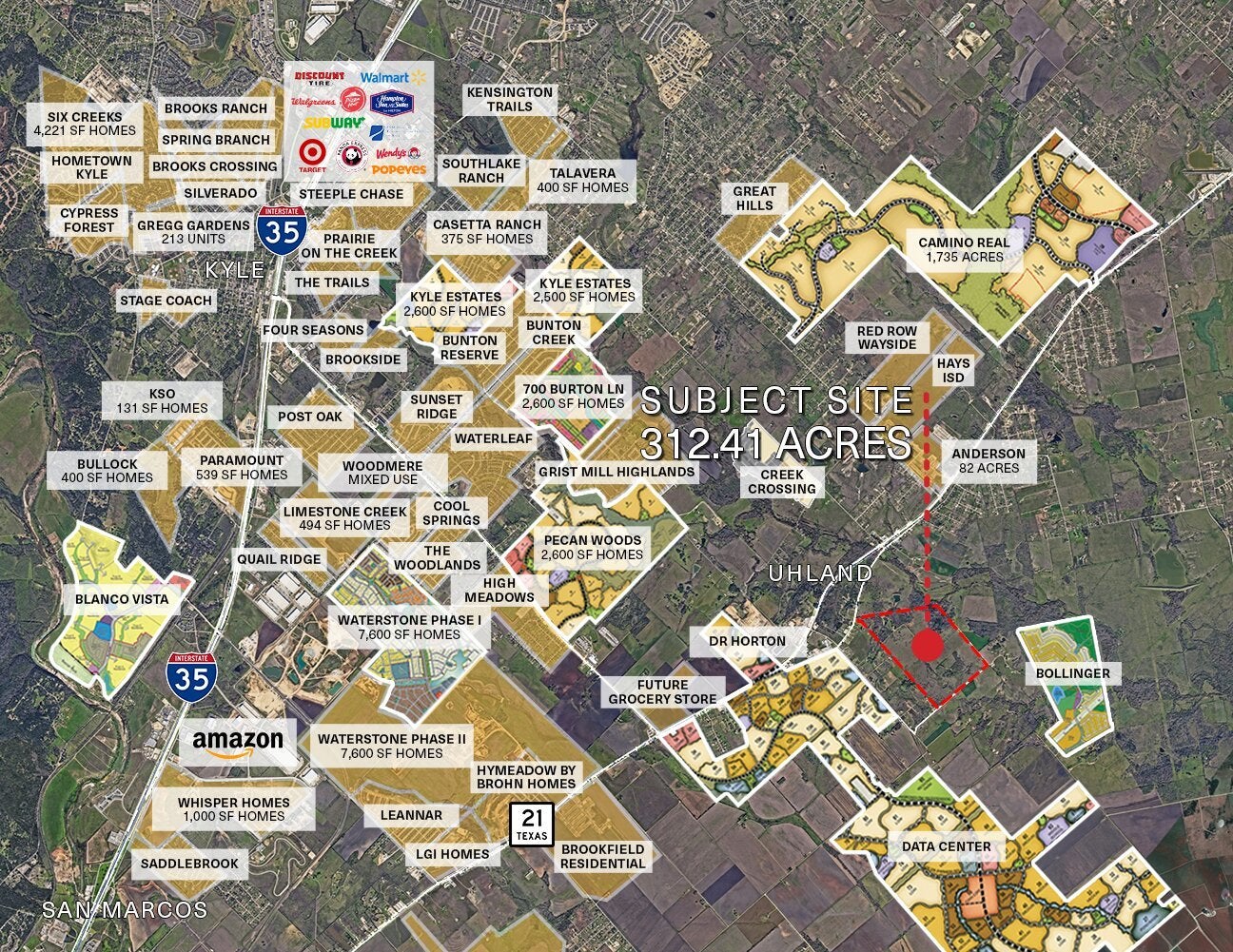 Gold Tier Real Estate is proud to present 272 acres in Uhland, Texas. Situated along the rapidly expanding Highway 21 corridor, this property is strategically located between the thriving cities of Kyle, San Marcos, Austin, and Lockhart. The area is experiencing significant growth, with national homebuilders securing over 3,000 residential lots in the immediate vicinity. The site offers access to two water lines (16” and 4”) and three-phase power. A developer will need to figure out a wastewater solution. The site has a significant amount of frontage on Cottonwood Trail and a small secondary access on S Old Spanish Trail. With a path towards utilities, the site is ideal for residential, industrial or mixed-use development.