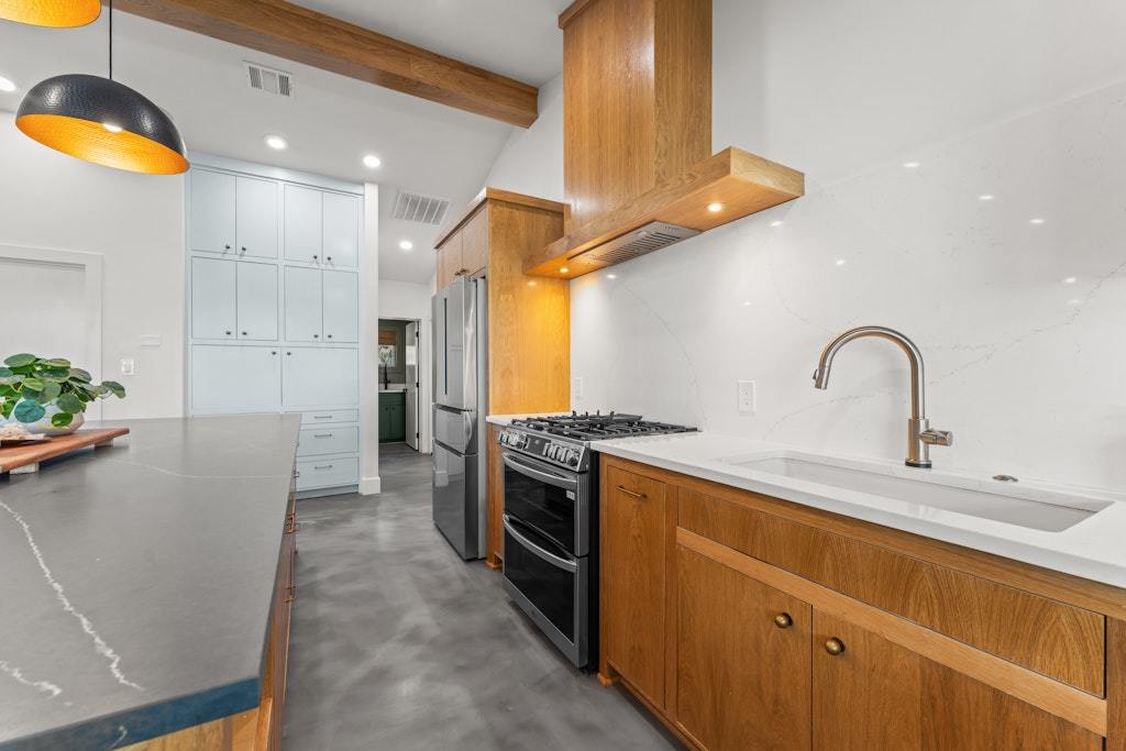 - Dryer, Dishwasher, Disposal, Range, Refrigerator, Range Hood, Tankless Water Heater, Vented Exhaust Fan, Washer, Built-In Gas Range