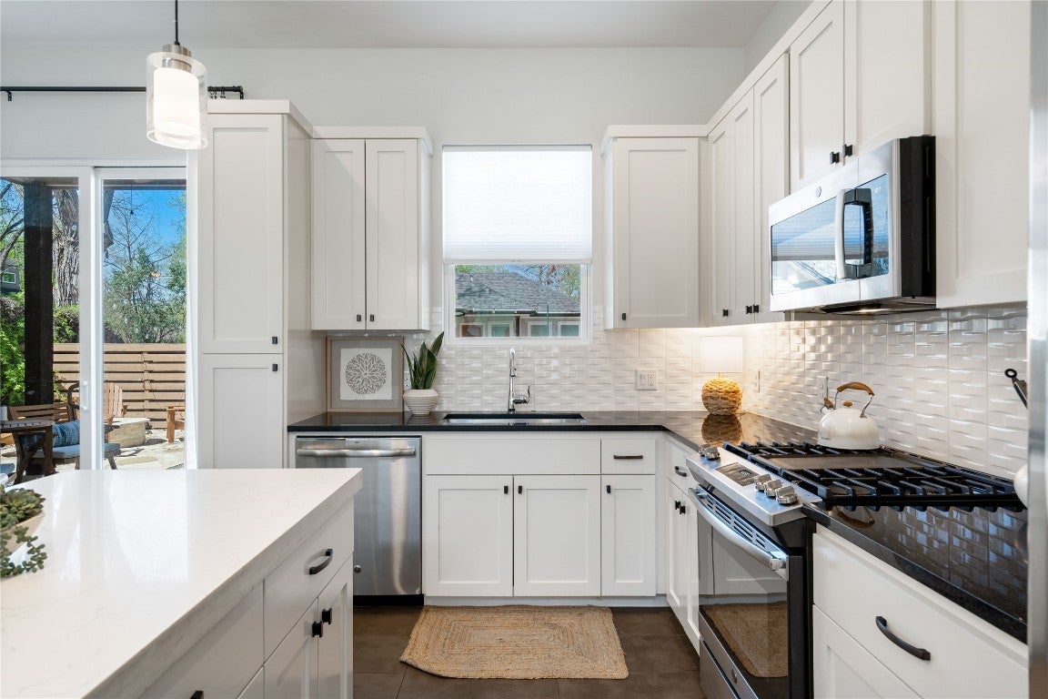- Dishwasher, Disposal, Gas Range, Microwave, Range Hood, Stainless Steel Appliance(s), Tankless Water Heater