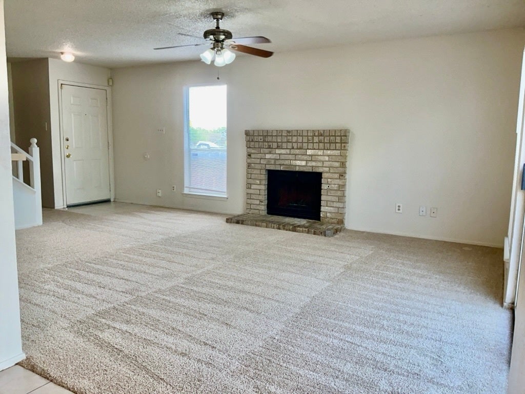 This spacious 3-bedroom, 3-bathroom duplex offers a comfortable layout with great features for everyday living. The home welcomes you with a covered front entry and opens to a large open-concept living room featuring a Decorative Fireplace—perfect for relaxing evenings. The living space flows into a separate dining area and kitchen, creating a functional layout for cooking and entertaining. Upstairs you'll find all three bedrooms. Bedrooms two and three feature an open-concept design with built-in vanities and share a Jack-and-Jill bathroom with elegant marble countertops. The large primary bedroom includes a beautiful bay window that fills the room with natural light, creating a bright and inviting space. The primary bathroom features double sinks, marble countertops, and a full bathtub. Outside, enjoy a private fenced backyard with a large shade tree and concrete patio, perfect for outdoor seating, entertaining, or relaxing.