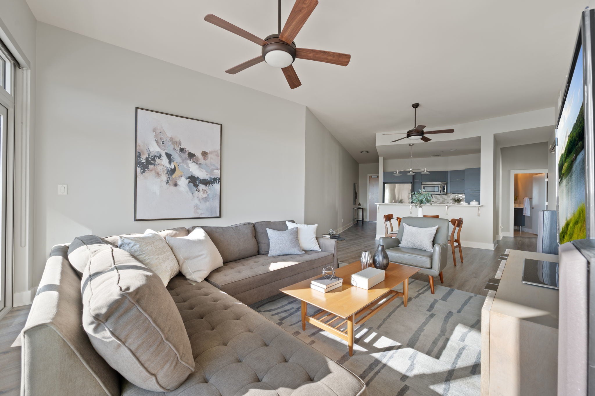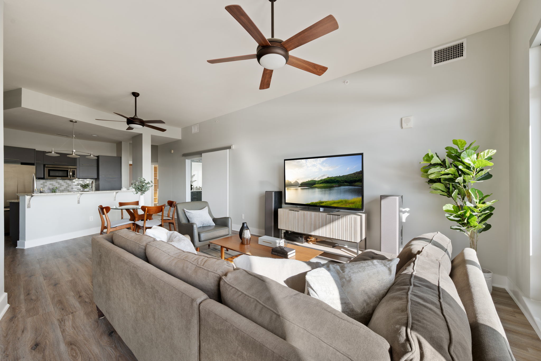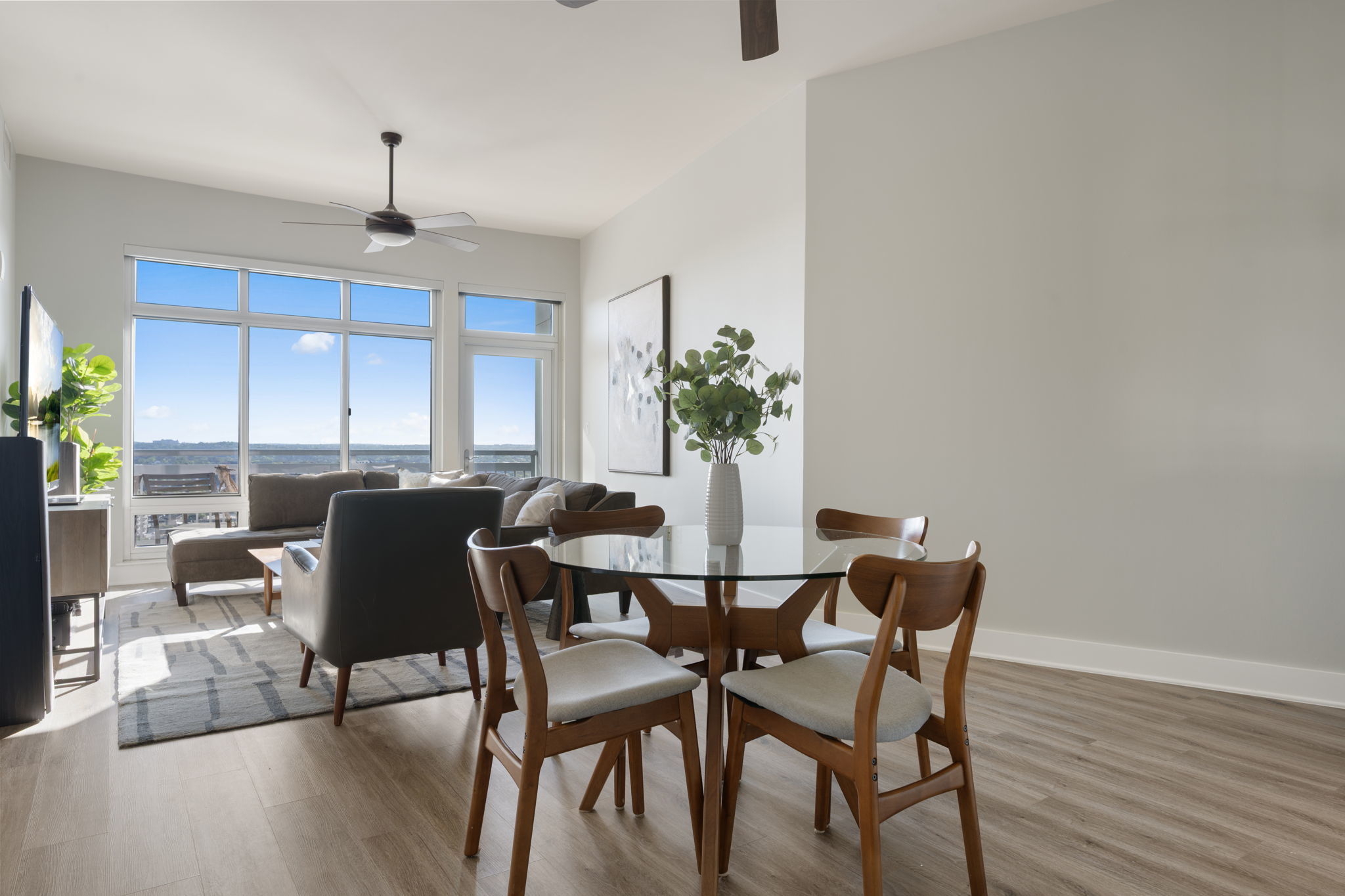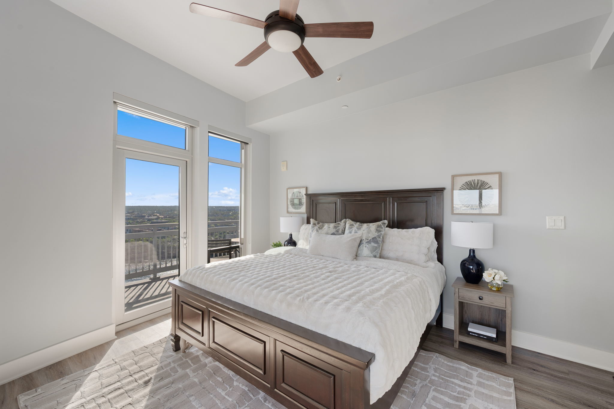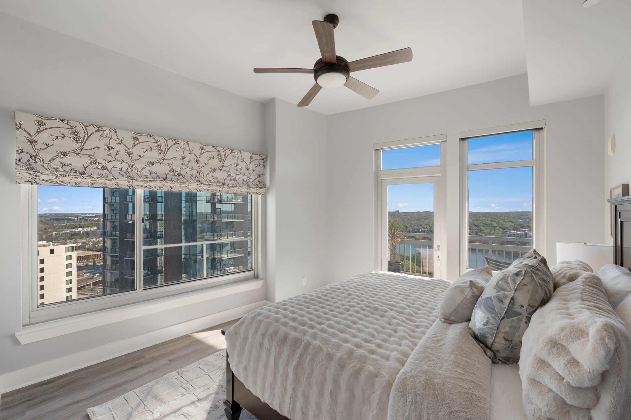 This stylish residence features upgraded hardwood flooring throughout, natural stone countertops with an upgraded backsplash, and seamless glass showers in both bathrooms. The primary suite offers a dual vanity and a refined spa-like feel. The thoughtfully designed second bedroom includes a built-in Murphy bed—perfect for a turnkey guest room or a flexible office space without sacrificing functionality. Step out onto your private balcony to enjoy downtown views, or take advantage of The Shore’s premier location—just steps from Lady Bird Lake, the Hike & Bike Trail, Rainey Street District, top-rated restaurants, nightlife, and minutes from the East Side. Residents enjoy luxury amenities including a fitness center and pool deck, making this an ideal urban retreat in the heart of Austin.