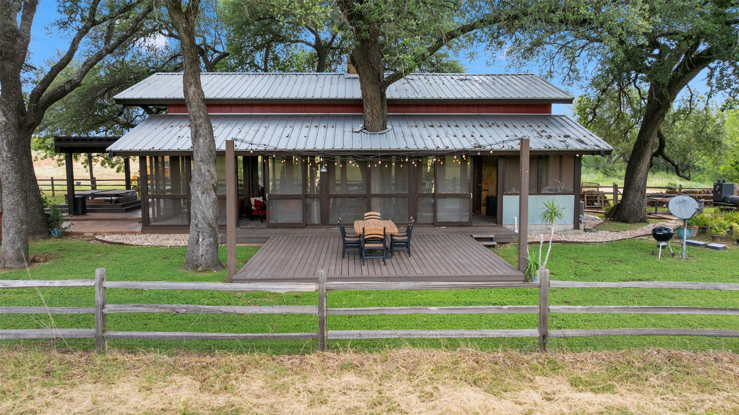 Prime Ranch location, approximately 400 +/- acres on Hwy 71, right off 2147. Multiple properties on the ranch. Unique main property with 25-foot vaulted ceilings with wraparound porches surrounded by French doors opening to hill country views. Gourmet kitchen with stainless steel appliances, dining area, loft bedroom area, several seating areas, a Party hot tub, enormous fire pit, and a three-car carport. The entire property is fenced, with several small lakes, a hunting pavilion with a half bath, electrical, and storage. Two service properties and one caretaker's home. Plus barn & greenhouse.