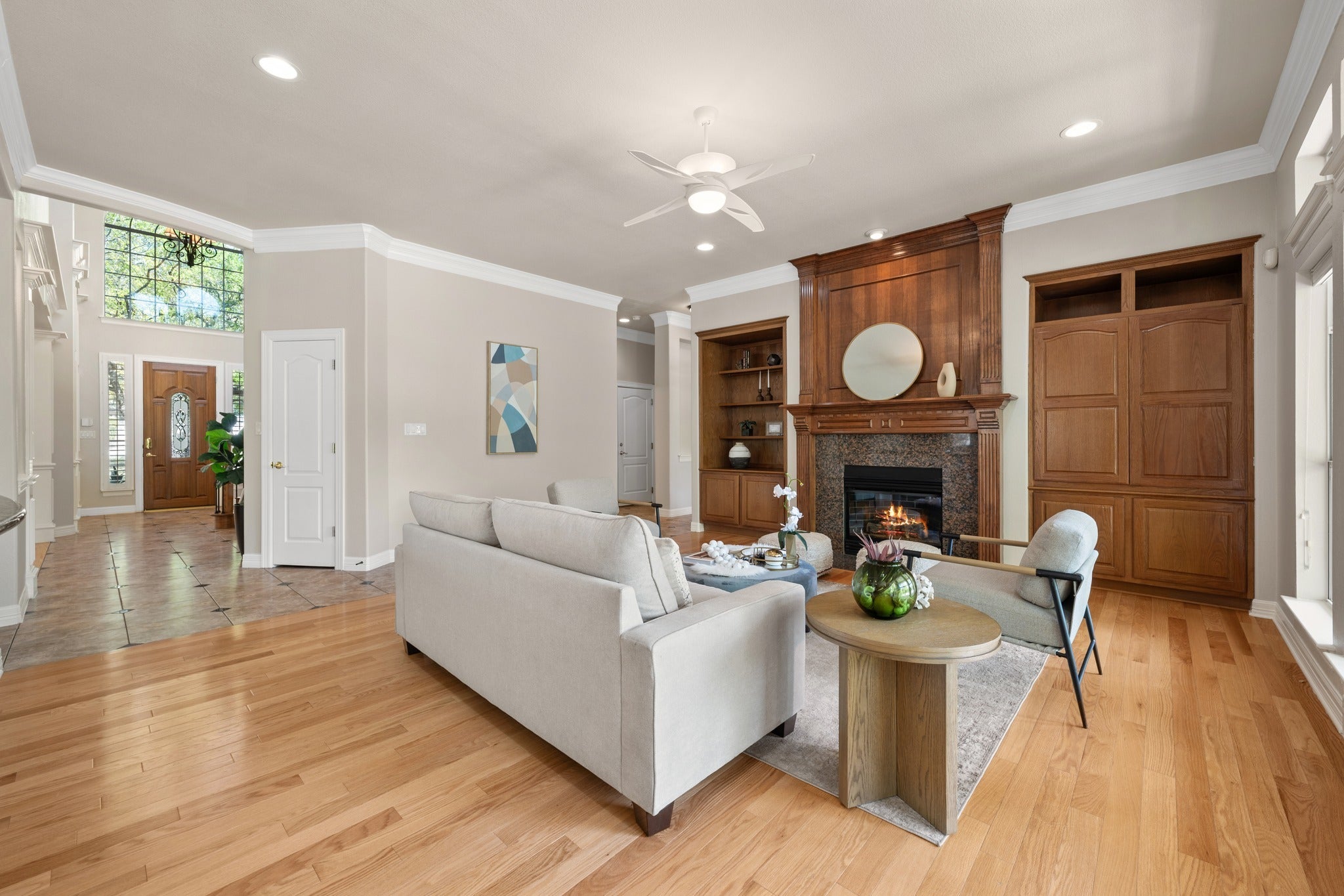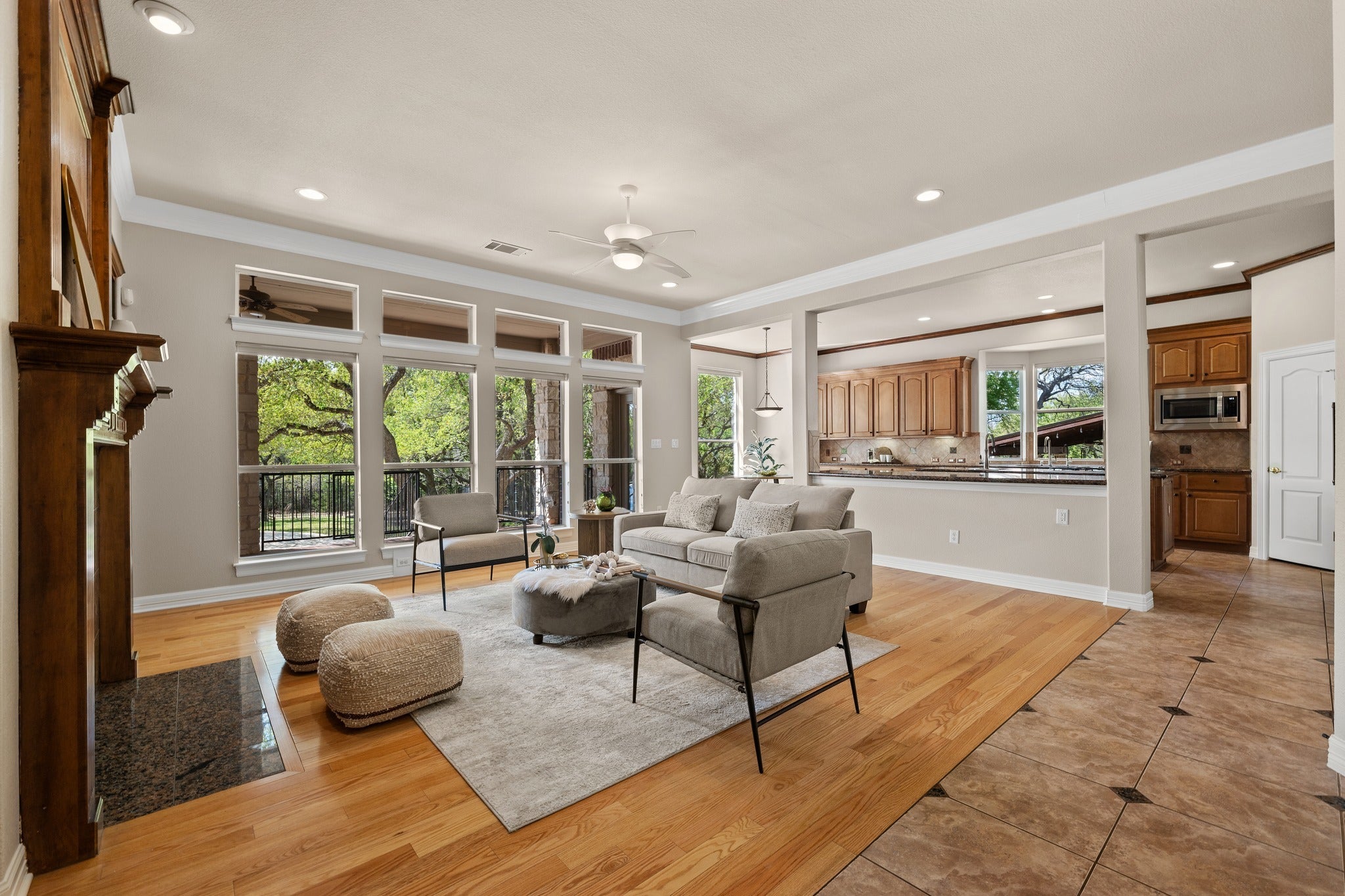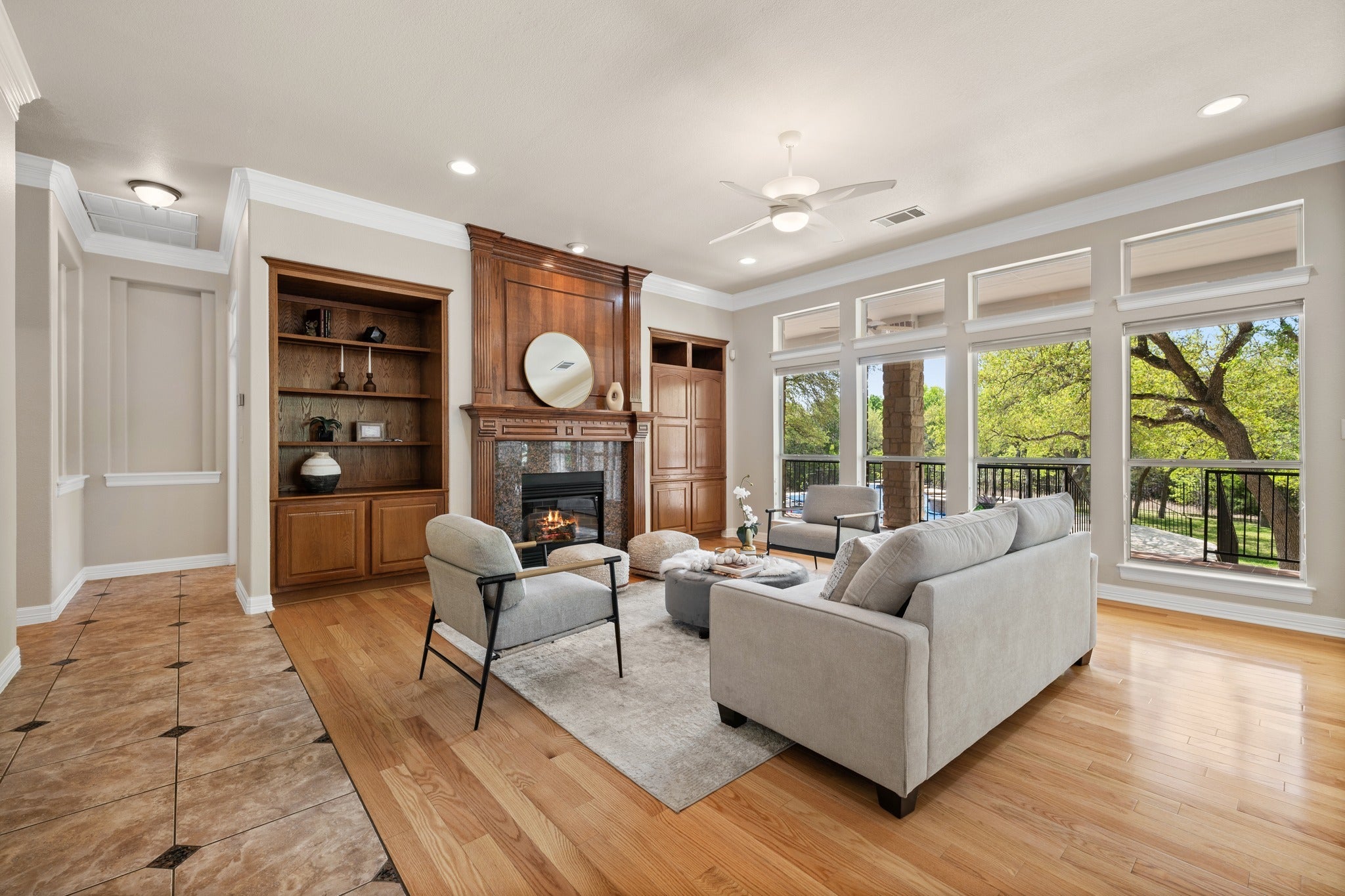 Experience refined luxury and serene natural beauty in this stunning 4,527 sq ft estate, perfectly situated on a private half-acre lot backing to a spring-fed creek and lush greenbelt. Surrounded by mature trees, this exceptional property offers the ultimate in privacy, tranquility, and upscale living. Thoughtfully designed, the two-story layout features a spacious primary suite on the main level, with additional bedrooms upstairs. Expansive windows fill the home with natural light, highlighting the rich oak floors and fresh updates, including new paint and carpeting. Step outside to your own private retreat, complete with a heated pool, outdoor grill, and elegant Lueder limestone hardscaping—ideal for both entertaining and quiet relaxation. A rare opportunity to own a luxury home that seamlessly blends comfort, style, and breathtaking natural surroundings.