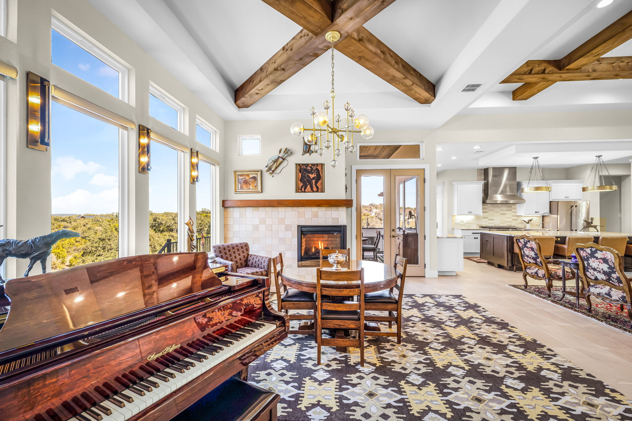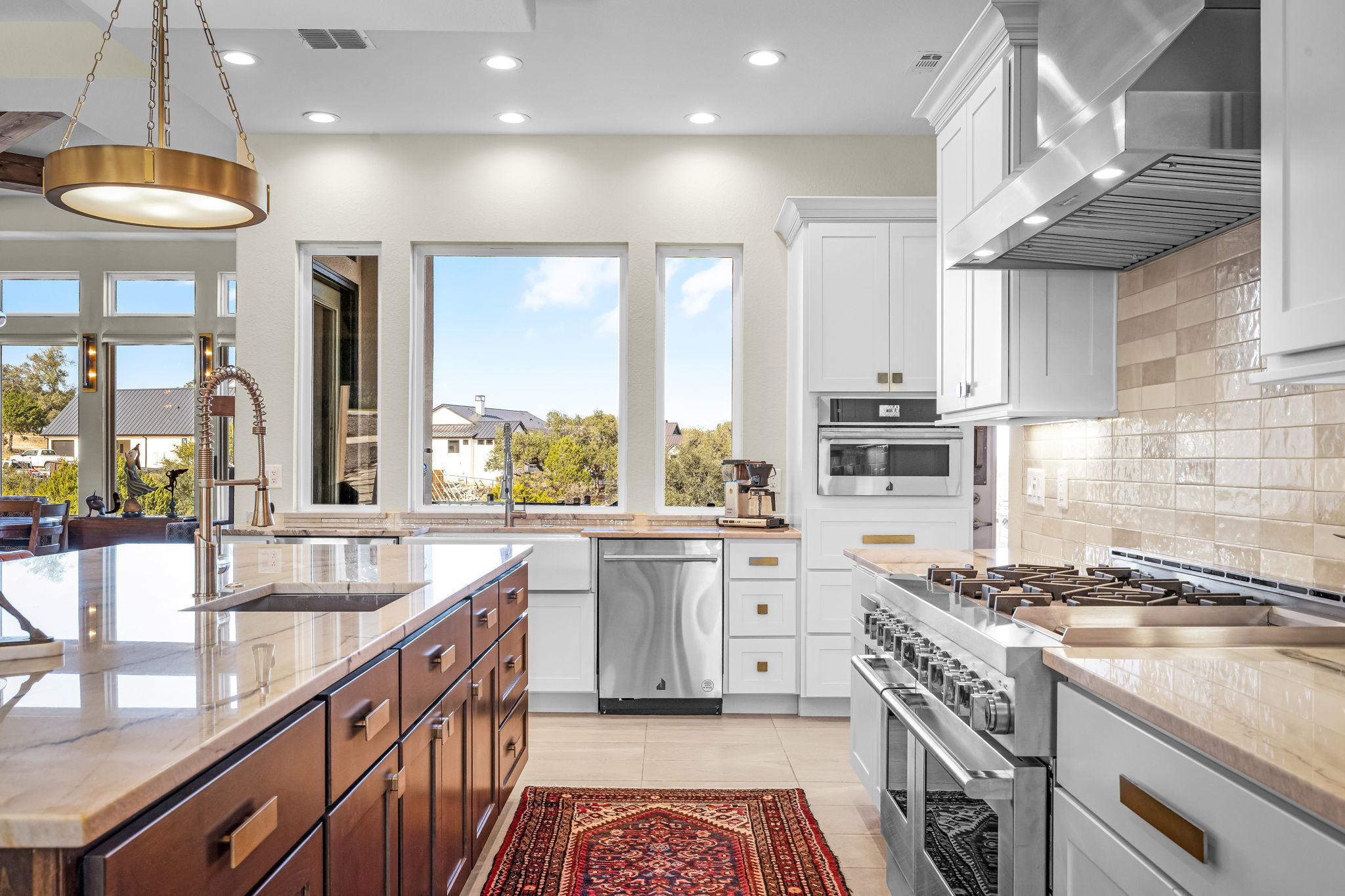 Nestled on a serene cul-de-sac in prestigious Vintage Oaks, 368 Butternut Way is an exceptional KC Custom home set on a private 2.22-acre greenbelt lot with sweeping Hill Country views. This 4-bedroom, 3-bath, 3,576 sq ft residence blends Frank Lloyd Wright–inspired design with modern efficiency and craftsmanship. A beautifully xeriscaped front yard and inviting courtyard with a Zsolnay fountain create a striking welcome. Inside, soaring ceilings with cedar beams, French art deco lighting, and abundant natural light define the space. Tile flooring flows through the main living areas, while rich hardwood enhances the bedrooms, including one with built-in shelving ideal for a study or office. The open-concept living area features a gas fireplace and a dramatic wall of windows overlooking the lush greenbelt. The chef’s kitchen showcases Benedettini custom cabinetry, quartzite countertops, JennAir appliances, a 6-burner gas range, double ovens, dual dishwashers, oversized island, secondary farm sink, and a fully shelved walk-in pantry with an additional refrigerator. Energy efficiency is elevated with a 10.75 kW solar system and Tesla Powerwall 3, providing reliable, low-cost energy year-round. The primary suite offers tranquil views and a custom closet that doubles as a secure safe room. Outdoor living is unmatched with a pavilion room featuring cedar beams and a gas fire table, resort-style pool, 1,200+ sq ft patio, and a fully equipped outdoor kitchen, all surrounded by mature oaks and native landscaping. Enjoy Vintage Oaks’ resort amenities, with an adjacent 1.19-acre lot also available.