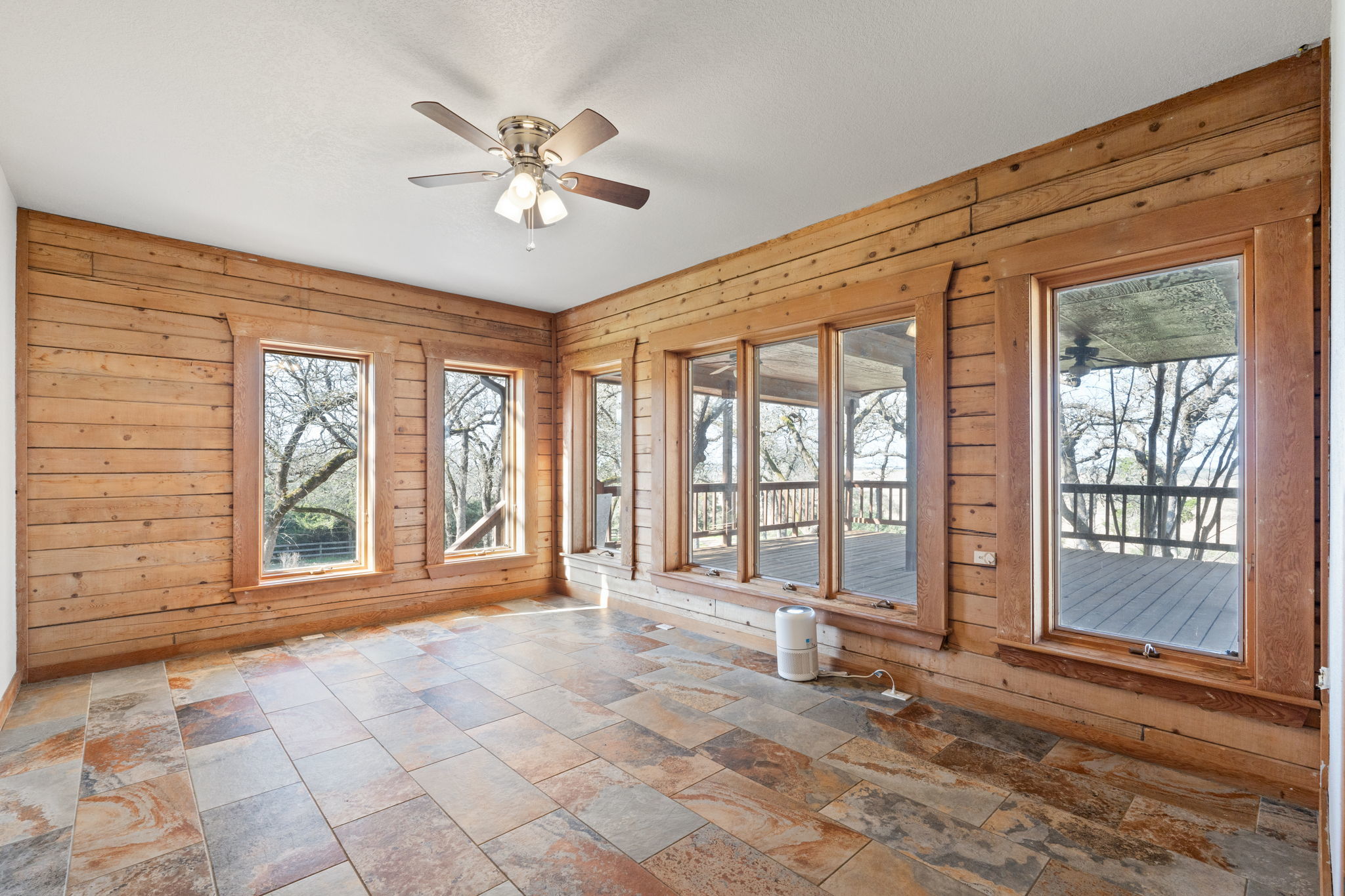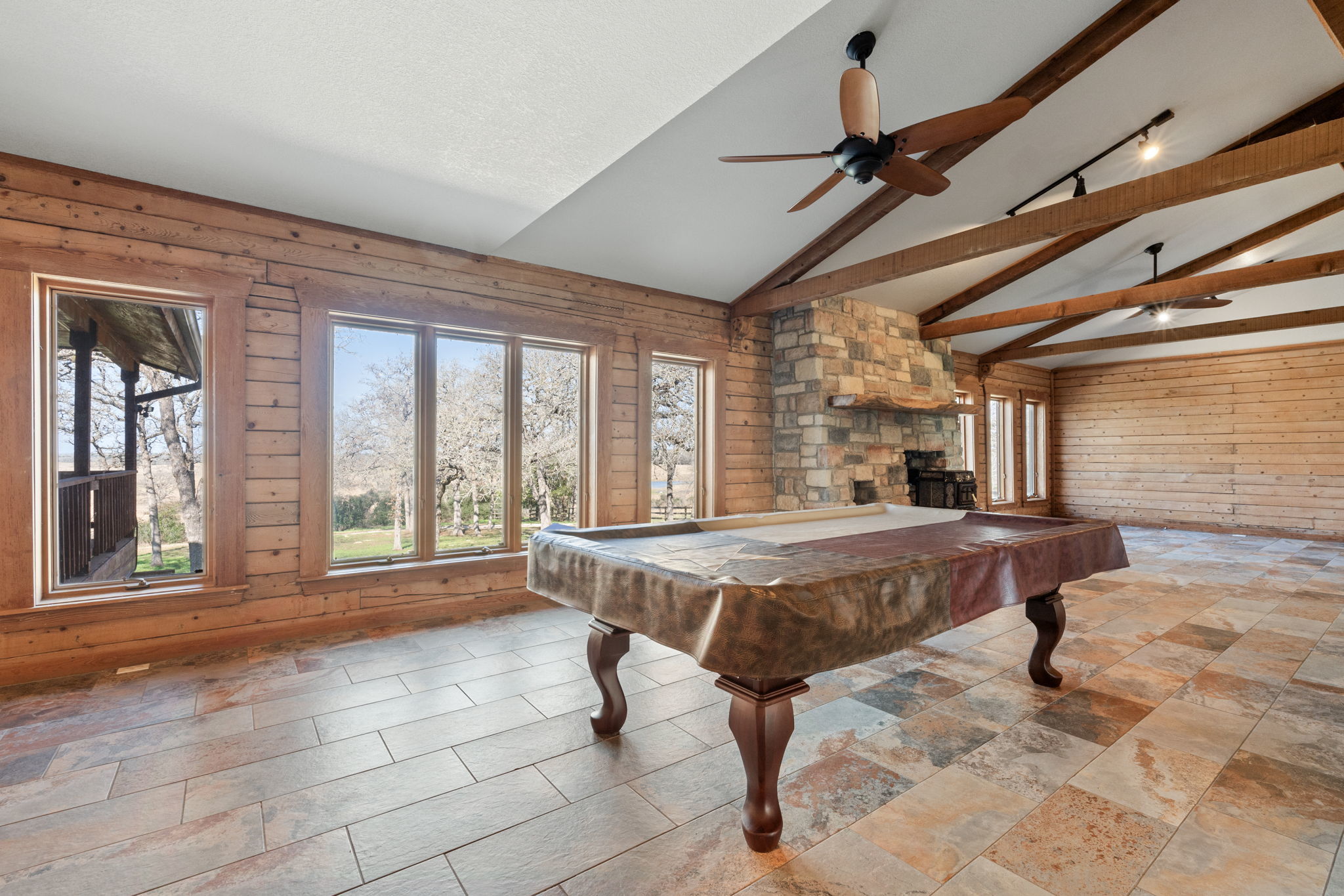 Tucked away on a private driveway, this serene log cabin offers breathtaking views of acres of rolling hills, making it the perfect escape from the hustle and bustle of daily life. Featuring expansive balconies, a sunroom with 10-foot glass windows, and a peaceful, wooded landscape ideal for hiking or horseback riding, this home is a true sanctuary that combines privacy and convenience. Whether you're relaxing on the huge balcony enjoying the stunning views of the adjoining ranch, exploring the woodlands, or enjoying the comfort of this well-appointed cabin, this property promises the ultimate peaceful retreat. Inside, you'll find 3 separate AC heating units to maintain the perfect temperature year-round, as well as 2 cozy wood fireplaces for a warm, inviting ambiance. The chef-inspired kitchen boasts granite countertops, a spacious butcher block central island w/storage, top-of-the-line appliances including a Dynasty gas stove w/7 burners, Samsung fridge, and Bosch microwave, and a large walk-in pantry. There is also a beautiful enclosed sunroom/office on the back of the home w/floor to ceiling windows, slate floors in most rooms, wood beams, tongue/groove wood ceilings and accent walls add to the charm! For outdoor enthusiasts and animal lovers, the property is set up for horses with a walk-in stable, storage barn, and three outbuildings: a workshop, horse storage, and a general storage barn. A dedicated dog yard with year-round artificial turf offers convenience for pet owners, and the carport area includes a 220 plug-in for EV hookups. Perfect for entertaining, the home includes a pool table in the game room area, two wood fireplaces, and ample space for hosting guests. Located just 25 minutes from Austin-Bergstrom International Airport, SpaceX, Twitter, the Boring Company, and 45 minutes from Tesla and the new advanced Terafab building at Giga Texas!