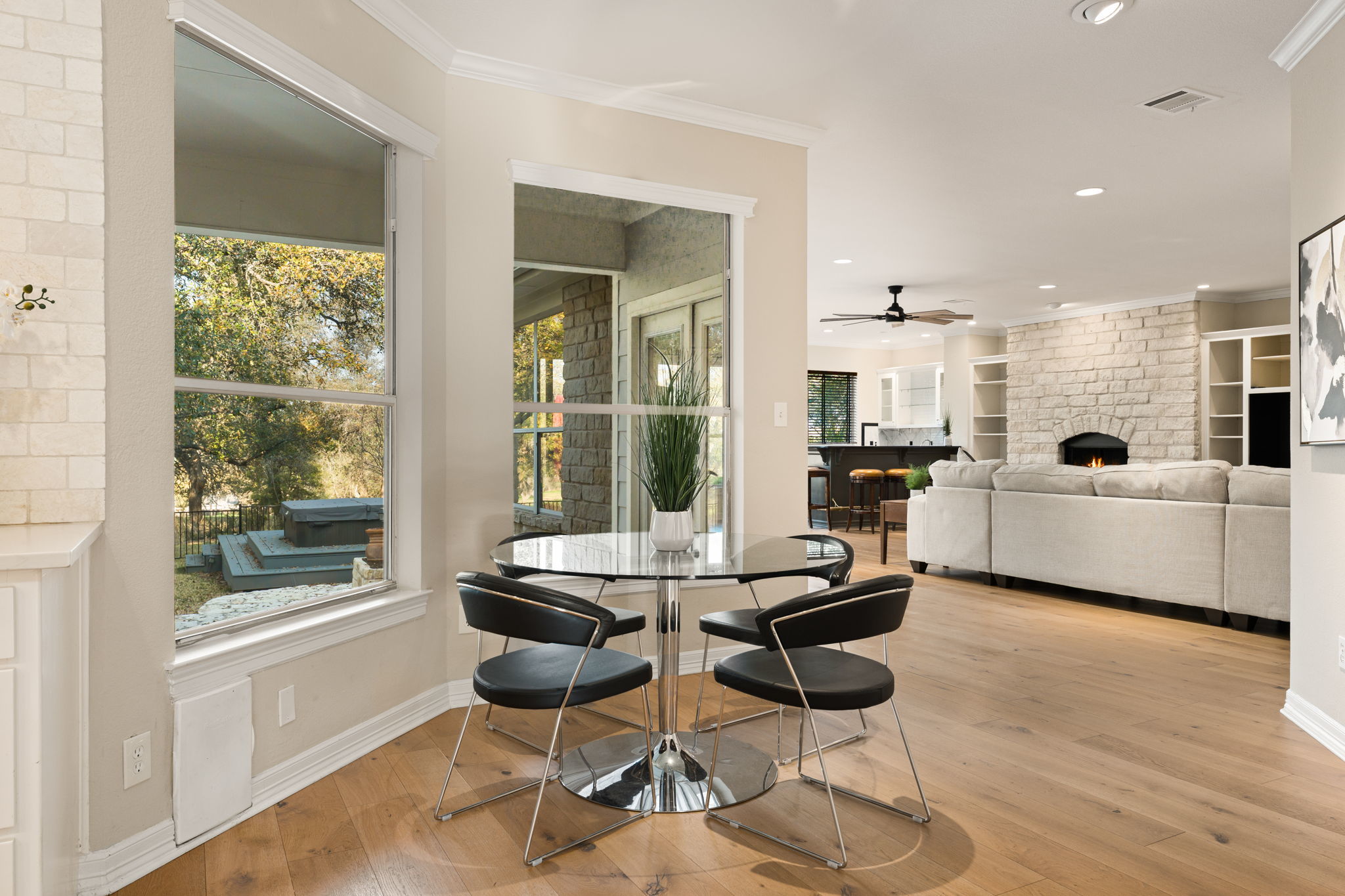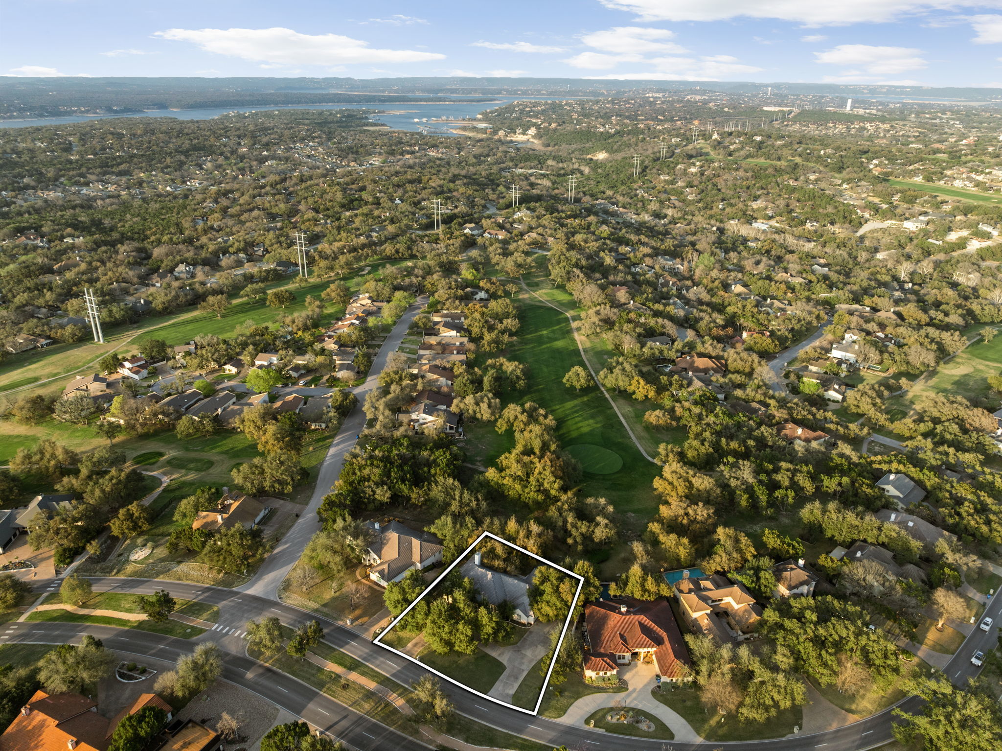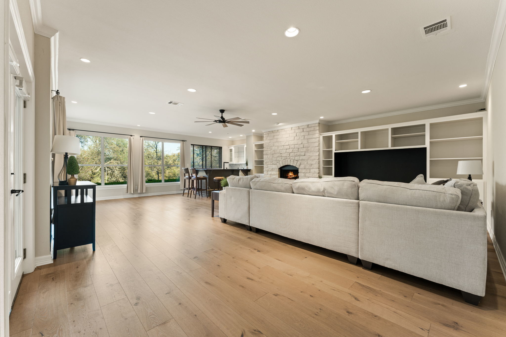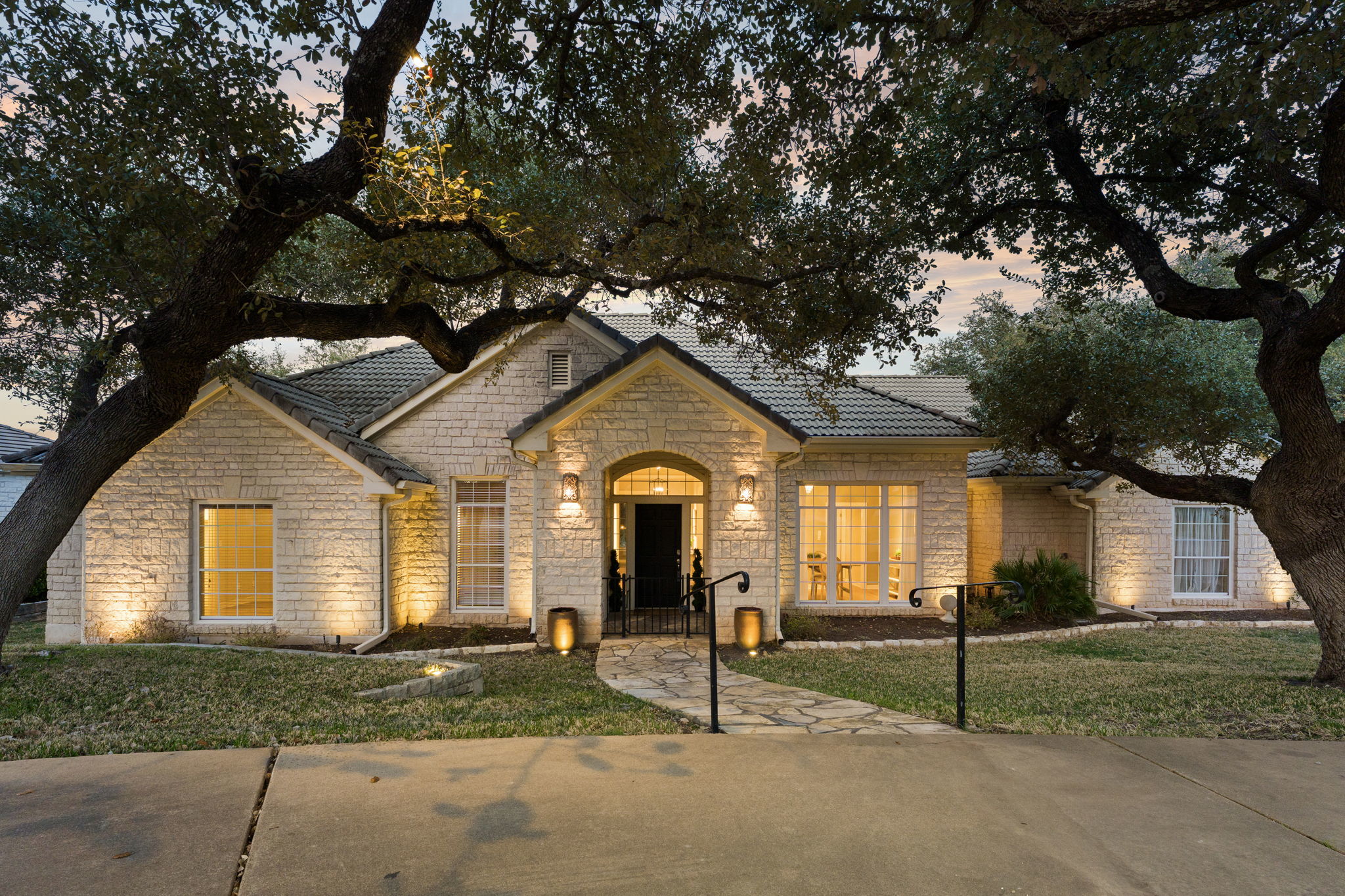 Presenting a unique opportunity to view a one-of-a-kind, single-story custom stone residence located on the 17th green of the Yaupon Golf Course in Old Lakeway Proper. This fully remodeled, 3,351-square-foot home sits on a nearly half-acre lot characterized by mature oak trees and exceptional golf course views. The interior features four bedrooms, 2.5 bathrooms, and two distinct living and dining areas, all without stairs or carpeting. The spacious primary suite boasts a private layout that evokes relaxation and features stunning French white oak wide-plank flooring, two walk-in closets, and a fully remodeled bathroom with a frameless walk-in shower, quartz counters, stone-like tile, and excellent storage. The chef's kitchen is equipped with quartz countertops, shaker-style cabinets, stainless steel appliances, double ovens, a center island, retro pendant lighting, ample storage and counter space, and white oak flooring. The formal living room features a fireplace surrounded by tile and features a wood mantle, large windows, and excellent built-in storage. The large, oversized game/family room offers golf course views through the numerous, large windows, a wet bar with a wine refrigerator, and a stone fireplace with surrounding built-in cabinetry. The size and design of the game/family room provide incredible flexibility and multi-use functionality. Multiple dining spaces, including a spacious formal dining room, make for excellent entertaining opportunities. In addition to gorgeous views, the back of the home offers an extended stone patio with a fire pit and large covered area, a newer swim spa and hot tub, an expansive yard, and wrought iron fencing. The property also includes a concrete tile roof, mature landscaping and custom landscape lighting, and abundant parking. Located within Lake Travis ISD with no HOA fees, this property offers a rare combination of luxury and location. Don’t miss out on this special property!
