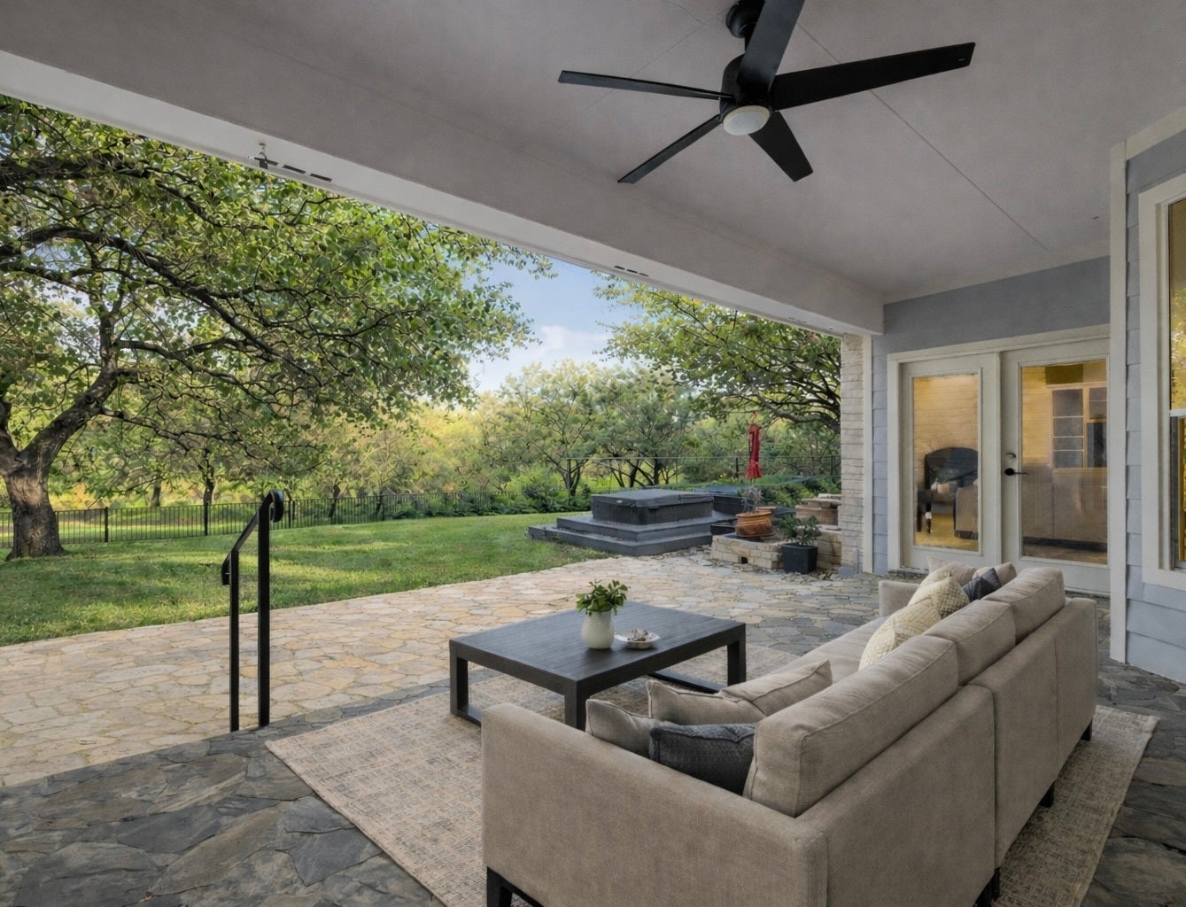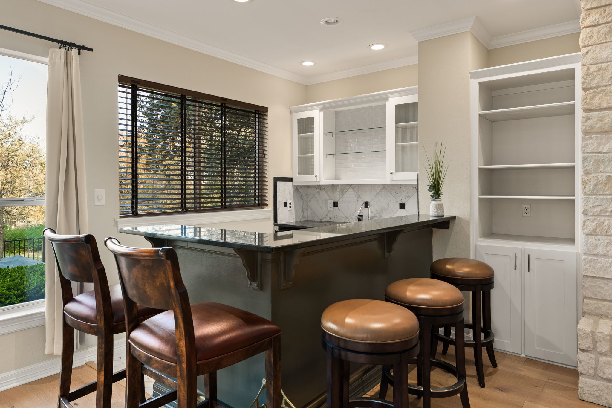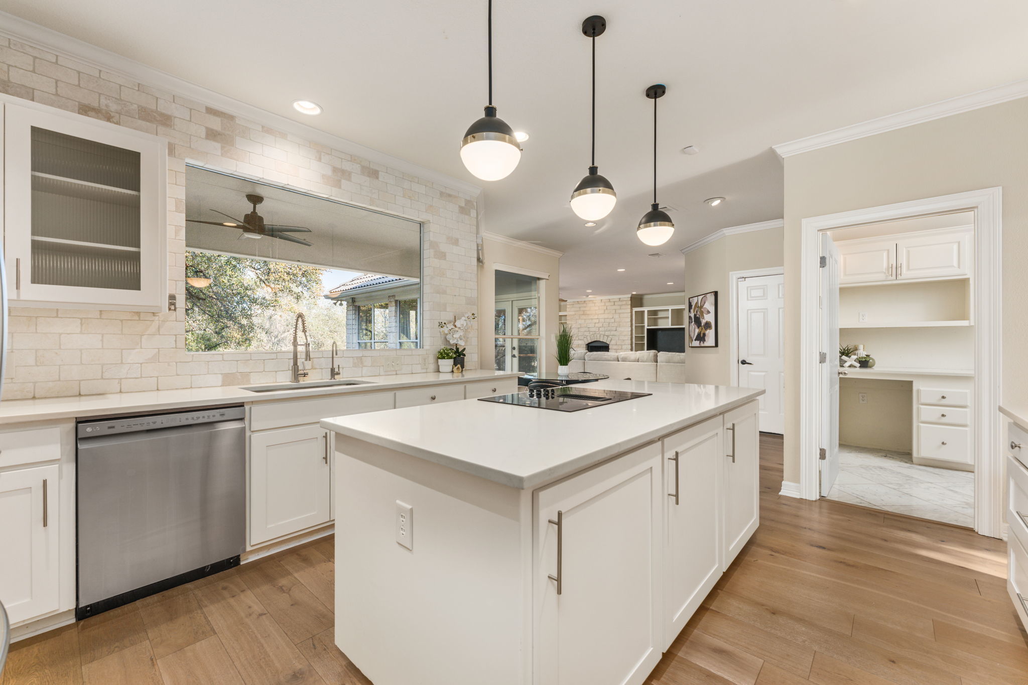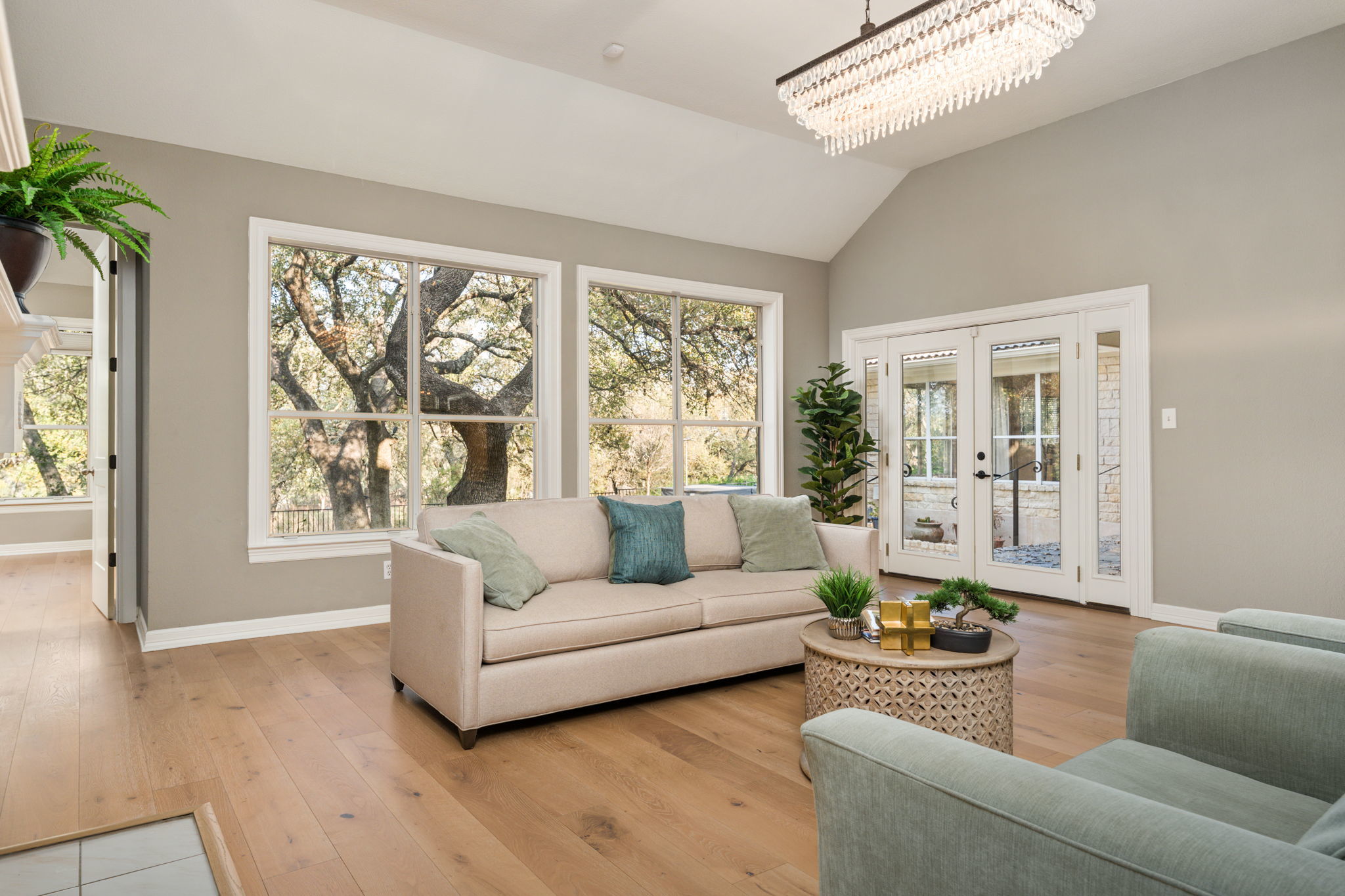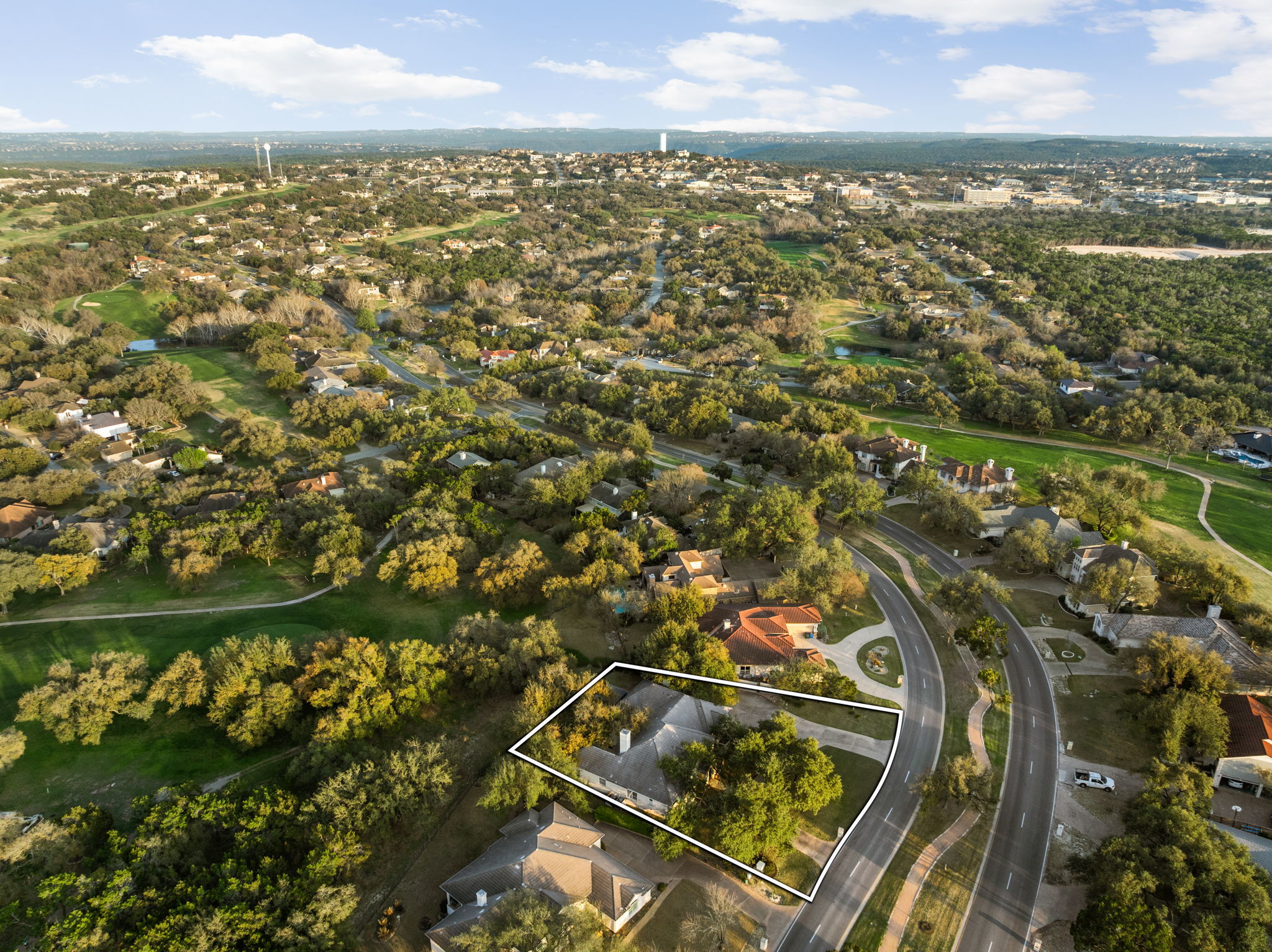 Presenting a unique opportunity to view a one-of-a-kind, single-story custom stone residence located on the 17th green of the Yaupon Golf Course in Old Lakeway Proper. This fully remodeled, 3,351-square-foot home sits on a nearly half-acre lot characterized by mature oak trees and exceptional golf course views. The interior features four bedrooms, 2.5 bathrooms, and two distinct living and dining areas, all without stairs or carpeting. The spacious primary suite boasts a private layout that evokes relaxation and features stunning French white oak wide-plank flooring, two walk-in closets, and a fully remodeled bathroom with a frameless walk-in shower, quartz counters, stone-like tile, and excellent storage. The chef's kitchen is equipped with quartz countertops, shaker-style cabinets, stainless steel appliances, double ovens, a center island, retro pendant lighting, ample storage and counter space, and white oak flooring. The formal living room features a fireplace surrounded by tile and features a wood mantle, large windows, and excellent built-in storage. The large, oversized game/family room offers golf course views through the numerous, large windows, a wet bar with a wine refrigerator, and a stone fireplace with surrounding built-in cabinetry. The size and design of the game/family room provide incredible flexibility and multi-use functionality. Multiple dining spaces, including a spacious formal dining room, make for excellent entertaining opportunities. In addition to gorgeous views, the back of the home offers an extended stone patio with a fire pit and large covered area, a newer swim spa and hot tub, an expansive yard, and wrought iron fencing. The property also includes a concrete tile roof, mature landscaping and custom landscape lighting, and abundant parking. Located within Lake Travis ISD with no HOA fees, this property offers a rare combination of luxury and location. Don’t miss out on this special property!
