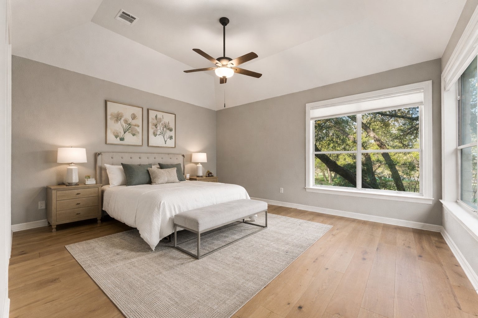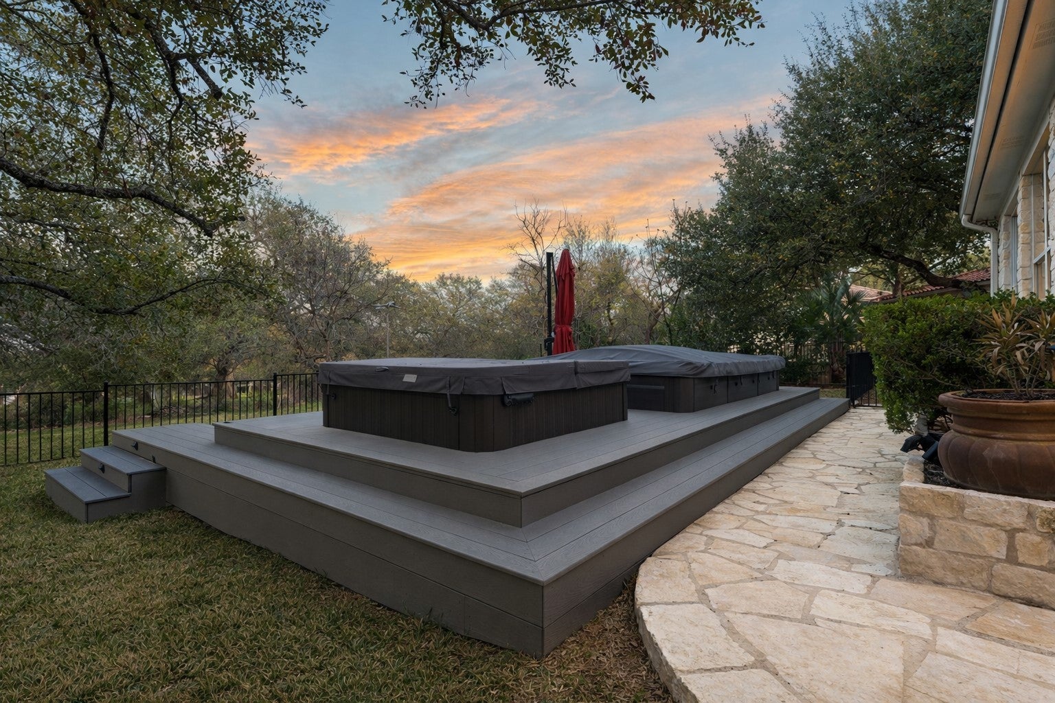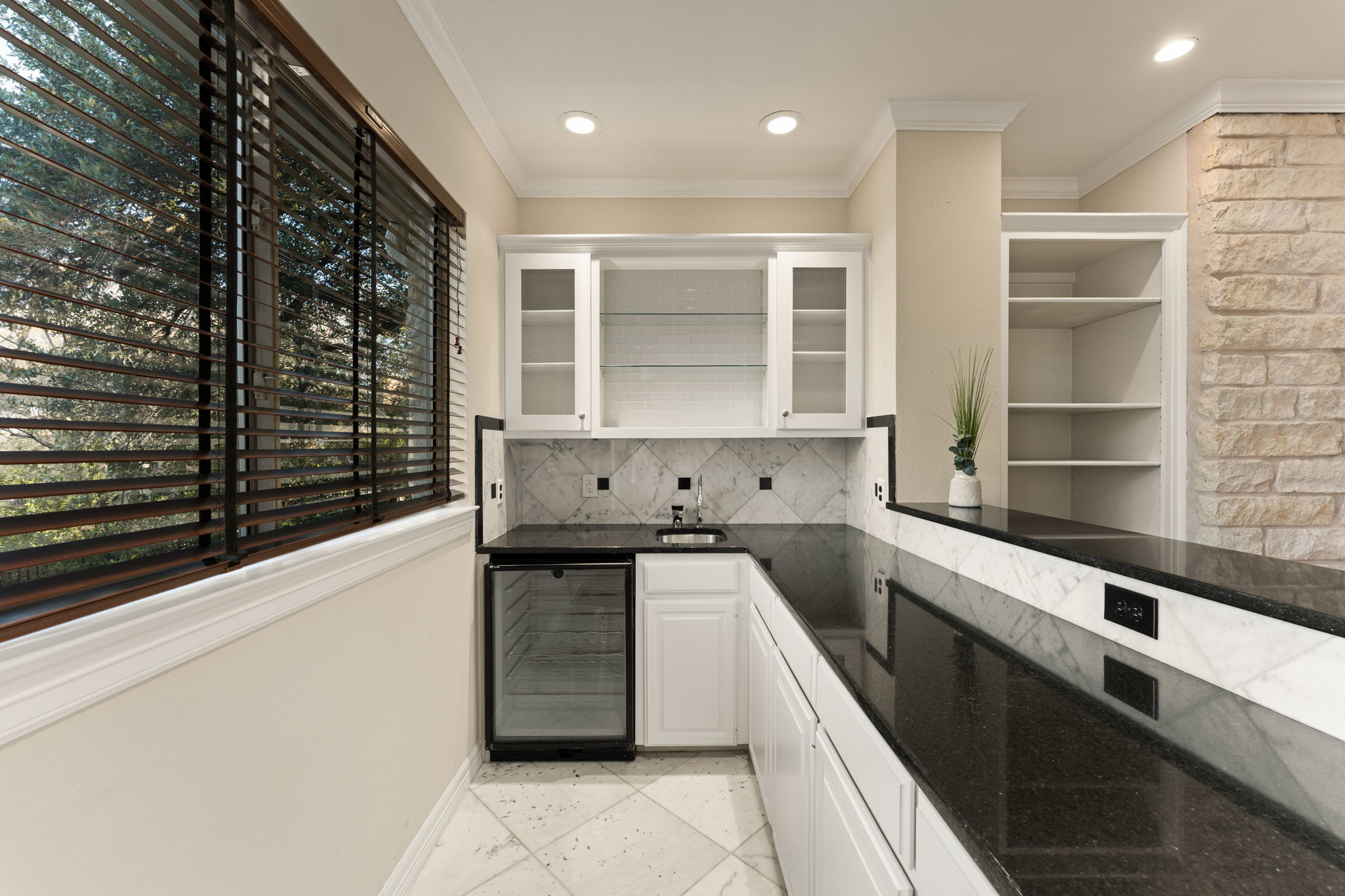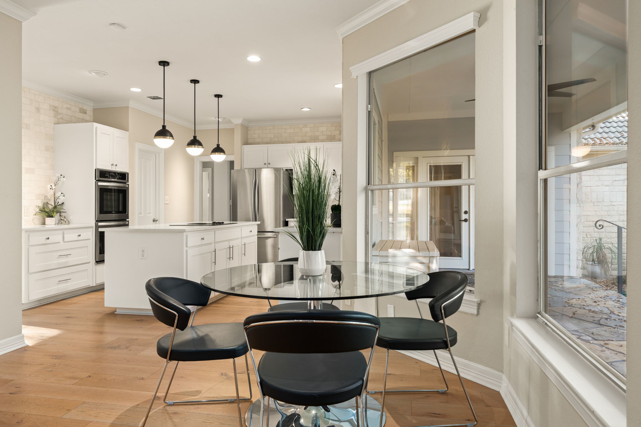 Presenting a unique opportunity to view a one-of-a-kind, single-story custom stone residence located on the 17th green of the Yaupon Golf Course in Old Lakeway Proper. This fully remodeled, 3,351-square-foot home sits on a nearly half-acre lot characterized by mature oak trees and exceptional golf course views. The interior features four bedrooms, 2.5 bathrooms, and two distinct living and dining areas, all without stairs or carpeting. The spacious primary suite boasts a private layout that evokes relaxation and features stunning French white oak wide-plank flooring, two walk-in closets, and a fully remodeled bathroom with a frameless walk-in shower, quartz counters, stone-like tile, and excellent storage. The chef's kitchen is equipped with quartz countertops, shaker-style cabinets, stainless steel appliances, double ovens, a center island, retro pendant lighting, ample storage and counter space, and white oak flooring. The formal living room features a fireplace surrounded by tile and features a wood mantle, large windows, and excellent built-in storage. The large, oversized game/family room offers golf course views through the numerous, large windows, a wet bar with a wine refrigerator, and a stone fireplace with surrounding built-in cabinetry. The size and design of the game/family room provide incredible flexibility and multi-use functionality. Multiple dining spaces, including a spacious formal dining room, make for excellent entertaining opportunities. In addition to gorgeous views, the back of the home offers an extended stone patio with a fire pit and large covered area, a newer swim spa and hot tub, an expansive yard, and wrought iron fencing. The property also includes a concrete tile roof, mature landscaping and custom landscape lighting, and abundant parking. Located within Lake Travis ISD with no HOA fees, this property offers a rare combination of luxury and location. Don’t miss out on this special property!