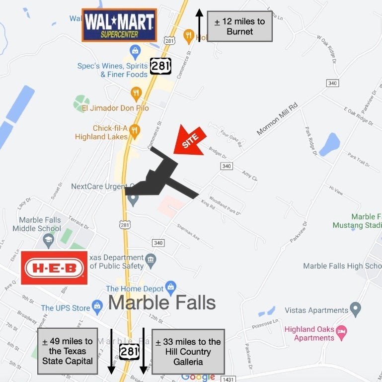 This prime development site offers outstanding visibility with frontage on US Hwy 281, Mormon Mill Rd, and Commerce Street, right in the heart of the Highland Lakes Region. Fully approved for townhome or condo development, it’s a great opportunity to bring a residential project to a thriving area. All utilities are available through the City of Marble Falls, making the development process smoother. A portion of the property does fall within the FEMA 100-year floodplain (see map for details), but there's still plenty of room to build. With its great location and full approvals already in place, this is an excellent spot for a new residential community in one of the most desirable areas of the region!