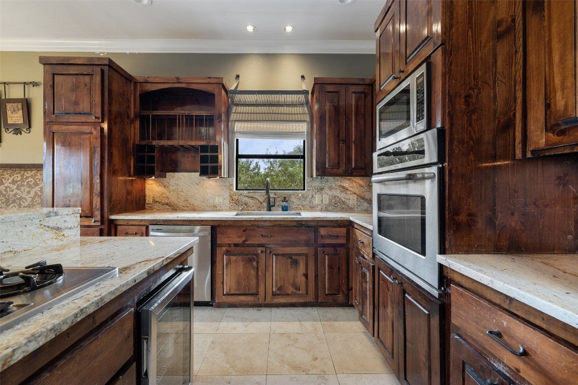 - Built-In Oven, Built-In Range, Dishwasher, Disposal, Free-Standing Refrigerator, Microwave, Wine Refrigerator