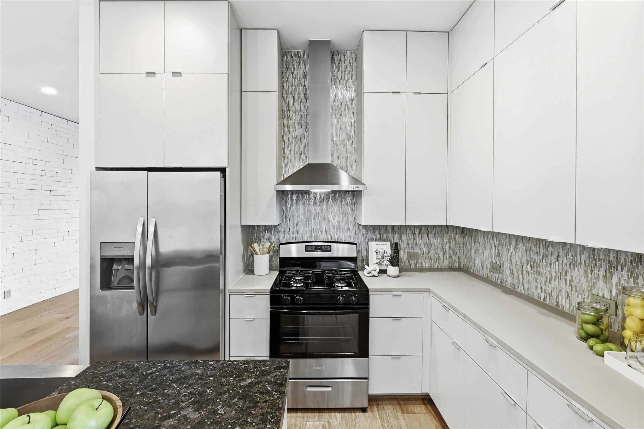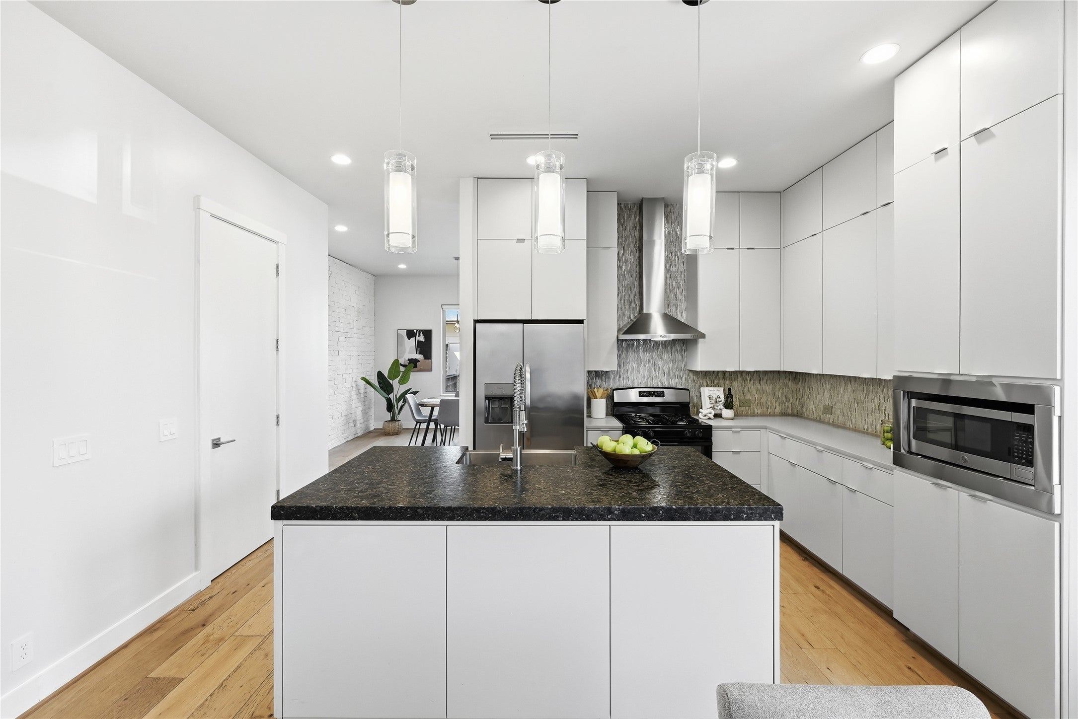 - Dishwasher, Free-Standing Range, Gas Cooktop, Disposal, Microwave, Oven, Refrigerator, Stainless Steel Appliance(s), Tankless Water Heater, Wine Refrigerator