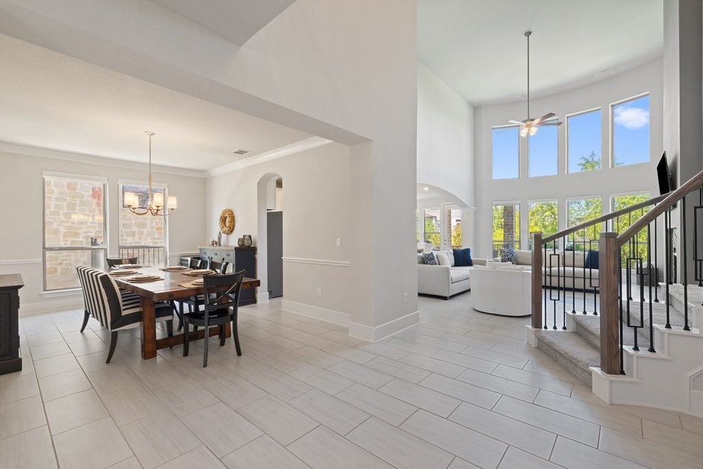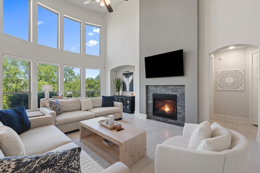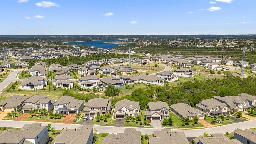 Set within Rough Hollow, moments from Lake Travis, this over 4,200 sq ft residence offers refined hill country living with a sense of privacy and ease. Built by Westin Homes in 2022, the home features five bedrooms, a dedicated office, 4.5 baths, formal dining, a gourmet island kitchen, multiple living areas, and a media room. A craftsman exterior and lush landscaping lead to a grand two-story foyer, where a sweeping staircase and curated finishes set a polished tone. Tile floors extend through the main living spaces, while hardwoods warm the bedrooms and office. The front office, framed by French doors, offers a quiet, light-filled workspace. The main living area rises beneath soaring ceilings, with stacked windows drawing in natural light and framing greenbelt views. A stone fireplace anchors the space, flowing into the kitchen and breakfast area. The kitchen is designed for gathering, with an oversized island, quartz surfaces, custom cabinetry, and built-in stainless appliances. The adjacent dining area overlooks the greenbelt, while the formal dining room features crown and chair rail detailing. The main-level primary suite is privately set, featuring bay windows, wood floors, and a tray ceiling. The ensuite offers dual vanities, a soaking tub, walk-in shower, and two closets, one with direct laundry access. A guest suite completes the first floor. Upstairs, additional bedrooms include a jack-and-jill layout and a private ensuite, along with a game room and media room. Outdoors, a covered porch overlooks a fenced yard with wrought iron detailing, preserving the natural backdrop. Residents enjoy access to a private yacht club and marina, resort-style pools, fitness center, sports courts, trails, and Lake Travis ISD schools, with easy access to 71 and the Hill Country Galleria. Come take a tour today!