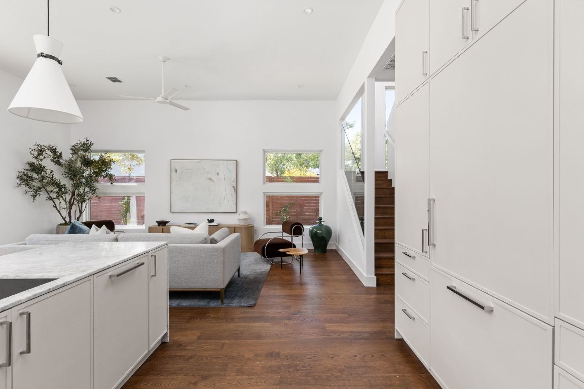 Just minutes from the heart of South Congress, this 3-bedroom, 2.5-bath home blends modern design with everyday comfort. Enjoy marble countertops, Thermador appliances, a wood-paneled fridge, and a skylight that brightens the kitchen. The primary suite features a walk-in closet, while large windows fill every room with natural light. A versatile upstairs lounge, mudroom, and wraparound backyard complete this thoughtfully designed South Austin retreat.
