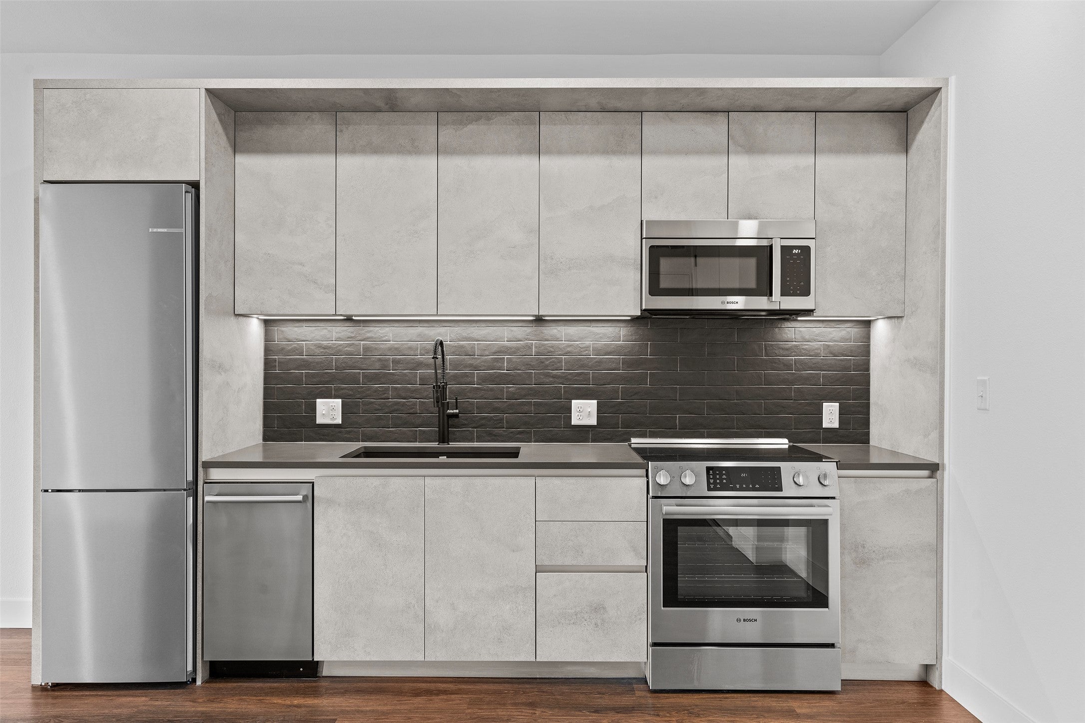 FIRST MONTH RENT FREE! -This brand-new fourth-floor one-bedroom home at Congress Lofts combines style, energy, and skyline views in one bright modern space. Wide plank hardwood floors run throughout, and the kitchen stands out with sleek quartz countertops, minimalist cabinetry, and stainless steel appliances. Black framed windows fill the home with natural light and open to a private balcony overlooking downtown Austin. The bedroom suite feels spacious and polished, featuring a walk-in closet with custom-built-ins and a spa-style bath with quartz counters, a dual vanity, and a seamless glass shower. Congress Lofts offers residents a vibrant mix of amenities, including a resident lounge, game room, pool deck with grilling stations, and seating for gatherings. Located in the St. Elmo District, one of Austin’s fastest-growing creative hubs, you’ll be surrounded by local favorites like Spokesman Coffee, St. Elmo Brewing, Still Austin, and The Austin Winery. Just minutes from South Congress and a quick drive downtown, this address blends convenience, character, and community. One reserved parking space is included.