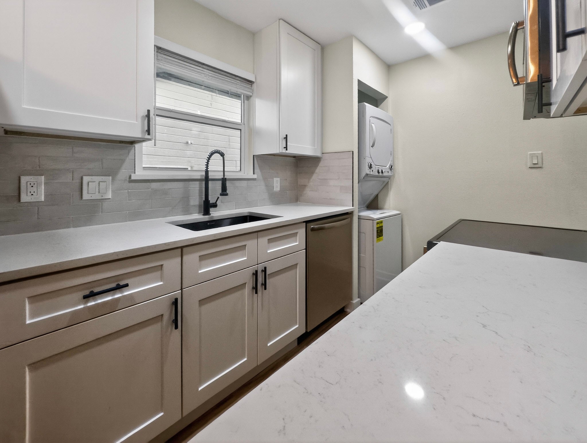 - Dryer, Washer/Dryer Stacked, Dishwasher, Electric Range, Disposal, Microwave, Oven, Range, Refrigerator, Washer