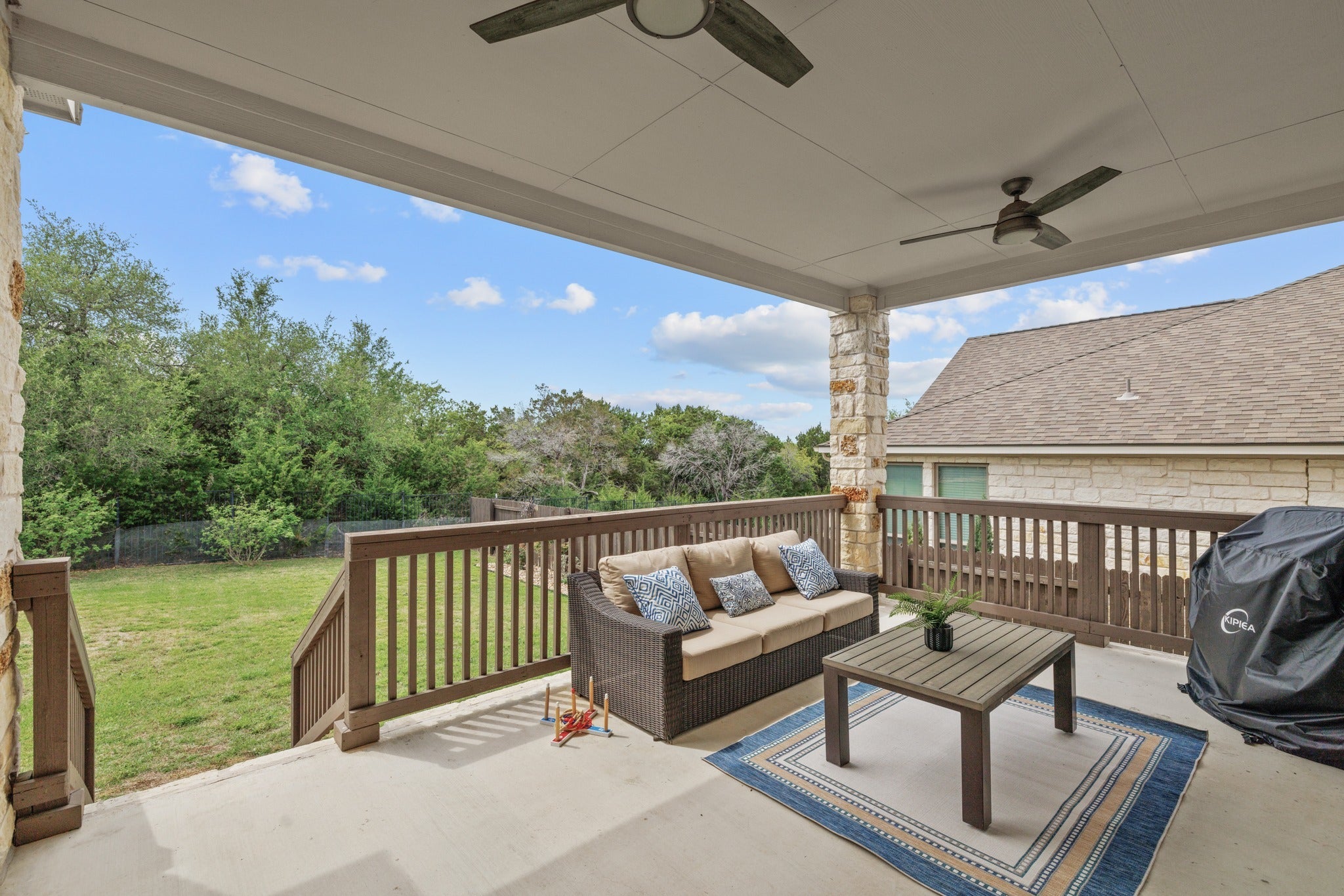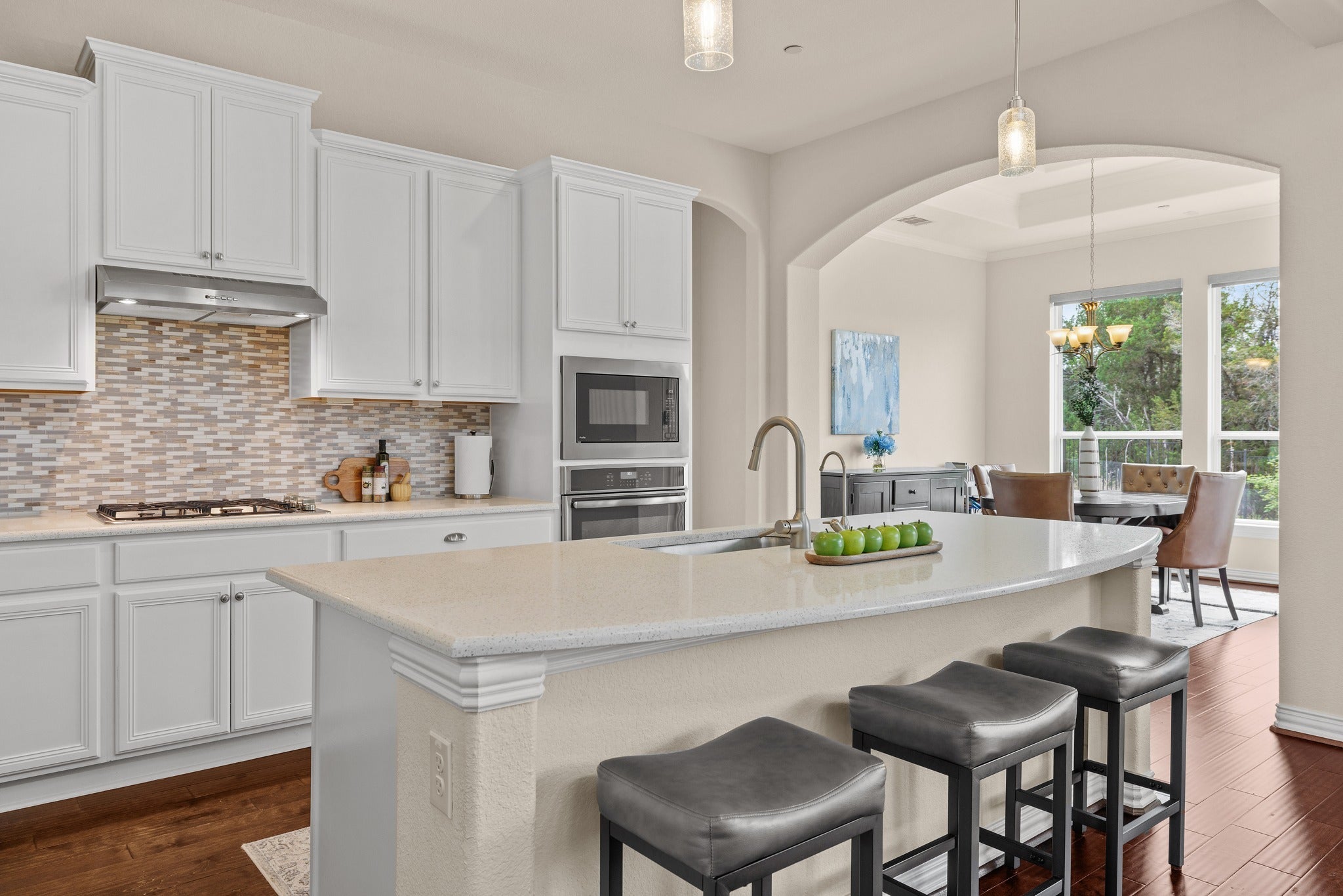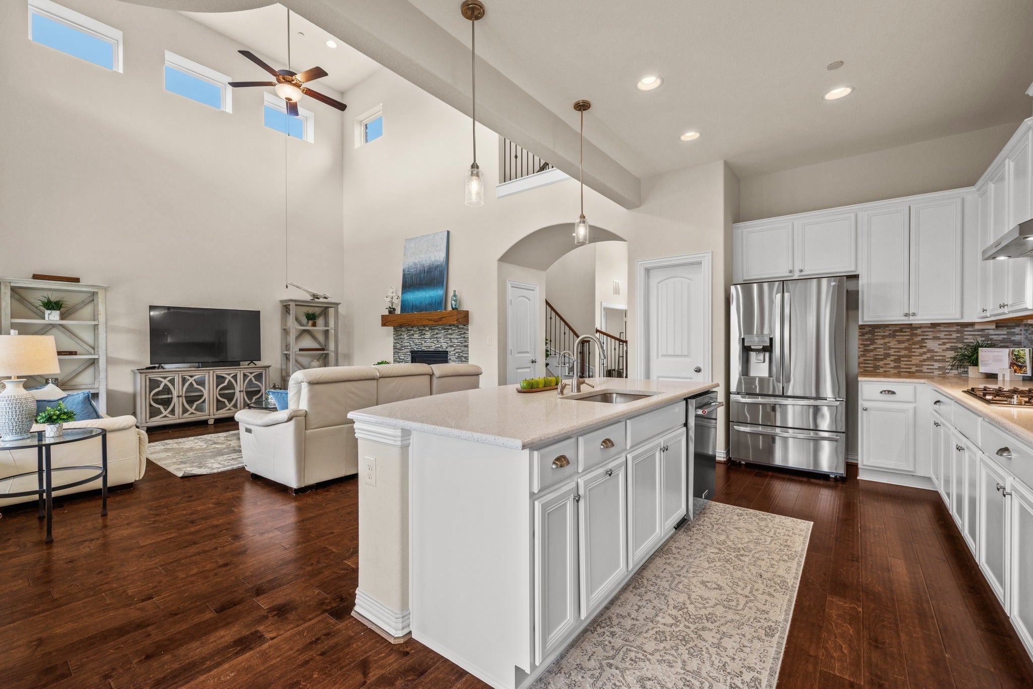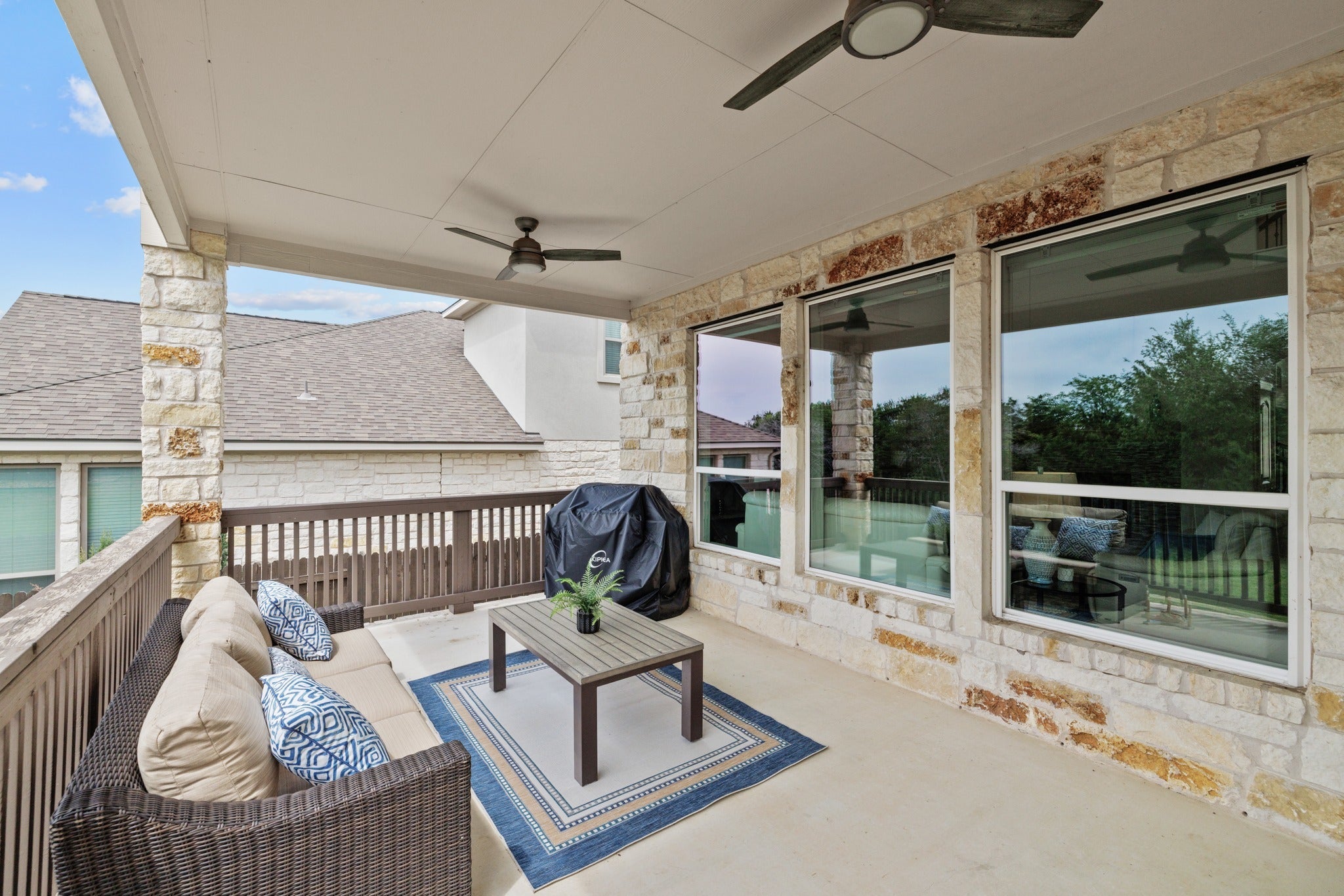 Nestled on a premium lot backing to a serene greenbelt, this stunning two-story home offers the perfect blend of space, privacy, and modern design. Built in 2018, this 4-bedroom, 3 full bath, 1 half bath residence spans 3,116 square feet and is thoughtfully designed for both everyday living and entertaining. The striking stone exterior and inviting entry set the tone as you step inside to discover an open and functional layout with two spacious living areas. The main level features a bright and airy living room that flows seamlessly into the kitchen and dining spaces, creating an ideal environment for gatherings. The well-appointed kitchen offers ample cabinetry, generous counter space, and a layout that opens beautifully to the main living area. The primary suite is conveniently located on the main floor, providing a private retreat with a spacious ensuite bath. Upstairs, you’ll find a second living area perfect for a game room, media space, or flex area, along with additional bedrooms and bathrooms that offer comfort and versatility for family or guests. Step outside to enjoy the peaceful backyard setting with no rear neighbors—just expansive greenbelt views that provide both privacy and a natural backdrop. With its modern construction, functional floor plan, and desirable setting, this home checks all the boxes for comfortable, stylish living.
