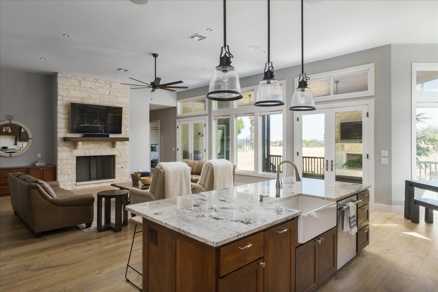 We invite you to become the next steward of this immaculately maintained single-story estate, gracefully positioned in the heart of Horseshoe Bay West, one of the Texas Hill Country's most coveted resort communities. Thoughtfully designed with three spacious bedrooms and three-and-a-half baths, this residence balances sophistication, comfort, and effortless livability. An open, flowing floor plan creates an ideal backdrop for both intimate daily living and elegant entertaining. Walls of expansive windows bathe the interiors in natural light while framing serene views across Ram Rock's signature fourth fairway, seamlessly connecting the indoors with the surrounding landscape. The inviting living and dining spaces transition beautifully into a well-appointed kitchen, offering functionality without sacrificing style. The private owner's suite serves as a tranquil retreat-perfectly proportioned for relaxation and privacy after a day of leisure. Outdoors, a generous covered terrace elevates the home's livability, featuring a stone gas fireplace, built-in gas grilling opportunities, and a low-maintenance yard-ideal for refined outdoor gatherings or peaceful evenings overlooking the course. Just minutes away, enjoy the lifestyle that defines Horseshoe Bay: Lake LBJ and Lake Marble Falls, championship golf, marina access, tennis, pickleball, world-class dining, wellness amenities, and the exclusive offerings of Horseshoe Bay Resort and Escondido. Whether envisioned as a primary residence, luxury retreat, or strategic investment, this home delivers a rare blend of resort-style living, understated elegance, and Hill Country charm-all within one of Texas' most distinguished destinations.