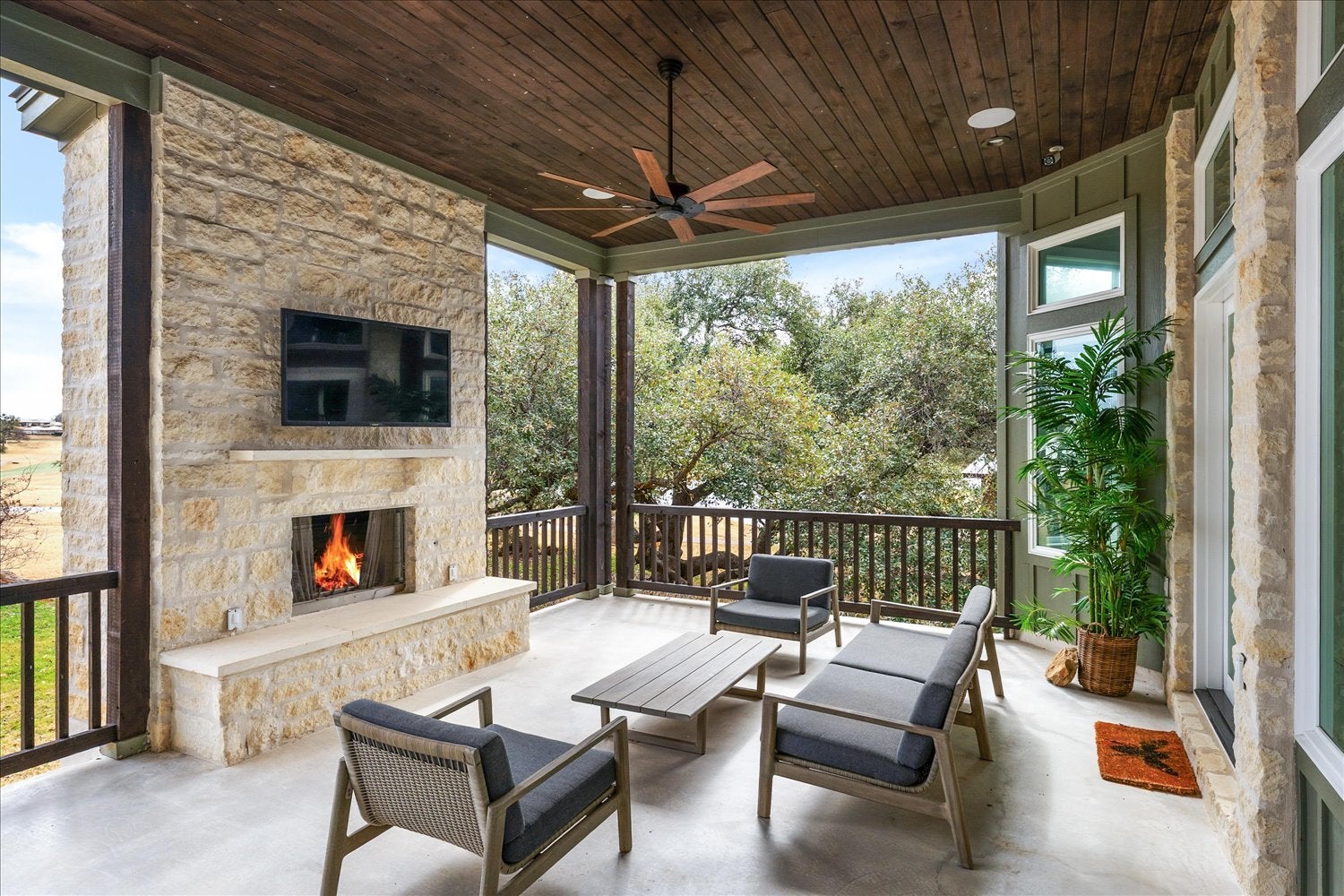 - Gas, Gas Log, Glass Doors, Living Room, Outside, Stone