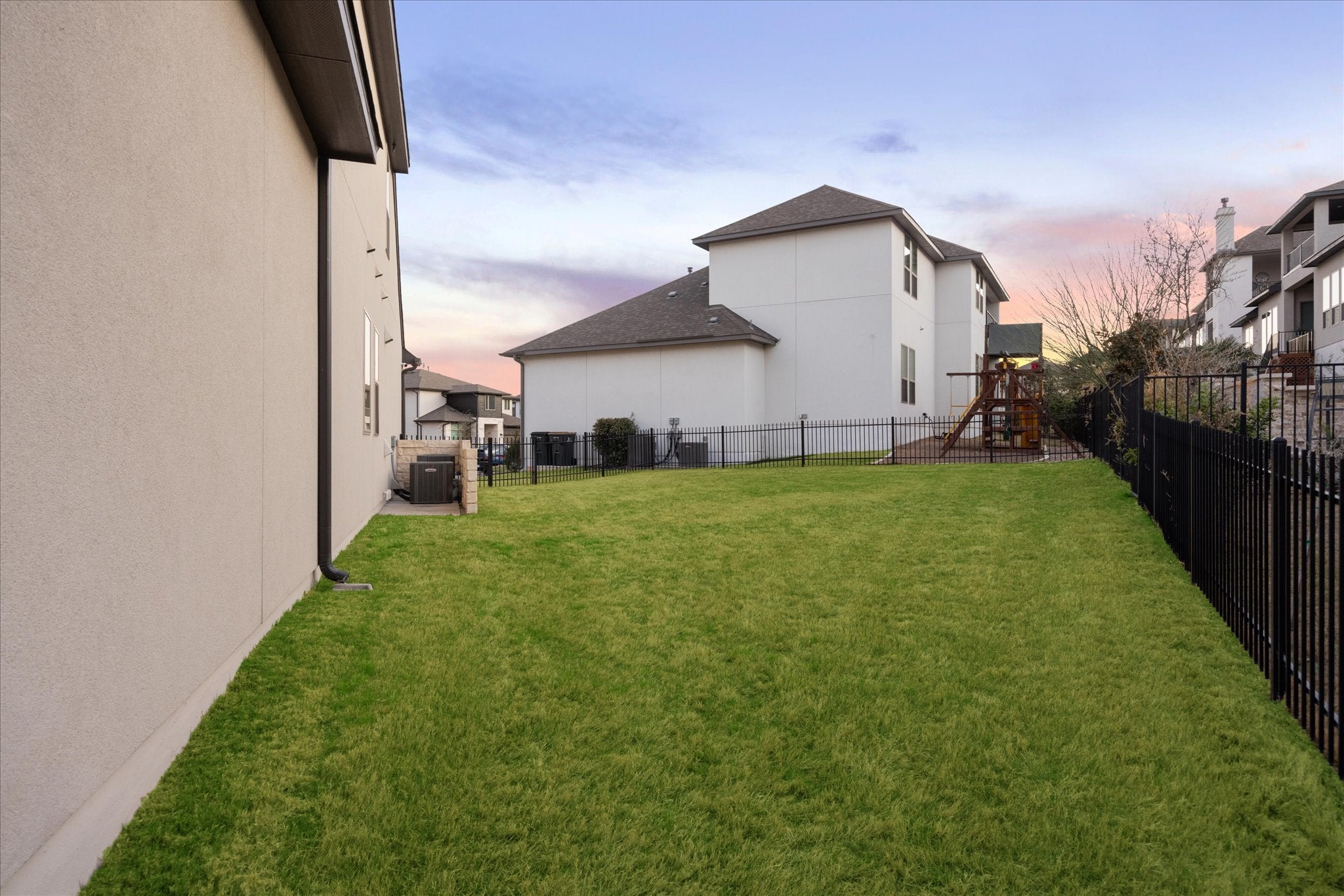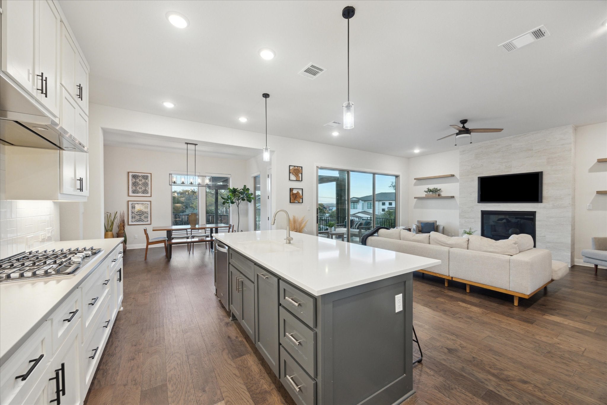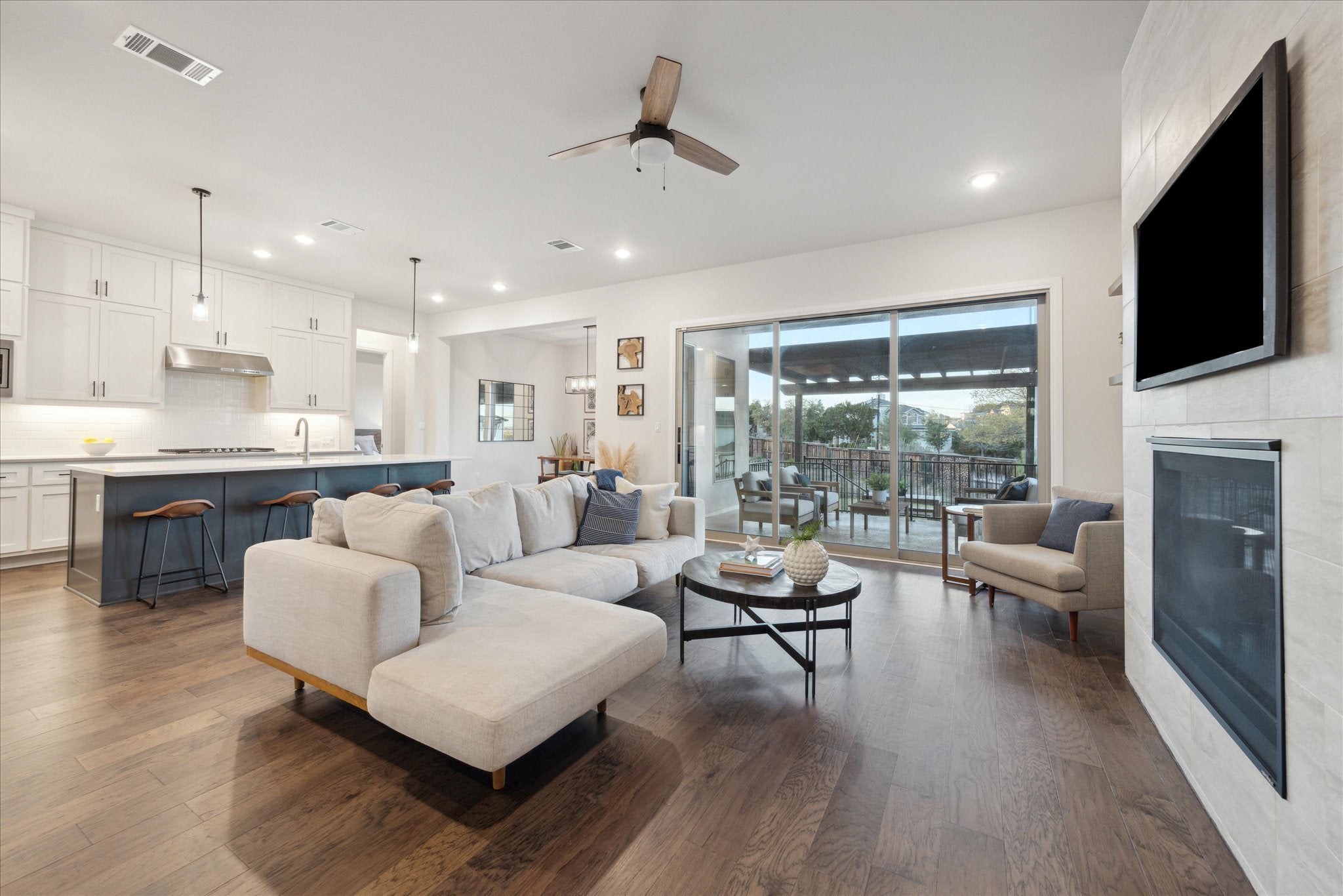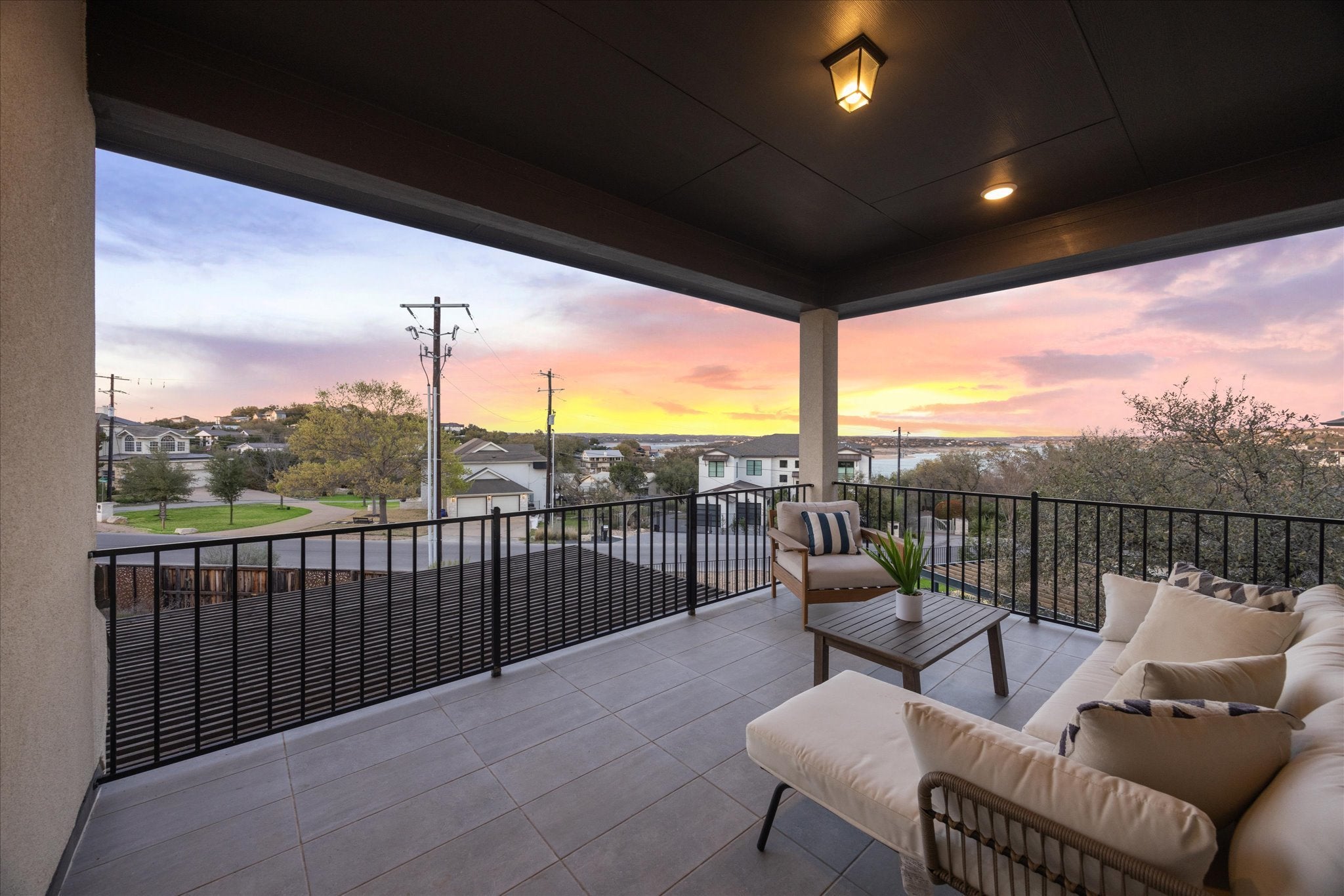 Close to Lakeway and Rough Hollow! This lovely newer luxury home with an open floor plan is located in the peaceful community of The Summit at Lake Travis. This exclusive neighborhood is quietly tucked away, yet close to so much including Lake Travis elementary and middle schools and the Bee Creek Sports Complex. This stunning residence is full of light and nestled on a peaceful cul-de-sac offering stunning views of Lake Travis. This modern and inviting home with a covered front porch and two-story foyer offers an expansive 3,764 square feet of living space (per Builder) with 5 bedrooms and 6 bathrooms. The main level luxurious primary suite overlooks the back yard with peek a boo lake view, has a walk-in closet, spa-like bathroom, with a separate shower, soaking tub, and dual vanities. The gourmet kitchen is equipped with sleek granite countertops and stylish backsplash, cooktop, double oven, microwave, dishwasher, pantry, center island and breakfast bar. Entertain in style in the dining room or relax by the decorative and contemporary modern tile fireplace in the spacious family room. Tri-fold doors lead to the outside with lake views, a pergola covered patio and large fenced yard with ample room for a pool. An additional bedroom, two bathrooms, office/study, and laundry room round out the main level. The second level offers more open living space and has 3 bedrooms and bathrooms. Two bedrooms are en suite, and the third bathroom is conveniently located near a bedroom and upstairs living areas. There is an expansive, high ceilinged recreation/living room that leads to a walk out balcony with outstanding lake views overlooking the rear yard. Adjacent to this space is a media room with a custom installed speaker system. Additional amenities include newer lighting fixtures, hardwood and tile floors central air conditioning and heating, ceiling fans, alarm system with cameras, attached two car garage with an epoxy finished floor, and exterior lighting.