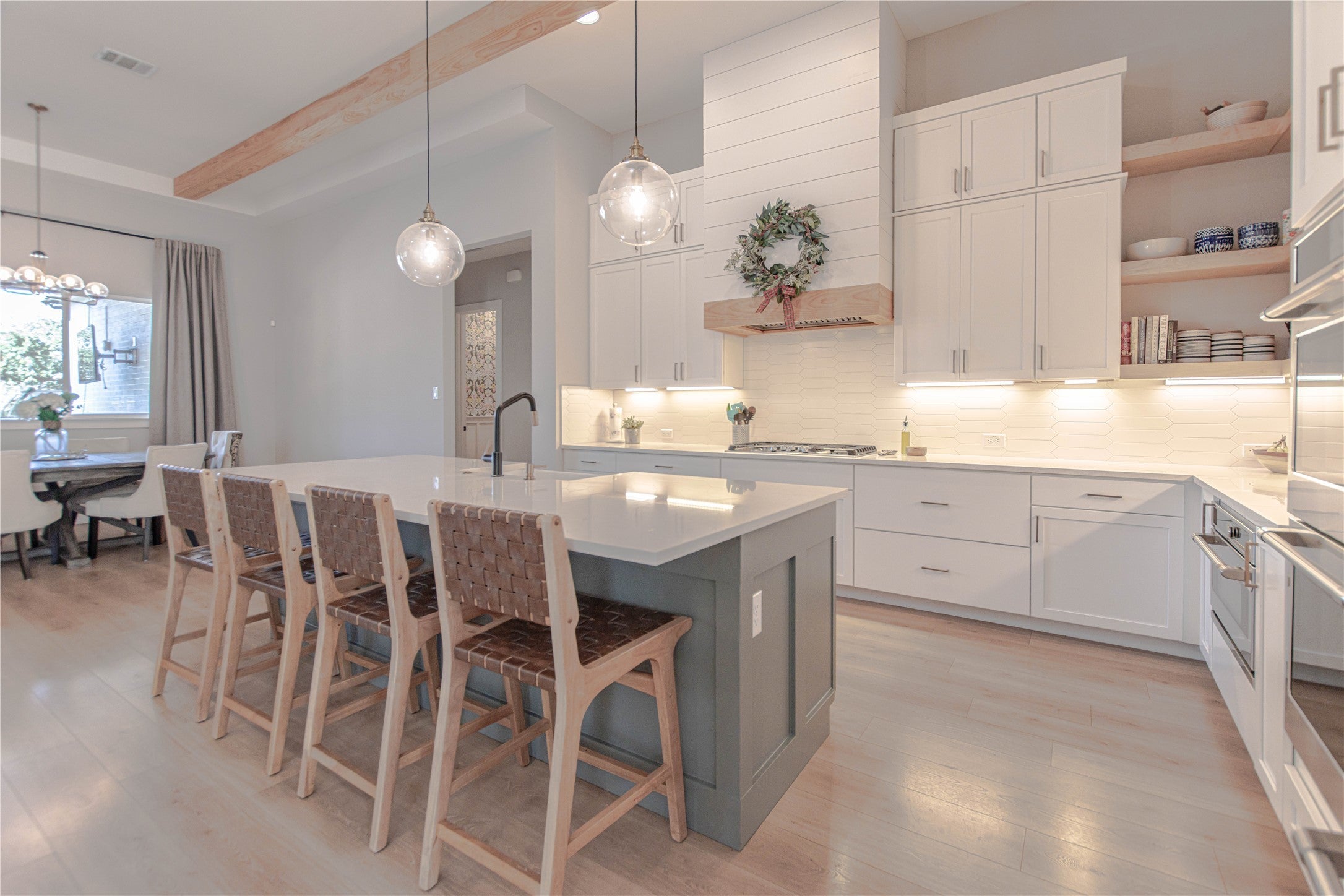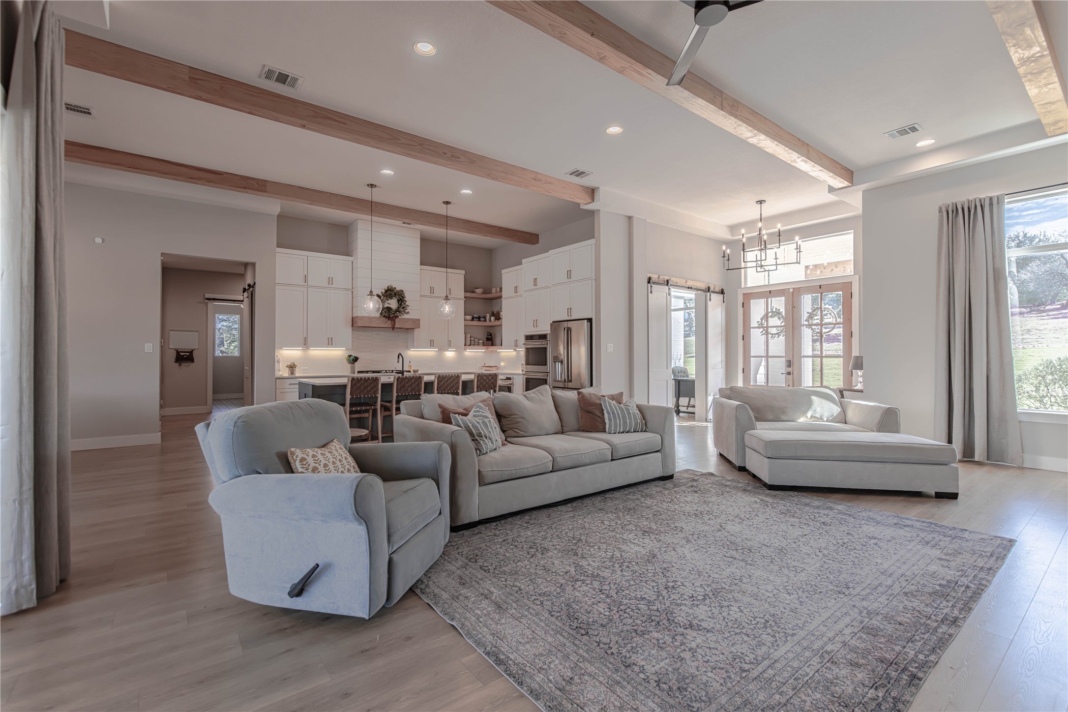 Welcome home to your Hill Country Oasis in the Heart of Liberty Hill. This amazing custom built home sits on a beautiful private 1 acre lot that perfectly blends the indoor & outdoor entertainment areas. Situated on a cul-de-sac lot with no through traffic providing quiet country privacy & feeds into Liberty Hill ISD. From the high ceilings, natural wood beams, light vinyl plank wood floors & bright windows, the neutral & bright interior welcomes you IN the moment you step through the front door. The study right off the entry provides privacy w/ wood sliding barn doors & a huge front window. The large main living room has 13 foot ceilings, a beautiful gas fireplace & nice built-ins. The well appointed kitchen has a large island w/ bar seating, loaded w/ white wood cabinets, Quartz counters, tile backsplash, built in cooktop, double oven & microwave. The private primary suite is on its own wing w/ high ceilings, large window & door to the outdoor patio. The beautifully finished primary bathroom has dual sinks, free standing tub, tiled walk in shower & dual closets that open to the laundry room. The bathroom also has a private entrance to the detached guest casita with its own wet bar area & 1/2 bath. The large living area has double sliding glass doors that open to the large outdoor covered patio w/ tons of space for outdoor furniture & entertaining. There is a wonderful outdoor kitchen w/ durable soapstone counters, built in sink & room for your grill & smoker. The sparking pool is ready for summertime fun w/ friends and family. The pool offers plenty of deck area for sun loungers, tables & umbrellas. The elevated built in heated spa overflows into the pool & offers a great view of the outdoor entertainment area & the backyard beyond. The spacious backyard has plenty of room for kids to play and pets to run. The large secondary bedrooms are on the opposite side of the home & with their own private bath.