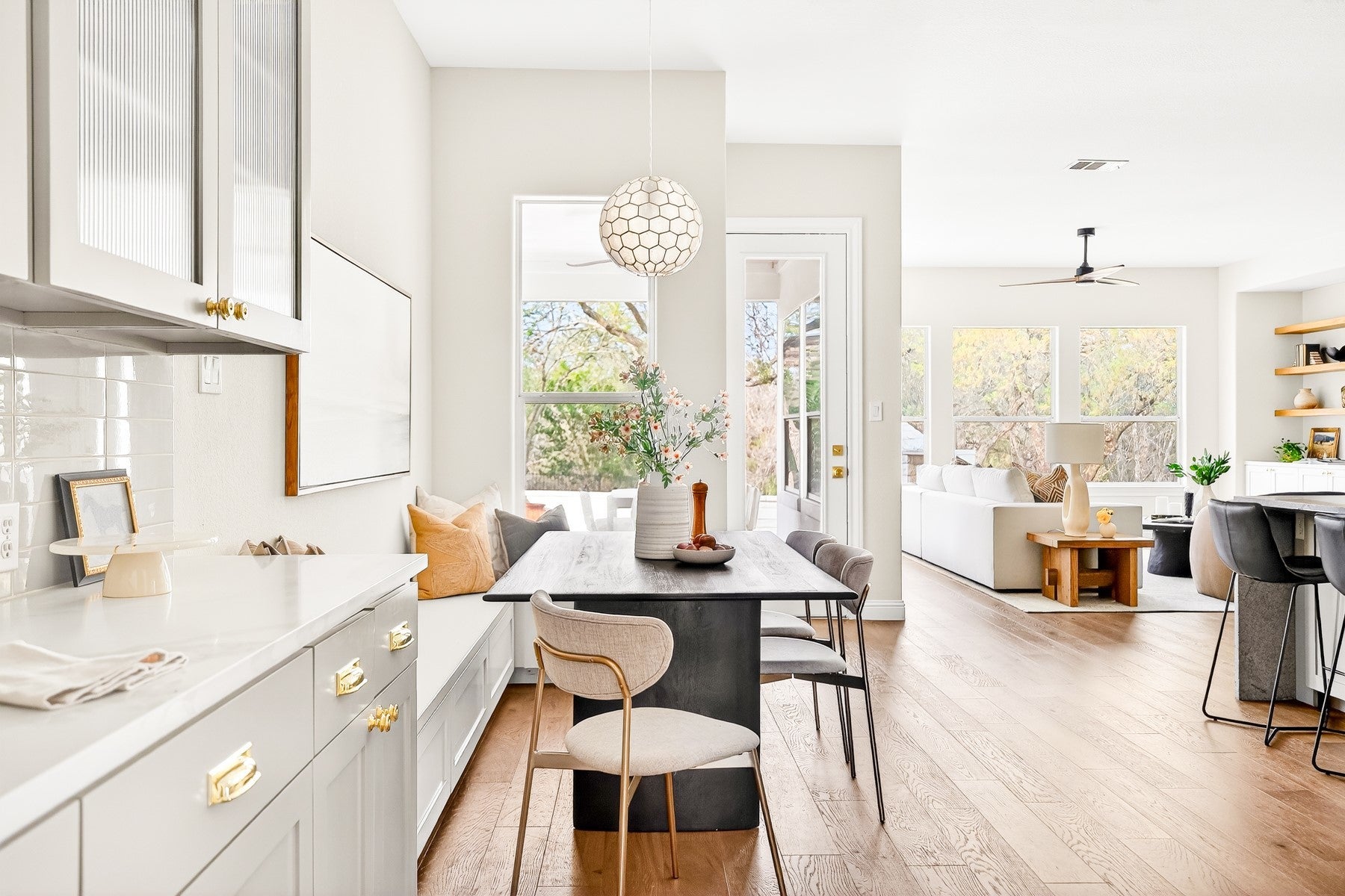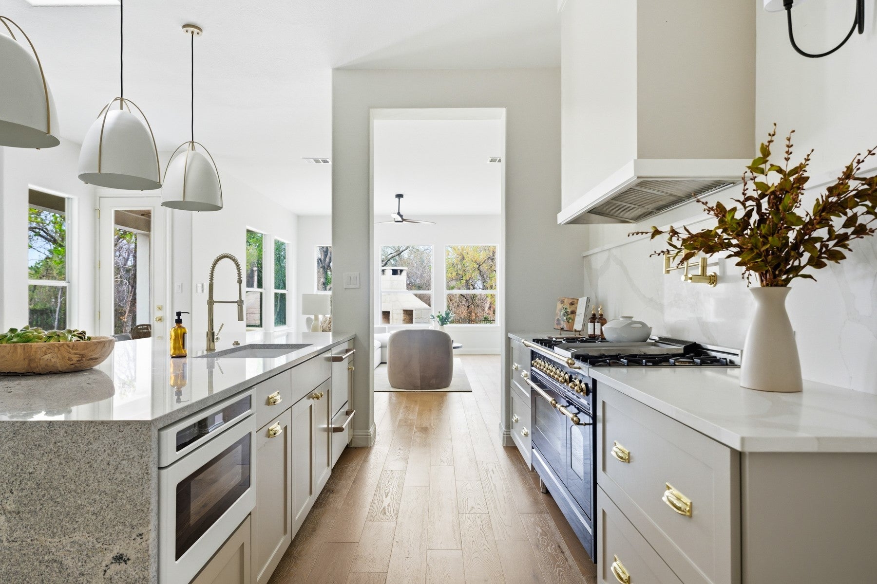 Experience elevated living in this designer renovated five-bedroom home, thoughtfully designed for both everyday comfort and entertaining. Tucked away on a private 1.76-acre cul-de-sac lot, this stunning residence offers refined interiors, generous living spaces, and seamless indoor-outdoor living. The main level welcomes you with a stylish front office, elegant powder room, and formal dining room perfect for hosting gatherings. A cozy media room and a full bath with convenient exterior access from the pool add thoughtful functionality. The serene primary suite offers a peaceful retreat with a beautifully designed spa-like bath and a spacious walk-in closet. Multiple living areas create flexibility and flow, including a formal living room with unique built-ins and a relaxed family room that opens to the kitchen and dining banquette overlooking the beautiful backyard and pool area. The kitchen features custom cabinetry, under-cabinet lighting, and a 9 foot waterfall island surrounding the impressive 48-inch Italian ILVE range. An intimate brick wine cave with a 100+ bottle wine fridge provides the perfect setting for tastings and conversation. Upstairs, a third living space accompanies three bedrooms, one with a private ensuite bath and two connected by a Jack-and-Jill bath. Throughout the home, 10-foot ceilings, engineered hardwood flooring, custom lighting, and designer hardware create a refined, cohesive aesthetic. Just minutes from Safe Harbor Emerald Point Marina, this property offers the perfect balance of privacy, luxury, and easy access to the Lake Travis lifestyle.