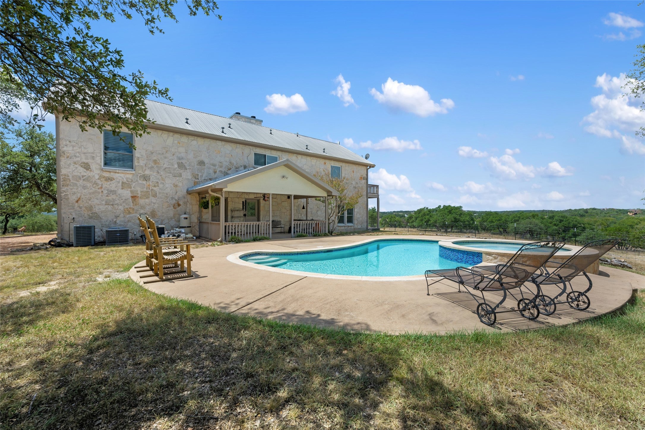 Private Hill Country Ranch on 14.47 Acres. The Views from this property are breathtaking! Enjoy peace and privacy on this ag-exempt, fully fenced property featuring divided pastures, open spaces, and mature hardwoods. The beautifully remodeled 3,140 sq. ft. home sits high on a hilltop with stunning Hill Country views. Inside, you’ll find 3 bedrooms, a study (or 4th bedroom), 3 full baths, two living areas with limestone fireplaces, and an open kitchen with white cabinetry and scenic windows. The owner’s suite offers deck access, sunset views, and a spa-style bath with travertine, soaking tub, and dual closets. The lower level includes two guest rooms, a remodeled bath, and access to a sparkling saltwater pool, waterfall spa, and covered patio—perfect for entertaining. Extras include a 2,000 sq. ft. Mueller metal building with storage, a hen house, and small livestock stalls to maintain your ag exemption. Conveniently located near historic Mercer Street, restaurants, wineries, and wedding venues. Adjacent 14.66-acre tract also available, offering a combined 29.13 acres for $3,199,998