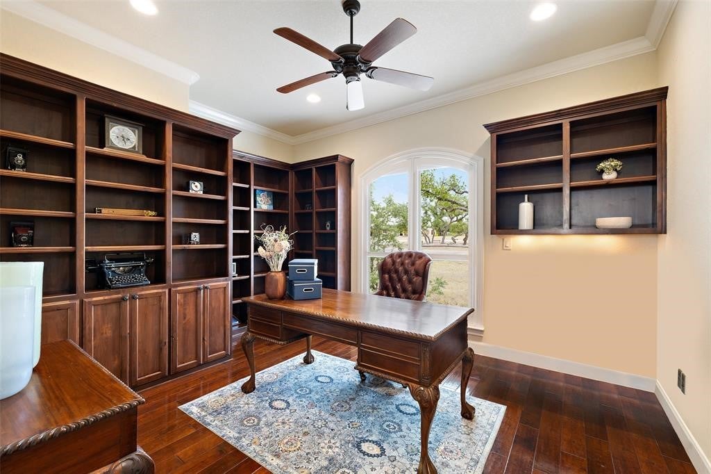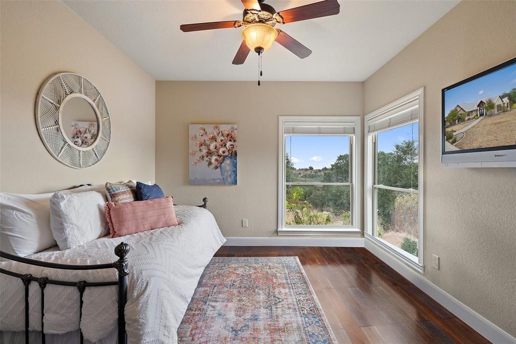 Welcome to “La Colina Ranchita,” a stunning 28.53-acre hilltop retreat offering sweeping long-distance views, privacy, and classic Texas Hill Country beauty. The main home and guest cabin are thoughtfully positioned to capture breathtaking sunsets, whether enjoyed indoors through expansive windows or while relaxing beside the resort-style heated pool and spa. A gated entrance leads to a chip-sealed driveway that winds through mature, groomed oak trees, setting the tone for this serene property. The land features an orchard and garden with irrigated raised beds, a variety of hardwood trees, and scenic walking trails lined with native grasses, shrubs, wild grapes, and blackberries, along with a vibrant spring wildflower meadow. The property is fully fenced and wildlife exempt, with a 38×30 metal barn, workshop, and RV carport. A charming cabin with kitchen, bedroom, bath, and wrap-around porch provides ideal guest accommodations. The custom 4-bedroom main home with office showcases large windows maximizing both eastern and western views, a beautifully appointed kitchen with stone accents, granite countertops, large island, custom floor-to-ceiling cabinetry, and a Wolf range-top with double ovens, while cedar beams and wood-burning fireplaces add warmth and character. Numerous recent upgrades enhance the property, including new roofs on the home, cabin, barn, and RV carport (2025), new gutters and downspouts, a recently replaced whole-house water softener system, updated well house equipment, and a new AC unit with a 5-year warranty. With level, usable land and a perfect blend of manicured grounds and natural habitat, this exceptional Hill Country estate offers both beauty and versatility in an extraordinary setting.
