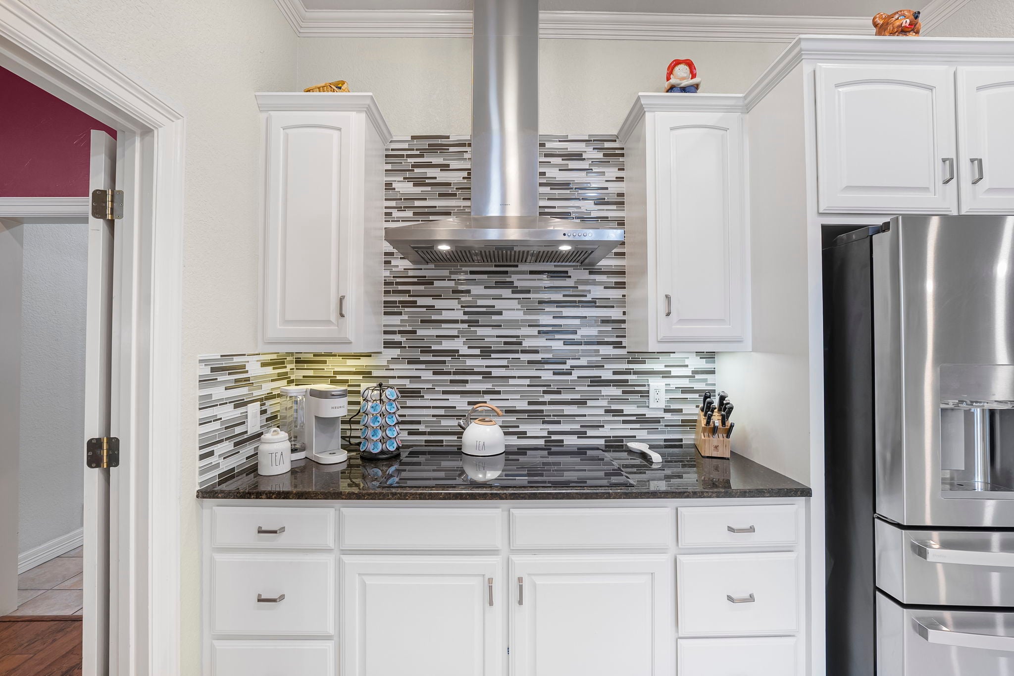 - Built-In Oven, Cooktop, Dishwasher, Disposal, Electric Water Heater, Microwave, Plumbed For Ice Maker, Water Softener