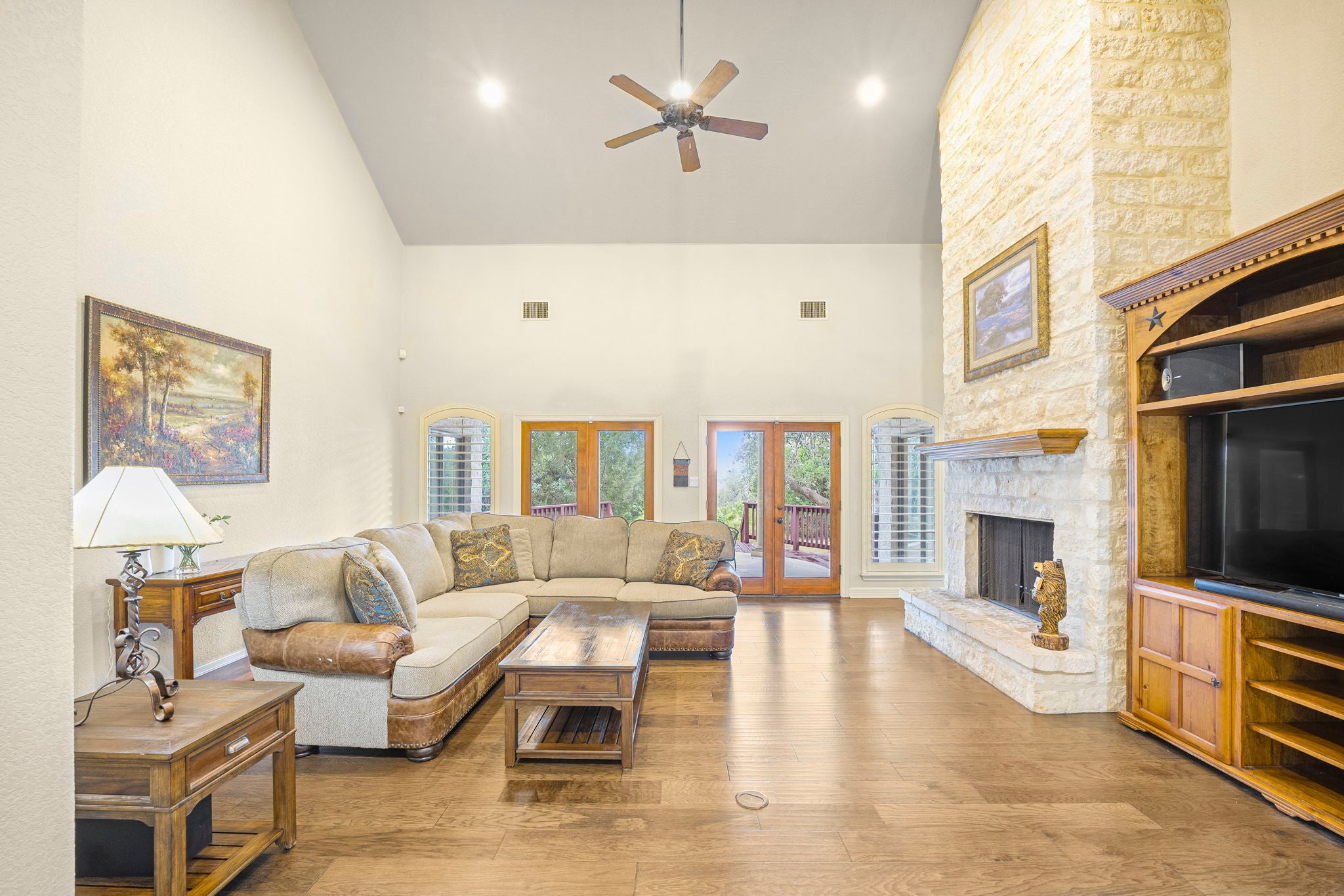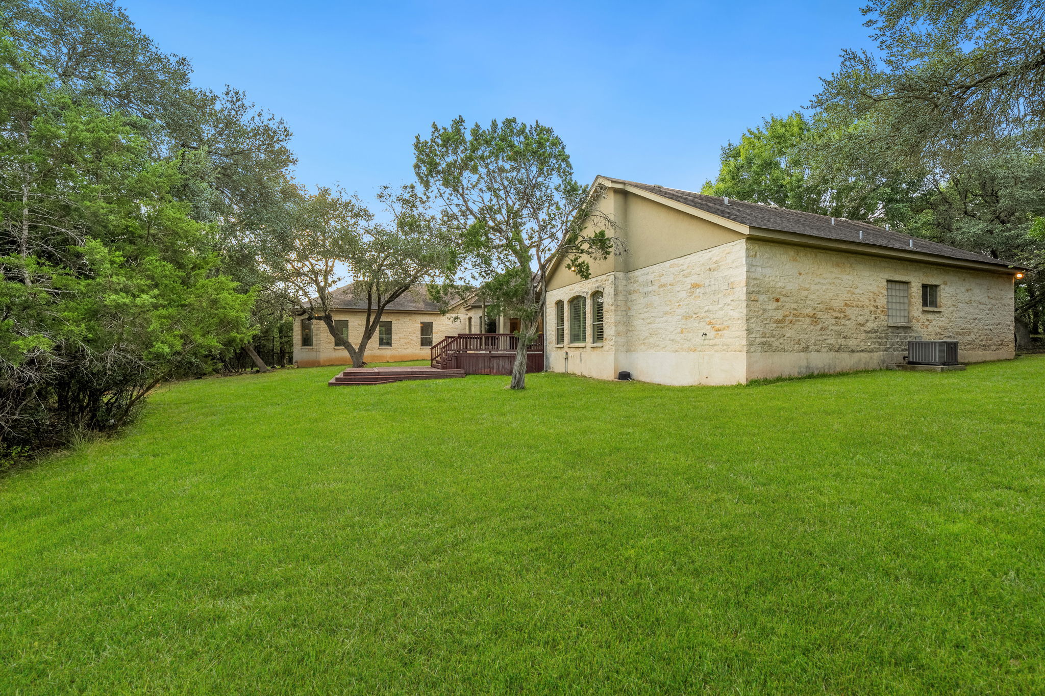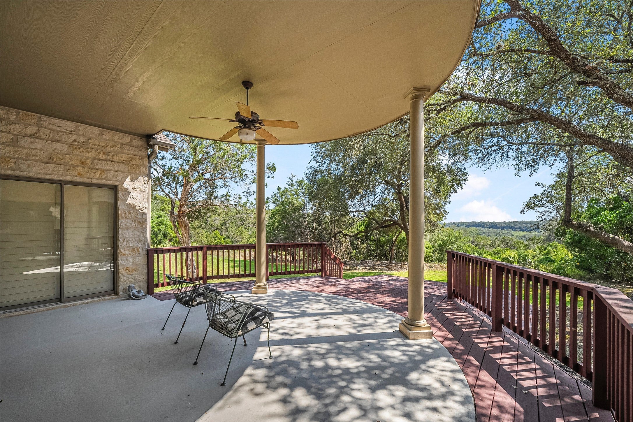 Private Custom Home on 5.15 Acres with Bluff Views located close to Gruene! This stunning custom home is framed by majestic oaks and offers amazing views of the bluff and valley, located near the end of a quiet and private cul-de-sac. Home is not part of HOA and could be used for short term rental.The main home is over 3,700 sq. ft with 3 bedrooms, 3.5 bathrooms, a spacious kitchen just remolded with custom cabinets and an induction cooktop. There are 2 dining areas, 2 living areas, with high ceilings, picturesque windows overlooking the backyard. The oversized theater/game room seamlessly opens to spacious back yard patio with a Keith Zars custom pool featuring a waterfall and sauna-perfect for entertaining guests. Inside, soaring vaulted ceilings, a wood-burning fireplace, customized plantation shutters, and detailed crown molding highlight the craftsmanship throughout. The expansive primary bedroom suite with sitting area and direct access opens to the back porch. Complemented by an oversized spa-like bath with dual vanities and a soaking tub, and separate tile shower. A circle drive provides ample parking for guests, making large gatherings effortless. Enjoy beautiful sunsets and the peace of Hill Country living from this private retreat within minutes to minutes to Gruene historical district. This home has been lovingly cared for by the same family for over two decades and is Zoned to Hoffmann Lane Elementary with easy commute to Austin or San Antonio and close to popular destinations like Schlitterbahn, Guadalupe/Comal Rivers and Canyon Lake.