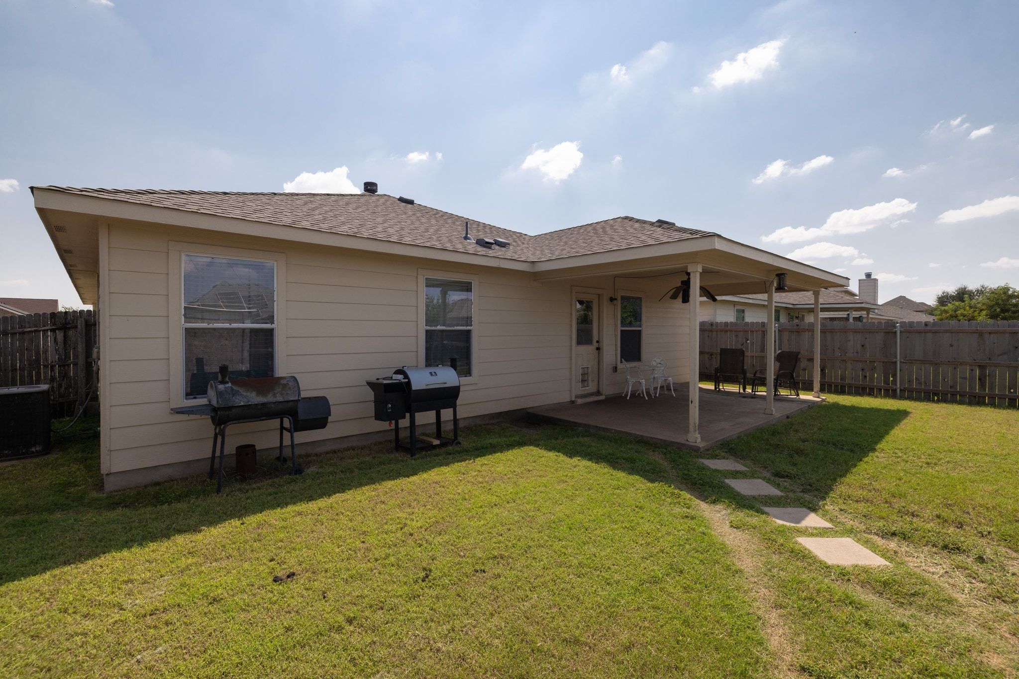 Welcome to this charming single-story home featuring a covered front porch—perfect for relaxing in a rocking chair and enjoying the day. Step inside to a spacious foyer that flows seamlessly into the open family room and kitchen, creating the ideal space for entertaining and everyday living. The private master suite is thoughtfully separated from the secondary bedrooms and boasts a large walk-in closet, plus a spa-like bathroom with a soaking tub and stand-alone shower. Enjoy the outdoors with a covered back patio overlooking a private backyard that backs to a greenbelt, offering added privacy and peaceful views. Additional features include a 2-car garage, plus extra driveway parking. Located in a desirable community with family-friendly amenities, including a community pool and playgrounds, this home offers the perfect blend of comfort, convenience, and lifestyle.